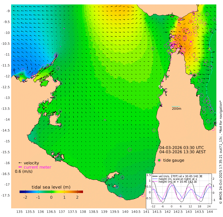 8cm/s -64T +3cm/s rms + 7cm/s -42T. ARA-GOC87 57m 26cm/s 166T +3cm/s rms + 2cm/s -2T. ARA-GOC87 60m 17cm/s -74T +2cm/s rms + 3cm/s 61T. ARA-GOC87 47m 99cm Daru 88cm Bobo Island 7cm Meer Island Barge 22cm Bramble Cay 58cm Unnamed Cay 70cm Pearce Cay 53cm Stephens Island 46cm Merrie England Shoals 86cm Mutacomal Reef 48cm Darnley Island Barge 7cm East Cay 75cm Yorke Island Barge 78cm Rennel Island 84cm Aureed Island 101cm Dungeness Reef 135cm Zagai Island 136cm Yam Island 146cm Dauan Island 140cm Saibai Island 132cm Phipi Reef 149cm Warrior Reef - West 108cm Mabuiag Island Barge 79cm Half Way Island 100cm Coconut Island 98cm Dugong Islet 118cm Poll Island 117cm Kirkcaldie Reef 128cm Suarji Island 121cm Sue Islet 51cm Hawkesbury Island 116cm Alert Patches 124cm Twin Island 55cm Badu Island 139cm St Pauls (Moa Island) 76cm Kubin (Moa Island) 108cm Ince Point 93cm Thursday Island 98cm Nardana Patches 70cm Turtle Head 53cm Round Island 30cm Goods Island 13cm Booby Island 10cm White Rocks Area 18cm Carpentaria 117cm Papou Point 11cm Bampfield Head 13cm Crab Island 25cm Red Wallis Island 58cm Packe Island 107cm Harrington Reef 48cm Herald Camp 50cm Sharp Point 64cm Red Island Point 90cm Possession Island 114cm Alpha Rock 118cm Frederick Point 95cm Wyborn Reef Light 105cm Tetley Island 24cm Triangle Reef 93cm Turtle Head Island 15cm Maclennan Cay -18cm Raine Island 59cm Mcsweeny Reef 43cm Collette Reef 9cm Shadwell Reef 40cm Hannibal Island 20cm Round Point 11cm Vrilya Point 15cm Cape Grenville 14cm Hicks Island 16cm Sir Charles Hardy Island 8cm Harvey Island -8cm Kay Reef -10cm Rocky Island -22cm Chapman Island -15cm Ham Reef -10cm Jubilee Reef -3cm Night Island -15cm Unnamed Reef No. 3 -13cm Morris Island -16cm 1st 3 Mile Opening -10cm Creech Reef -3cm Fife Island -28cm Eden Reef -17cm Stanley Island -17cm Normanby River -137cm Yabooma Island -140cm Hutchison River -135cm Elcho Island -126cm North West Crocodile Island -59cm Cape Wessel -112cm Stevens Island -25cm Guluwuru Island -115cm Hopeful Bay -82cm Auster Point -69cm Two Island Bay -81cm Cadell Strait 15cm Mallison Island -36cm Melville Bay (Gove Harbour) -33cm Truant Island -16cm Cape Arnhem -21cm Cape Grey -19cm Hawk Island -36cm Milner Bay (Groote Eylandt) -26cm Cape Beatrice -17cm West Island -22cm Centre Island -12cm Mornington Island -17cm West Wellesley Islands -43cm Bountiful Island -71cm Albert River Mouth -87cm Sweers Island -54cm Karumba 0cm Nassau River Offshore 16cm Christmas Creek 0cm Archer River 17cm Boyd Point 0cm Weipa (Humbug Point) 6cm Pennefather River 16cm Cullen Point
