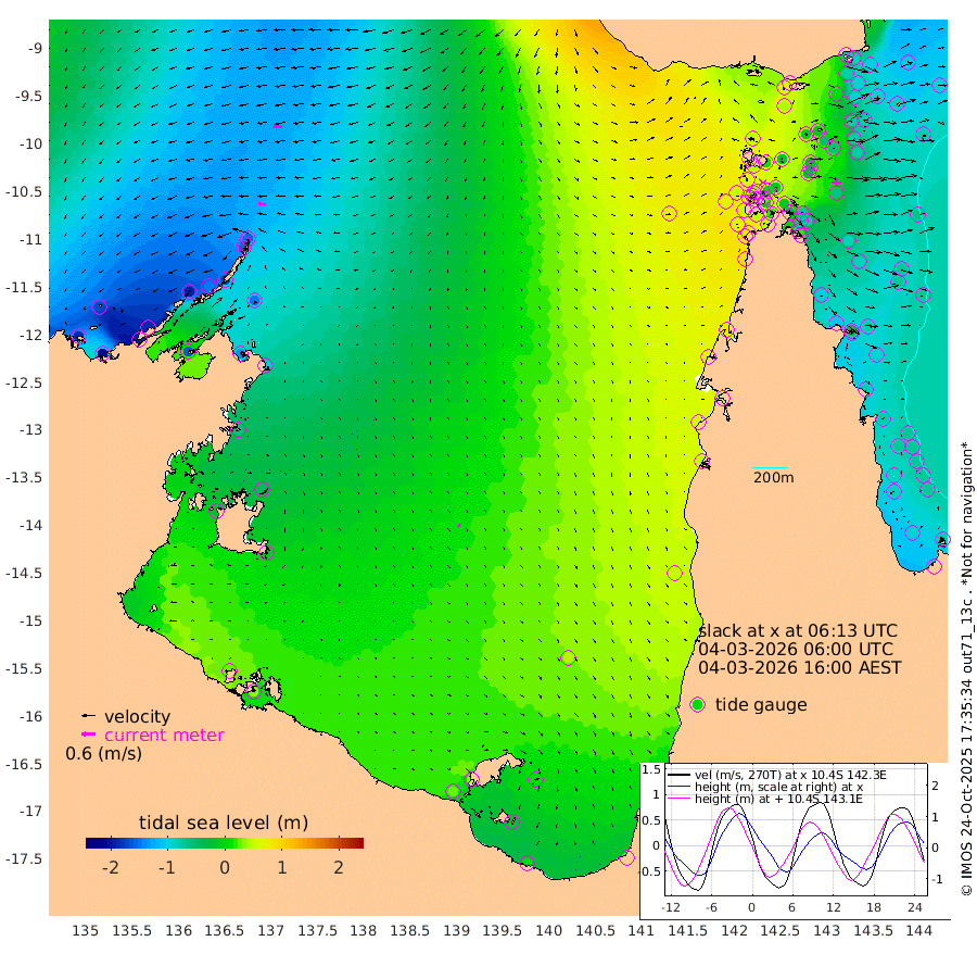 33cm/s -84T +3cm/s rms + 7cm/s -42T. ARA-GOC87 57m 12cm/s 178T +3cm/s rms + 2cm/s -2T. ARA-GOC87 60m 38cm/s -93T +2cm/s rms + 3cm/s 61T. ARA-GOC87 47m -72cm Daru -89cm Bobo Island -80cm Meer Island Barge -100cm Bramble Cay -94cm Unnamed Cay -99cm Pearce Cay -96cm Stephens Island -101cm Merrie England Shoals -82cm Mutacomal Reef -87cm Darnley Island Barge -90cm East Cay -77cm Yorke Island Barge -82cm Rennel Island -81cm Aureed Island -55cm Dungeness Reef -11cm Zagai Island -3cm Yam Island 56cm Dauan Island 55cm Saibai Island 41cm Phipi Reef 0cm Warrior Reef - West 48cm Mabuiag Island Barge -75cm Half Way Island -65cm Coconut Island -65cm Dugong Islet -36cm Poll Island -29cm Kirkcaldie Reef -13cm Suarji Island -21cm Sue Islet 62cm Hawkesbury Island 3cm Alert Patches -4cm Twin Island 55cm Badu Island 12cm St Pauls (Moa Island) 41cm Kubin (Moa Island) 24cm Ince Point 35cm Thursday Island 33cm Nardana Patches 40cm Turtle Head 44cm Round Island 51cm Goods Island 72cm Booby Island 48cm White Rocks Area 80cm Carpentaria 8cm Papou Point 48cm Bampfield Head 76cm Crab Island 68cm Red Wallis Island 45cm Packe Island -75cm Harrington Reef 74cm Herald Camp 17cm Sharp Point 45cm Red Island Point 16cm Possession Island -14cm Alpha Rock -34cm Frederick Point -82cm Wyborn Reef Light -70cm Tetley Island -65cm Triangle Reef -83cm Turtle Head Island -72cm Maclennan Cay -68cm Raine Island -88cm Mcsweeny Reef -85cm Collette Reef -71cm Shadwell Reef -99cm Hannibal Island -106cm Round Point 87cm Vrilya Point -89cm Cape Grenville -86cm Hicks Island -82cm Sir Charles Hardy Island -25cm Harvey Island -91cm Kay Reef -78cm Rocky Island -80cm Chapman Island -69cm Ham Reef -73cm Jubilee Reef -68cm Night Island -73cm Unnamed Reef No. 3 -84cm Morris Island -71cm 1st 3 Mile Opening -73cm Creech Reef -86cm Fife Island -97cm Eden Reef -82cm Stanley Island -100cm Normanby River -187cm Yabooma Island -222cm Hutchison River -186cm Elcho Island -170cm North West Crocodile Island -153cm Cape Wessel -189cm Stevens Island -147cm Guluwuru Island -170cm Hopeful Bay -159cm Auster Point -150cm Two Island Bay -194cm Cadell Strait -164cm Mallison Island -140cm Melville Bay (Gove Harbour) -148cm Truant Island -95cm Cape Arnhem -67cm Cape Grey -51cm Hawk Island -26cm Milner Bay (Groote Eylandt) -10cm Cape Beatrice 29cm West Island 35cm Centre Island 30cm Mornington Island 25cm West Wellesley Islands 9cm Bountiful Island 10cm Albert River Mouth -8cm Sweers Island 27cm Karumba 39cm Nassau River Offshore 48cm Christmas Creek 48cm Archer River 53cm Boyd Point 51cm Weipa (Humbug Point) 64cm Pennefather River 79cm Cullen Point