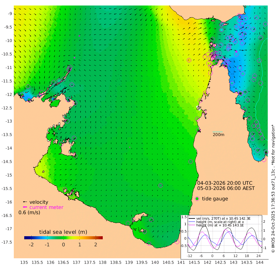 19cm/s -96T +3cm/s rms + 7cm/s -42T. ARA-GOC87 57m 12cm/s 18T +3cm/s rms + 2cm/s -2T. ARA-GOC87 60m 18cm/s -122T +2cm/s rms + 3cm/s 61T. ARA-GOC87 47m -125cm Daru -130cm Bobo Island -55cm Meer Island Barge -83cm Bramble Cay -100cm Unnamed Cay -123cm Pearce Cay -102cm Stephens Island -100cm Merrie England Shoals -116cm Mutacomal Reef -91cm Darnley Island Barge -67cm East Cay -105cm Yorke Island Barge -111cm Rennel Island -118cm Aureed Island -113cm Dungeness Reef -107cm Zagai Island -99cm Yam Island -77cm Dauan Island -68cm Saibai Island -95cm Phipi Reef -120cm Warrior Reef - West -33cm Mabuiag Island Barge -106cm Half Way Island -119cm Coconut Island -109cm Dugong Islet -108cm Poll Island -106cm Kirkcaldie Reef -92cm Suarji Island -97cm Sue Islet 34cm Hawkesbury Island -72cm Alert Patches -83cm Twin Island 14cm Badu Island -82cm St Pauls (Moa Island) -3cm Kubin (Moa Island) -47cm Ince Point -25cm Thursday Island -31cm Nardana Patches -6cm Turtle Head 19cm Round Island 41cm Goods Island 79cm Booby Island 65cm White Rocks Area 99cm Carpentaria -71cm Papou Point 84cm Bampfield Head 58cm Crab Island 62cm Red Wallis Island 11cm Packe Island -124cm Harrington Reef 51cm Herald Camp -27cm Sharp Point -14cm Red Island Point -39cm Possession Island -75cm Alpha Rock -103cm Frederick Point -116cm Wyborn Reef Light -115cm Tetley Island -59cm Triangle Reef -115cm Turtle Head Island -53cm Maclennan Cay -32cm Raine Island -99cm Mcsweeny Reef -88cm Collette Reef -53cm Shadwell Reef -94cm Hannibal Island -86cm Round Point 69cm Vrilya Point -66cm Cape Grenville -67cm Hicks Island -56cm Sir Charles Hardy Island -22cm Harvey Island -50cm Kay Reef -42cm Rocky Island -36cm Chapman Island -31cm Ham Reef -38cm Jubilee Reef -42cm Night Island -36cm Unnamed Reef No. 3 -43cm Morris Island -27cm 1st 3 Mile Opening -38cm Creech Reef -59cm Fife Island -41cm Eden Reef -37cm Stanley Island -51cm Normanby River -5cm Yabooma Island -32cm Hutchison River -12cm Elcho Island -12cm North West Crocodile Island -33cm Cape Wessel -30cm Stevens Island -68cm Guluwuru Island -17cm Hopeful Bay -25cm Auster Point -28cm Two Island Bay -76cm Cadell Strait -129cm Mallison Island -57cm Melville Bay (Gove Harbour) -58cm Truant Island -45cm Cape Arnhem -28cm Cape Grey -29cm Hawk Island 3cm Milner Bay (Groote Eylandt) -3cm Cape Beatrice 18cm West Island 21cm Centre Island -38cm Mornington Island -28cm West Wellesley Islands -26cm Bountiful Island -37cm Albert River Mouth -33cm Sweers Island -48cm Karumba -39cm Nassau River Offshore -26cm Christmas Creek 10cm Archer River 26cm Boyd Point 33cm Weipa (Humbug Point) 35cm Pennefather River 61cm Cullen Point
