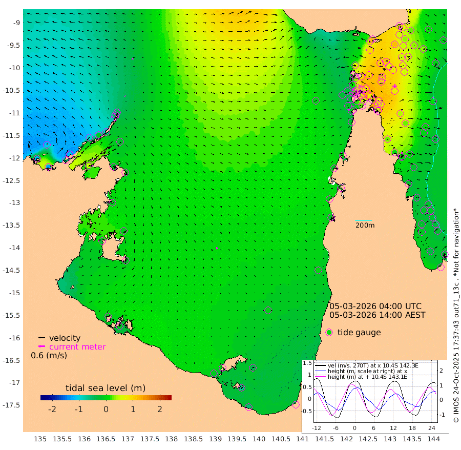 8cm/s -30T +3cm/s rms + 7cm/s -42T. ARA-GOC87 57m 20cm/s 164T +3cm/s rms + 2cm/s -2T. ARA-GOC87 60m 14cm/s -52T +2cm/s rms + 3cm/s 61T. ARA-GOC87 47m 71cm Daru 65cm Bobo Island 0cm Meer Island Barge 9cm Bramble Cay 36cm Unnamed Cay 47cm Pearce Cay 34cm Stephens Island 25cm Merrie England Shoals 58cm Mutacomal Reef 33cm Darnley Island Barge -1cm East Cay 55cm Yorke Island Barge 52cm Rennel Island 62cm Aureed Island 71cm Dungeness Reef 105cm Zagai Island 103cm Yam Island 112cm Dauan Island 112cm Saibai Island 95cm Phipi Reef 116cm Warrior Reef - West 73cm Mabuiag Island Barge 54cm Half Way Island 71cm Coconut Island 69cm Dugong Islet 86cm Poll Island 82cm Kirkcaldie Reef 91cm Suarji Island 90cm Sue Islet 9cm Hawkesbury Island 76cm Alert Patches 85cm Twin Island 13cm Badu Island 99cm St Pauls (Moa Island) 37cm Kubin (Moa Island) 69cm Ince Point 53cm Thursday Island 58cm Nardana Patches 30cm Turtle Head 18cm Round Island -9cm Goods Island -26cm Booby Island -28cm White Rocks Area -7cm Carpentaria 82cm Papou Point -24cm Bampfield Head -20cm Crab Island -12cm Red Wallis Island 20cm Packe Island 75cm Harrington Reef 13cm Herald Camp 39cm Sharp Point 27cm Red Island Point 54cm Possession Island 82cm Alpha Rock 83cm Frederick Point 67cm Wyborn Reef Light 75cm Tetley Island 14cm Triangle Reef 61cm Turtle Head Island 5cm Maclennan Cay -23cm Raine Island 39cm Mcsweeny Reef 26cm Collette Reef 0cm Shadwell Reef 23cm Hannibal Island 6cm Round Point -19cm Vrilya Point 3cm Cape Grenville 3cm Hicks Island 7cm Sir Charles Hardy Island 4cm Harvey Island -15cm Kay Reef -16cm Rocky Island -25cm Chapman Island -18cm Ham Reef -15cm Jubilee Reef -9cm Night Island -20cm Unnamed Reef No. 3 -19cm Morris Island -23cm 1st 3 Mile Opening -16cm Creech Reef -9cm Fife Island -31cm Eden Reef -23cm Stanley Island -22cm Normanby River -124cm Yabooma Island -126cm Hutchison River -119cm Elcho Island -112cm North West Crocodile Island -41cm Cape Wessel -96cm Stevens Island -8cm Guluwuru Island -96cm Hopeful Bay -67cm Auster Point -51cm Two Island Bay -64cm Cadell Strait 53cm Mallison Island -21cm Melville Bay (Gove Harbour) -18cm Truant Island -4cm Cape Arnhem -13cm Cape Grey -9cm Hawk Island -24cm Milner Bay (Groote Eylandt) -17cm Cape Beatrice -10cm West Island -13cm Centre Island -7cm Mornington Island -12cm West Wellesley Islands -38cm Bountiful Island -58cm Albert River Mouth -69cm Sweers Island -45cm Karumba -6cm Nassau River Offshore 2cm Christmas Creek -17cm Archer River -2cm Boyd Point -20cm Weipa (Humbug Point) -16cm Pennefather River -7cm Cullen Point