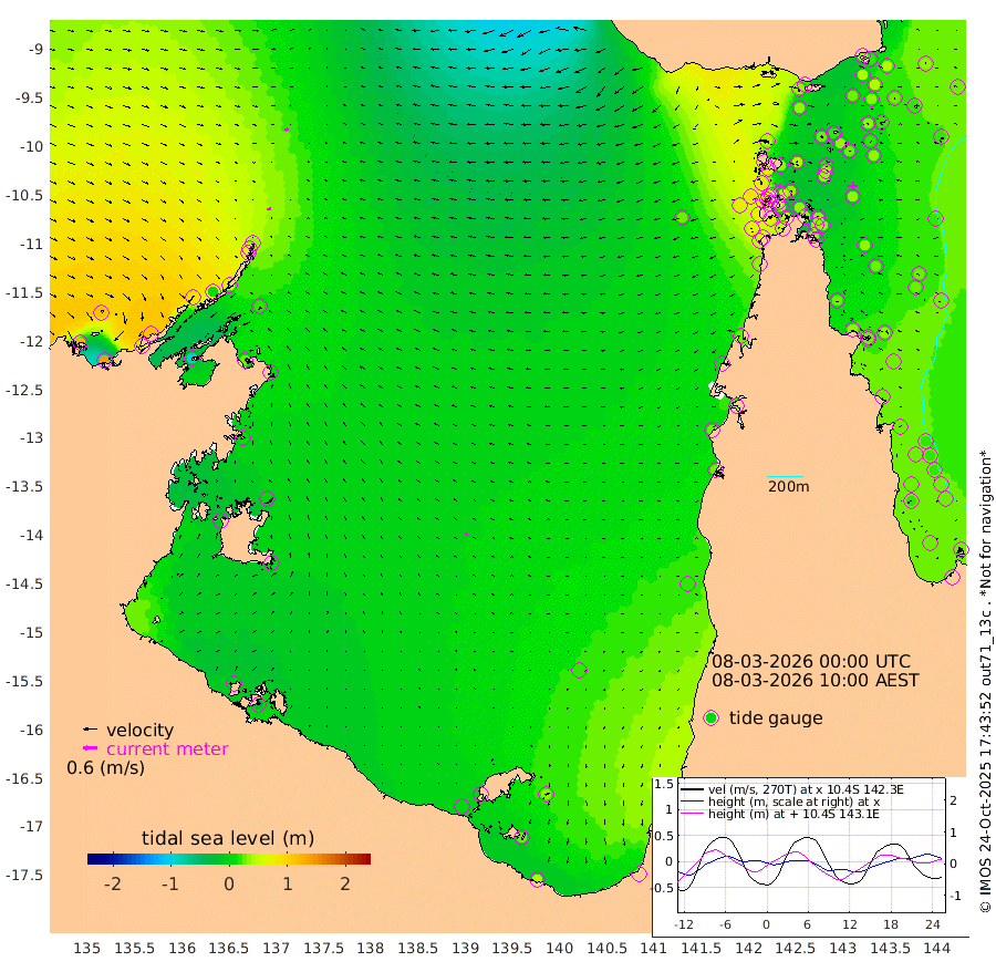 15cm/s -106T +3cm/s rms + 7cm/s -42T. ARA-GOC87 57m 9cm/s -121T +3cm/s rms + 2cm/s -2T. ARA-GOC87 60m 14cm/s -116T +2cm/s rms + 3cm/s 61T. ARA-GOC87 47m 30cm Daru 21cm Bobo Island 20cm Meer Island Barge 32cm Bramble Cay 38cm Unnamed Cay 30cm Pearce Cay 30cm Stephens Island 38cm Merrie England Shoals 39cm Mutacomal Reef 19cm Darnley Island Barge 25cm East Cay 20cm Yorke Island Barge 37cm Rennel Island 19cm Aureed Island 35cm Dungeness Reef 16cm Zagai Island 30cm Yam Island 33cm Dauan Island 15cm Saibai Island 37cm Phipi Reef 24cm Warrior Reef - West 39cm Mabuiag Island Barge 30cm Half Way Island 27cm Coconut Island 34cm Dugong Islet 32cm Poll Island 32cm Kirkcaldie Reef 40cm Suarji Island 21cm Sue Islet 81cm Hawkesbury Island 44cm Alert Patches 37cm Twin Island 76cm Badu Island 36cm St Pauls (Moa Island) 67cm Kubin (Moa Island) 47cm Ince Point 52cm Thursday Island 51cm Nardana Patches 68cm Turtle Head 66cm Round Island 83cm Goods Island 77cm Booby Island 89cm White Rocks Area 25cm Carpentaria 31cm Papou Point 75cm Bampfield Head 51cm Crab Island 71cm Red Wallis Island 69cm Packe Island 32cm Harrington Reef 69cm Herald Camp 0cm Sharp Point 50cm Red Island Point 41cm Possession Island 32cm Alpha Rock 33cm Frederick Point 36cm Wyborn Reef Light 34cm Tetley Island 20cm Triangle Reef 36cm Turtle Head Island 25cm Maclennan Cay 24cm Raine Island 30cm Mcsweeny Reef 27cm Collette Reef 23cm Shadwell Reef 29cm Hannibal Island 35cm Round Point 31cm Vrilya Point 29cm Cape Grenville 28cm Hicks Island 31cm Sir Charles Hardy Island 7cm Harvey Island 29cm Kay Reef 27cm Rocky Island 24cm Chapman Island 20cm Ham Reef 23cm Jubilee Reef 20cm Night Island 21cm Unnamed Reef No. 3 29cm Morris Island 30cm 1st 3 Mile Opening 23cm Creech Reef 22cm Fife Island 28cm Eden Reef 27cm Stanley Island 30cm Normanby River 125cm Yabooma Island 137cm Hutchison River 115cm Elcho Island 115cm North West Crocodile Island 36cm Cape Wessel 86cm Stevens Island 15cm Guluwuru Island 77cm Hopeful Bay 57cm Auster Point 51cm Two Island Bay 69cm Cadell Strait -99cm Mallison Island 25cm Melville Bay (Gove Harbour) 21cm Truant Island 5cm Cape Arnhem 8cm Cape Grey 2cm Hawk Island -6cm Milner Bay (Groote Eylandt) 1cm Cape Beatrice -14cm West Island -23cm Centre Island -2cm Mornington Island 6cm West Wellesley Islands 37cm Bountiful Island 41cm Albert River Mouth 24cm Sweers Island 32cm Karumba 16cm Nassau River Offshore 19cm Christmas Creek 26cm Archer River 26cm Boyd Point 43cm Weipa (Humbug Point) 13cm Pennefather River 30cm Cullen Point