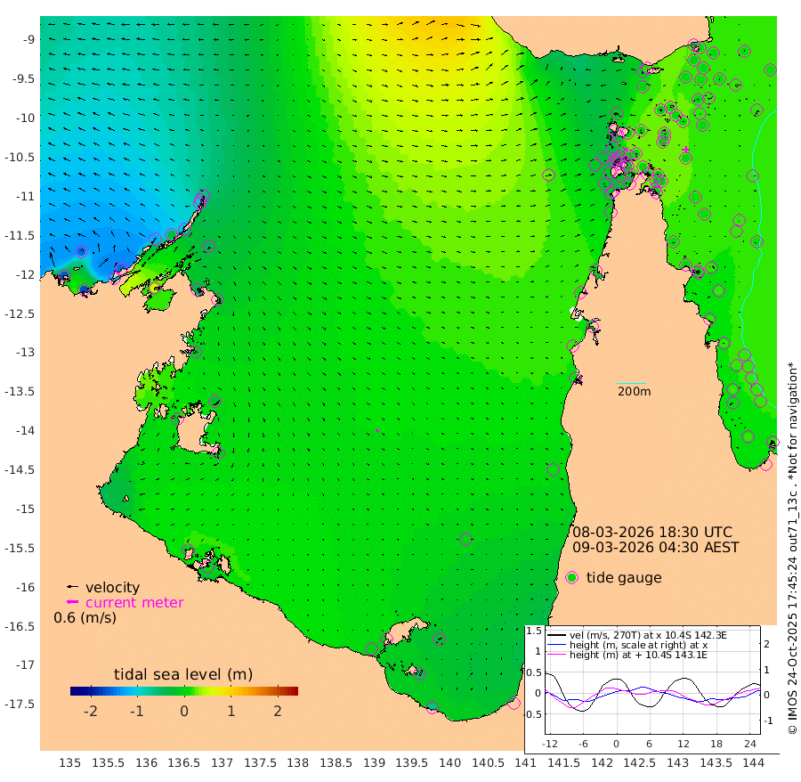 3cm/s 95T +3cm/s rms + 7cm/s -42T. ARA-GOC87 57m 17cm/s 141T +3cm/s rms + 2cm/s -2T. ARA-GOC87 60m 3cm/s -108T +2cm/s rms + 3cm/s 61T. ARA-GOC87 47m 4cm Daru 12cm Bobo Island 19cm Meer Island Barge 8cm Bramble Cay 4cm Unnamed Cay 10cm Pearce Cay 10cm Stephens Island 4cm Merrie England Shoals -1cm Mutacomal Reef 22cm Darnley Island Barge 15cm East Cay 19cm Yorke Island Barge 1cm Rennel Island 20cm Aureed Island 4cm Dungeness Reef 10cm Zagai Island -3cm Yam Island -3cm Dauan Island 16cm Saibai Island -5cm Phipi Reef 6cm Warrior Reef - West -4cm Mabuiag Island Barge 5cm Half Way Island 9cm Coconut Island 6cm Dugong Islet 1cm Poll Island 1cm Kirkcaldie Reef 5cm Suarji Island 14cm Sue Islet -31cm Hawkesbury Island 1cm Alert Patches 1cm Twin Island -22cm Badu Island -1cm St Pauls (Moa Island) -25cm Kubin (Moa Island) -6cm Ince Point -7cm Thursday Island -8cm Nardana Patches -16cm Turtle Head -28cm Round Island -22cm Goods Island -14cm Booby Island -25cm White Rocks Area 29cm Carpentaria -4cm Papou Point -13cm Bampfield Head -13cm Crab Island -16cm Red Wallis Island -21cm Packe Island 7cm Harrington Reef -25cm Herald Camp 4cm Sharp Point -11cm Red Island Point -7cm Possession Island 0cm Alpha Rock 3cm Frederick Point 0cm Wyborn Reef Light -1cm Tetley Island 17cm Triangle Reef 0cm Turtle Head Island 16cm Maclennan Cay 14cm Raine Island 11cm Mcsweeny Reef 14cm Collette Reef 16cm Shadwell Reef 14cm Hannibal Island 6cm Round Point 4cm Vrilya Point 13cm Cape Grenville 11cm Hicks Island 20cm Sir Charles Hardy Island 4cm Harvey Island 17cm Kay Reef 16cm Rocky Island 20cm Chapman Island 22cm Ham Reef 19cm Jubilee Reef 15cm Night Island 22cm Unnamed Reef No. 3 15cm Morris Island 17cm 1st 3 Mile Opening 20cm Creech Reef 15cm Fife Island 21cm Eden Reef 17cm Stanley Island 13cm Normanby River -159cm Yabooma Island -169cm Hutchison River -150cm Elcho Island -153cm North West Crocodile Island -61cm Cape Wessel -127cm Stevens Island -29cm Guluwuru Island -112cm Hopeful Bay -85cm Auster Point -91cm Two Island Bay -114cm Cadell Strait 74cm Mallison Island -40cm Melville Bay (Gove Harbour) -38cm Truant Island -16cm Cape Arnhem -12cm Cape Grey -16cm Hawk Island -12cm Milner Bay (Groote Eylandt) -14cm Cape Beatrice 6cm West Island 10cm Centre Island -6cm Mornington Island -4cm West Wellesley Islands -22cm Bountiful Island -64cm Albert River Mouth -51cm Sweers Island -59cm Karumba -3cm Nassau River Offshore 10cm Christmas Creek 12cm Archer River 16cm Boyd Point 5cm Weipa (Humbug Point) 12cm Pennefather River 5cm Cullen Point