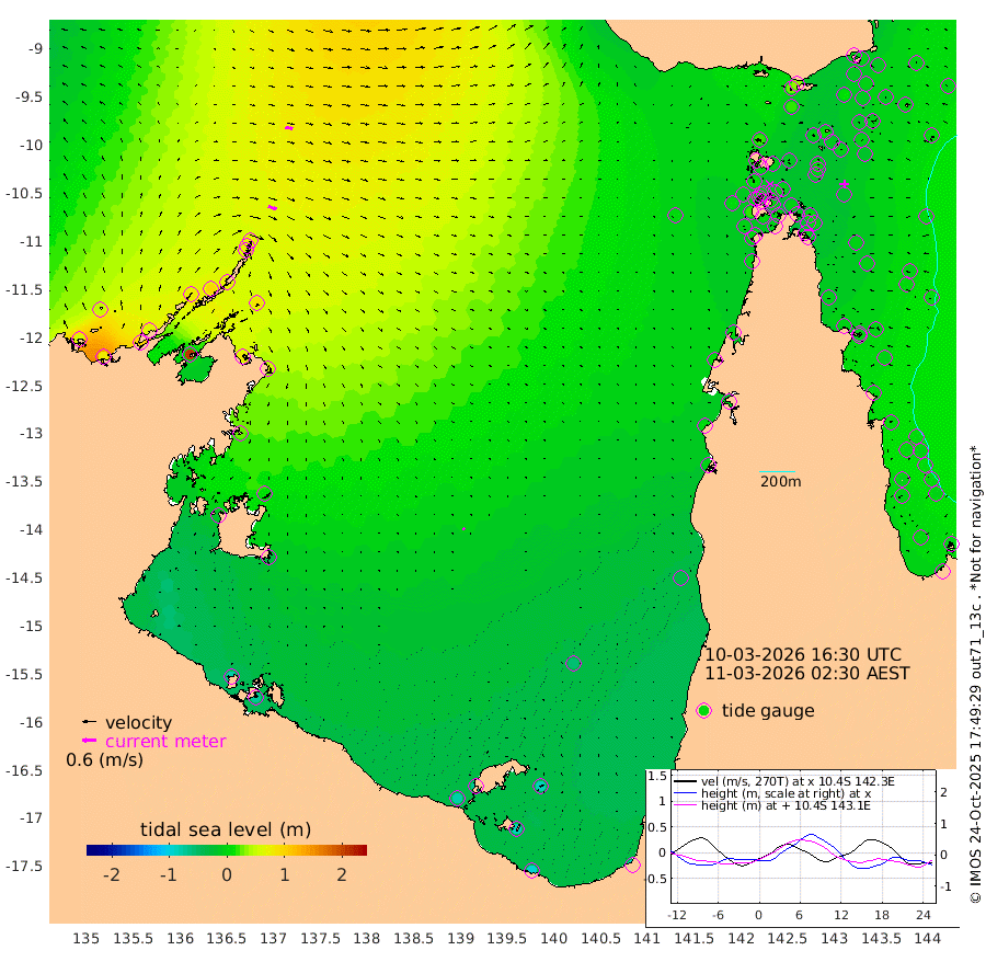 37cm/s 109T +3cm/s rms + 7cm/s -42T. ARA-GOC87 57m 9cm/s 128T +3cm/s rms + 2cm/s -2T. ARA-GOC87 60m 33cm/s 101T +2cm/s rms + 3cm/s 61T. ARA-GOC87 47m -2cm Daru -2cm Bobo Island 4cm Meer Island Barge -1cm Bramble Cay -5cm Unnamed Cay -8cm Pearce Cay -9cm Stephens Island -8cm Merrie England Shoals -9cm Mutacomal Reef 1cm Darnley Island Barge -4cm East Cay 0cm Yorke Island Barge -14cm Rennel Island -7cm Aureed Island -9cm Dungeness Reef 13cm Zagai Island -1cm Yam Island 30cm Dauan Island 34cm Saibai Island 22cm Phipi Reef 11cm Warrior Reef - West 17cm Mabuiag Island Barge -16cm Half Way Island -3cm Coconut Island -19cm Dugong Islet -7cm Poll Island -13cm Kirkcaldie Reef -12cm Suarji Island 2cm Sue Islet 11cm Hawkesbury Island -6cm Alert Patches -7cm Twin Island 22cm Badu Island -2cm St Pauls (Moa Island) 7cm Kubin (Moa Island) -2cm Ince Point -2cm Thursday Island -1cm Nardana Patches 0cm Turtle Head 13cm Round Island 5cm Goods Island 4cm Booby Island -9cm White Rocks Area 5cm Carpentaria -2cm Papou Point 22cm Bampfield Head 6cm Crab Island -3cm Red Wallis Island 1cm Packe Island -22cm Harrington Reef 7cm Herald Camp -2cm Sharp Point -4cm Red Island Point 2cm Possession Island -4cm Alpha Rock -9cm Frederick Point 1cm Wyborn Reef Light 2cm Tetley Island 6cm Triangle Reef -2cm Turtle Head Island -5cm Maclennan Cay 4cm Raine Island -6cm Mcsweeny Reef -1cm Collette Reef 6cm Shadwell Reef -1cm Hannibal Island -3cm Round Point 6cm Vrilya Point -7cm Cape Grenville -3cm Hicks Island 0cm Sir Charles Hardy Island -3cm Harvey Island -3cm Kay Reef 1cm Rocky Island 6cm Chapman Island 4cm Ham Reef 4cm Jubilee Reef -1cm Night Island 1cm Unnamed Reef No. 3 -1cm Morris Island 3cm 1st 3 Mile Opening -1cm Creech Reef -3cm Fife Island 3cm Eden Reef -2cm Stanley Island -9cm Normanby River 60cm Yabooma Island 80cm Hutchison River 64cm Elcho Island 52cm North West Crocodile Island 70cm Cape Wessel 80cm Stevens Island 96cm Guluwuru Island 72cm Hopeful Bay 70cm Auster Point 72cm Two Island Bay 101cm Cadell Strait 209cm Mallison Island 81cm Melville Bay (Gove Harbour) 90cm Truant Island 61cm Cape Arnhem 27cm Cape Grey 15cm Hawk Island -20cm Milner Bay (Groote Eylandt) -37cm Cape Beatrice -75cm West Island -72cm Centre Island -71cm Mornington Island -82cm West Wellesley Islands -83cm Bountiful Island -94cm Albert River Mouth -85cm Sweers Island -92cm Karumba -57cm Nassau River Offshore -33cm Christmas Creek -7cm Archer River 1cm Boyd Point -2cm Weipa (Humbug Point) 8cm Pennefather River 5cm Cullen Point