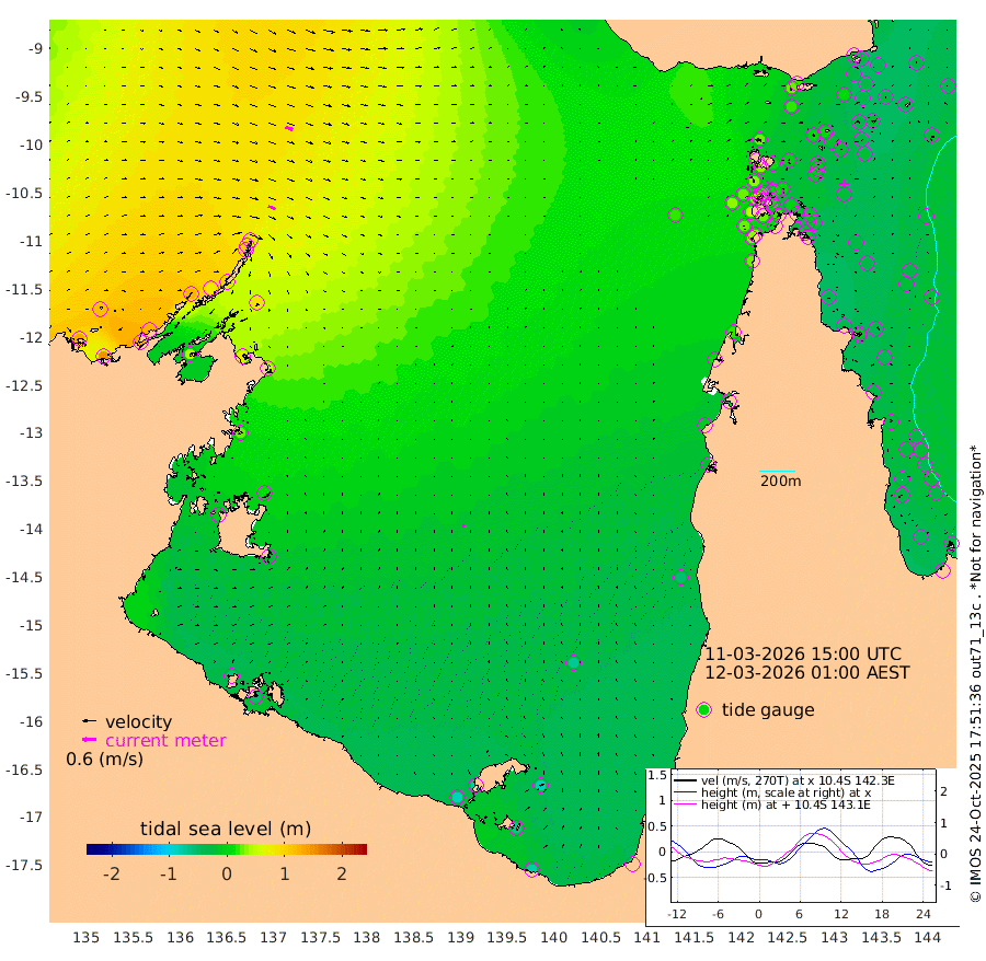 34cm/s 114T +3cm/s rms + 7cm/s -42T. ARA-GOC87 57m 12cm/s 21T +3cm/s rms + 2cm/s -2T. ARA-GOC87 60m 34cm/s 107T +2cm/s rms + 3cm/s 61T. ARA-GOC87 47m -22cm Daru -26cm Bobo Island -29cm Meer Island Barge -35cm Bramble Cay -33cm Unnamed Cay -31cm Pearce Cay -34cm Stephens Island -40cm Merrie England Shoals -33cm Mutacomal Reef -34cm Darnley Island Barge -38cm East Cay -28cm Yorke Island Barge -31cm Rennel Island -31cm Aureed Island -18cm Dungeness Reef 7cm Zagai Island 3cm Yam Island 30cm Dauan Island 17cm Saibai Island 21cm Phipi Reef 2cm Warrior Reef - West 25cm Mabuiag Island Barge -28cm Half Way Island -18cm Coconut Island -29cm Dugong Islet -8cm Poll Island -14cm Kirkcaldie Reef -4cm Suarji Island -12cm Sue Islet 36cm Hawkesbury Island 1cm Alert Patches 1cm Twin Island 44cm Badu Island 13cm St Pauls (Moa Island) 36cm Kubin (Moa Island) 13cm Ince Point 19cm Thursday Island 18cm Nardana Patches 22cm Turtle Head 40cm Round Island 32cm Goods Island 36cm Booby Island 28cm White Rocks Area 21cm Carpentaria 13cm Papou Point 49cm Bampfield Head 35cm Crab Island 27cm Red Wallis Island 25cm Packe Island -29cm Harrington Reef 36cm Herald Camp -1cm Sharp Point 13cm Red Island Point 19cm Possession Island -6cm Alpha Rock -10cm Frederick Point -18cm Wyborn Reef Light -14cm Tetley Island -25cm Triangle Reef -8cm Turtle Head Island -32cm Maclennan Cay -26cm Raine Island -32cm Mcsweeny Reef -35cm Collette Reef -30cm Shadwell Reef -39cm Hannibal Island -37cm Round Point 27cm Vrilya Point -41cm Cape Grenville -32cm Hicks Island -40cm Sir Charles Hardy Island -11cm Harvey Island -44cm Kay Reef -34cm Rocky Island -37cm Chapman Island -36cm Ham Reef -32cm Jubilee Reef -30cm Night Island -39cm Unnamed Reef No. 3 -35cm Morris Island -25cm 1st 3 Mile Opening -34cm Creech Reef -37cm Fife Island -40cm Eden Reef -40cm Stanley Island -45cm Normanby River 129cm Yabooma Island 148cm Hutchison River 127cm Elcho Island 119cm North West Crocodile Island 85cm Cape Wessel 121cm Stevens Island 80cm Guluwuru Island 102cm Hopeful Bay 100cm Auster Point 109cm Two Island Bay 134cm Cadell Strait 43cm Mallison Island 76cm Melville Bay (Gove Harbour) 85cm Truant Island 52cm Cape Arnhem 24cm Cape Grey 11cm Hawk Island -7cm Milner Bay (Groote Eylandt) -26cm Cape Beatrice -61cm West Island -58cm Centre Island -78cm Mornington Island -88cm West Wellesley Islands -89cm Bountiful Island -76cm Albert River Mouth -74cm Sweers Island -79cm Karumba -72cm Nassau River Offshore -55cm Christmas Creek -25cm Archer River -9cm Boyd Point -8cm Weipa (Humbug Point) 11cm Pennefather River 18cm Cullen Point
