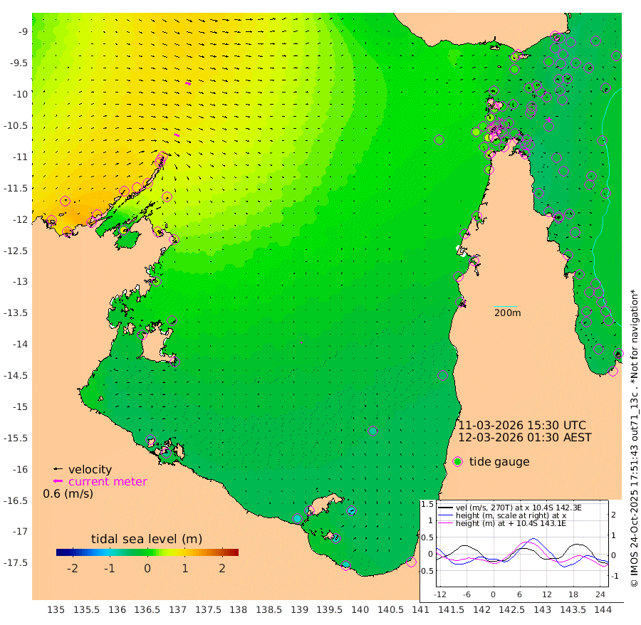 36cm/s 113T +3cm/s rms + 7cm/s -42T. ARA-GOC87 57m 8cm/s 36T +3cm/s rms + 2cm/s -2T. ARA-GOC87 60m 35cm/s 106T +2cm/s rms + 3cm/s 61T. ARA-GOC87 47m -23cm Daru -27cm Bobo Island -23cm Meer Island Barge -32cm Bramble Cay -32cm Unnamed Cay -32cm Pearce Cay -33cm Stephens Island -38cm Merrie England Shoals -34cm Mutacomal Reef -30cm Darnley Island Barge -34cm East Cay -27cm Yorke Island Barge -33cm Rennel Island -32cm Aureed Island -21cm Dungeness Reef 5cm Zagai Island -2cm Yam Island 30cm Dauan Island 21cm Saibai Island 20cm Phipi Reef 0cm Warrior Reef - West 22cm Mabuiag Island Barge -31cm Half Way Island -21cm Coconut Island -33cm Dugong Islet -14cm Poll Island -19cm Kirkcaldie Reef -11cm Suarji Island -13cm Sue Islet 33cm Hawkesbury Island -5cm Alert Patches -5cm Twin Island 41cm Badu Island 5cm St Pauls (Moa Island) 30cm Kubin (Moa Island) 7cm Ince Point 13cm Thursday Island 12cm Nardana Patches 17cm Turtle Head 35cm Round Island 28cm Goods Island 32cm Booby Island 21cm White Rocks Area 20cm Carpentaria 6cm Papou Point 46cm Bampfield Head 31cm Crab Island 22cm Red Wallis Island 20cm Packe Island -35cm Harrington Reef 32cm Herald Camp -3cm Sharp Point 7cm Red Island Point 13cm Possession Island -10cm Alpha Rock -16cm Frederick Point -20cm Wyborn Reef Light -16cm Tetley Island -21cm Triangle Reef -12cm Turtle Head Island -29cm Maclennan Cay -20cm Raine Island -32cm Mcsweeny Reef -32cm Collette Reef -24cm Shadwell Reef -35cm Hannibal Island -34cm Round Point 25cm Vrilya Point -37cm Cape Grenville -28cm Hicks Island -33cm Sir Charles Hardy Island -10cm Harvey Island -38cm Kay Reef -28cm Rocky Island -30cm Chapman Island -28cm Ham Reef -25cm Jubilee Reef -25cm Night Island -32cm Unnamed Reef No. 3 -29cm Morris Island -19cm 1st 3 Mile Opening -28cm Creech Reef -33cm Fife Island -32cm Eden Reef -33cm Stanley Island -40cm Normanby River 119cm Yabooma Island 139cm Hutchison River 118cm Elcho Island 109cm North West Crocodile Island 85cm Cape Wessel 116cm Stevens Island 88cm Guluwuru Island 99cm Hopeful Bay 97cm Auster Point 106cm Two Island Bay 132cm Cadell Strait 89cm Mallison Island 81cm Melville Bay (Gove Harbour) 90cm Truant Island 56cm Cape Arnhem 25cm Cape Grey 11cm Hawk Island -11cm Milner Bay (Groote Eylandt) -31cm Cape Beatrice -68cm West Island -66cm Centre Island -82cm Mornington Island -92cm West Wellesley Islands -93cm Bountiful Island -85cm Albert River Mouth -83cm Sweers Island -87cm Karumba -72cm Nassau River Offshore -52cm Christmas Creek -21cm Archer River -5cm Boyd Point -5cm Weipa (Humbug Point) 12cm Pennefather River 17cm Cullen Point