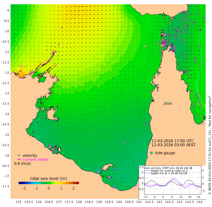 35cm/s 112T +3cm/s rms + 7cm/s -42T. ARA-GOC87 57m 10cm/s 128T +3cm/s rms + 2cm/s -2T. ARA-GOC87 60m 30cm/s 105T +2cm/s rms + 3cm/s 61T. ARA-GOC87 47m -18cm Daru -20cm Bobo Island 3cm Meer Island Barge -7cm Bramble Cay -15cm Unnamed Cay -23cm Pearce Cay -18cm Stephens Island -17cm Merrie England Shoals -23cm Mutacomal Reef -7cm Darnley Island Barge -7cm East Cay -12cm Yorke Island Barge -26cm Rennel Island -23cm Aureed Island -24cm Dungeness Reef -6cm Zagai Island -16cm Yam Island 14cm Dauan Island 17cm Saibai Island 1cm Phipi Reef -10cm Warrior Reef - West 6cm Mabuiag Island Barge -26cm Half Way Island -21cm Coconut Island -30cm Dugong Islet -23cm Poll Island -28cm Kirkcaldie Reef -31cm Suarji Island -13cm Sue Islet 17cm Hawkesbury Island -20cm Alert Patches -21cm Twin Island 21cm Badu Island -17cm St Pauls (Moa Island) 8cm Kubin (Moa Island) -11cm Ince Point -7cm Thursday Island -7cm Nardana Patches -1cm Turtle Head 16cm Round Island 12cm Goods Island 19cm Booby Island 3cm White Rocks Area 24cm Carpentaria -15cm Papou Point 35cm Bampfield Head 17cm Crab Island 9cm Red Wallis Island 5cm Packe Island -38cm Harrington Reef 18cm Herald Camp -8cm Sharp Point -9cm Red Island Point -6cm Possession Island -17cm Alpha Rock -25cm Frederick Point -15cm Wyborn Reef Light -15cm Tetley Island 1cm Triangle Reef -15cm Turtle Head Island -7cm Maclennan Cay 5cm Raine Island -16cm Mcsweeny Reef -10cm Collette Reef 4cm Shadwell Reef -10cm Hannibal Island -10cm Round Point 20cm Vrilya Point -10cm Cape Grenville -7cm Hicks Island -1cm Sir Charles Hardy Island -4cm Harvey Island -4cm Kay Reef 1cm Rocky Island 5cm Chapman Island 5cm Ham Reef 5cm Jubilee Reef -1cm Night Island 1cm Unnamed Reef No. 3 0cm Morris Island 6cm 1st 3 Mile Opening 1cm Creech Reef -5cm Fife Island 6cm Eden Reef 0cm Stanley Island -8cm Normanby River 59cm Yabooma Island 73cm Hutchison River 61cm Elcho Island 48cm North West Crocodile Island 65cm Cape Wessel 74cm Stevens Island 88cm Guluwuru Island 67cm Hopeful Bay 66cm Auster Point 71cm Two Island Bay 91cm Cadell Strait 197cm Mallison Island 73cm Melville Bay (Gove Harbour) 82cm Truant Island 54cm Cape Arnhem 20cm Cape Grey 7cm Hawk Island -24cm Milner Bay (Groote Eylandt) -42cm Cape Beatrice -78cm West Island -74cm Centre Island -83cm Mornington Island -91cm West Wellesley Islands -97cm Bountiful Island -109cm Albert River Mouth -105cm Sweers Island -110cm Karumba -65cm Nassau River Offshore -36cm Christmas Creek -5cm Archer River 7cm Boyd Point 6cm Weipa (Humbug Point) 16cm Pennefather River 18cm Cullen Point