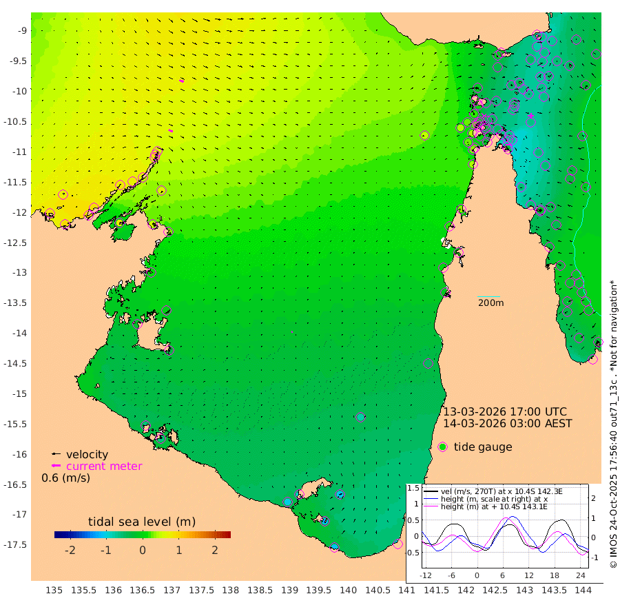 32cm/s 116T +3cm/s rms + 7cm/s -42T. ARA-GOC87 57m 8cm/s 69T +3cm/s rms + 2cm/s -2T. ARA-GOC87 60m 30cm/s 113T +2cm/s rms + 3cm/s 61T. ARA-GOC87 47m -67cm Daru -67cm Bobo Island -24cm Meer Island Barge -48cm Bramble Cay -62cm Unnamed Cay -66cm Pearce Cay -57cm Stephens Island -68cm Merrie England Shoals -77cm Mutacomal Reef -46cm Darnley Island Barge -39cm East Cay -53cm Yorke Island Barge -68cm Rennel Island -64cm Aureed Island -62cm Dungeness Reef -41cm Zagai Island -46cm Yam Island -11cm Dauan Island -15cm Saibai Island -35cm Phipi Reef -50cm Warrior Reef - West -11cm Mabuiag Island Barge -60cm Half Way Island -66cm Coconut Island -65cm Dugong Islet -58cm Poll Island -61cm Kirkcaldie Reef -60cm Suarji Island -52cm Sue Islet 18cm Hawkesbury Island -50cm Alert Patches -49cm Twin Island 19cm Badu Island -41cm St Pauls (Moa Island) 8cm Kubin (Moa Island) -28cm Ince Point -15cm Thursday Island -18cm Nardana Patches -5cm Turtle Head 11cm Round Island 23cm Goods Island 41cm Booby Island 23cm White Rocks Area 51cm Carpentaria -34cm Papou Point 45cm Bampfield Head 35cm Crab Island 28cm Red Wallis Island 5cm Packe Island -79cm Harrington Reef 26cm Herald Camp -18cm Sharp Point -16cm Red Island Point -25cm Possession Island -50cm Alpha Rock -61cm Frederick Point -68cm Wyborn Reef Light -65cm Tetley Island -29cm Triangle Reef -57cm Turtle Head Island -30cm Maclennan Cay -14cm Raine Island -59cm Mcsweeny Reef -54cm Collette Reef -29cm Shadwell Reef -58cm Hannibal Island -54cm Round Point 40cm Vrilya Point -47cm Cape Grenville -37cm Hicks Island -32cm Sir Charles Hardy Island -13cm Harvey Island -39cm Kay Reef -26cm Rocky Island -25cm Chapman Island -20cm Ham Reef -19cm Jubilee Reef -23cm Night Island -25cm Unnamed Reef No. 3 -26cm Morris Island -10cm 1st 3 Mile Opening -21cm Creech Reef -34cm Fife Island -21cm Eden Reef -26cm Stanley Island -36cm Normanby River 83cm Yabooma Island 93cm Hutchison River 83cm Elcho Island 72cm North West Crocodile Island 66cm Cape Wessel 77cm Stevens Island 73cm Guluwuru Island 66cm Hopeful Bay 70cm Auster Point 83cm Two Island Bay 94cm Cadell Strait 81cm Mallison Island 59cm Melville Bay (Gove Harbour) 68cm Truant Island 42cm Cape Arnhem 13cm Cape Grey -6cm Hawk Island -19cm Milner Bay (Groote Eylandt) -36cm Cape Beatrice -65cm West Island -63cm Centre Island -94cm Mornington Island -98cm West Wellesley Islands -106cm Bountiful Island -106cm Albert River Mouth -114cm Sweers Island -118cm Karumba -80cm Nassau River Offshore -52cm Christmas Creek -15cm Archer River 7cm Boyd Point 7cm Weipa (Humbug Point) 18cm Pennefather River 31cm Cullen Point