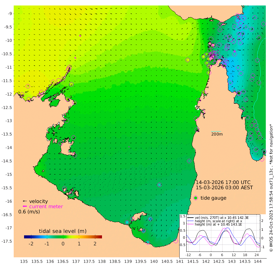 27cm/s 118T +3cm/s rms + 7cm/s -42T. ARA-GOC87 57m 11cm/s 43T +3cm/s rms + 2cm/s -2T. ARA-GOC87 60m 28cm/s 117T +2cm/s rms + 3cm/s 61T. ARA-GOC87 47m -95cm Daru -93cm Bobo Island -43cm Meer Island Barge -74cm Bramble Cay -92cm Unnamed Cay -90cm Pearce Cay -82cm Stephens Island -100cm Merrie England Shoals -108cm Mutacomal Reef -70cm Darnley Island Barge -59cm East Cay -78cm Yorke Island Barge -93cm Rennel Island -85cm Aureed Island -84cm Dungeness Reef -58cm Zagai Island -62cm Yam Island -24cm Dauan Island -26cm Saibai Island -52cm Phipi Reef -68cm Warrior Reef - West -19cm Mabuiag Island Barge -84cm Half Way Island -90cm Coconut Island -88cm Dugong Islet -77cm Poll Island -81cm Kirkcaldie Reef -72cm Suarji Island -72cm Sue Islet 11cm Hawkesbury Island -65cm Alert Patches -64cm Twin Island 13cm Badu Island -54cm St Pauls (Moa Island) 0cm Kubin (Moa Island) -38cm Ince Point -23cm Thursday Island -26cm Nardana Patches -12cm Turtle Head 1cm Round Island 20cm Goods Island 44cm Booby Island 26cm White Rocks Area 60cm Carpentaria -43cm Papou Point 40cm Bampfield Head 37cm Crab Island 30cm Red Wallis Island -2cm Packe Island -101cm Harrington Reef 20cm Herald Camp -21cm Sharp Point -19cm Red Island Point -37cm Possession Island -67cm Alpha Rock -80cm Frederick Point -98cm Wyborn Reef Light -94cm Tetley Island -47cm Triangle Reef -85cm Turtle Head Island -46cm Maclennan Cay -30cm Raine Island -84cm Mcsweeny Reef -81cm Collette Reef -51cm Shadwell Reef -87cm Hannibal Island -82cm Round Point 43cm Vrilya Point -71cm Cape Grenville -58cm Hicks Island -53cm Sir Charles Hardy Island -20cm Harvey Island -62cm Kay Reef -44cm Rocky Island -42cm Chapman Island -35cm Ham Reef -36cm Jubilee Reef -40cm Night Island -41cm Unnamed Reef No. 3 -44cm Morris Island -26cm 1st 3 Mile Opening -37cm Creech Reef -52cm Fife Island -41cm Eden Reef -46cm Stanley Island -55cm Normanby River 74cm Yabooma Island 79cm Hutchison River 73cm Elcho Island 66cm North West Crocodile Island 56cm Cape Wessel 60cm Stevens Island 53cm Guluwuru Island 50cm Hopeful Bay 58cm Auster Point 71cm Two Island Bay 75cm Cadell Strait 12cm Mallison Island 41cm Melville Bay (Gove Harbour) 49cm Truant Island 29cm Cape Arnhem 8cm Cape Grey -13cm Hawk Island -13cm Milner Bay (Groote Eylandt) -29cm Cape Beatrice -48cm West Island -46cm Centre Island -90cm Mornington Island -90cm West Wellesley Islands -99cm Bountiful Island -96cm Albert River Mouth -106cm Sweers Island -111cm Karumba -80cm Nassau River Offshore -57cm Christmas Creek -19cm Archer River 4cm Boyd Point 5cm Weipa (Humbug Point) 15cm Pennefather River 33cm Cullen Point