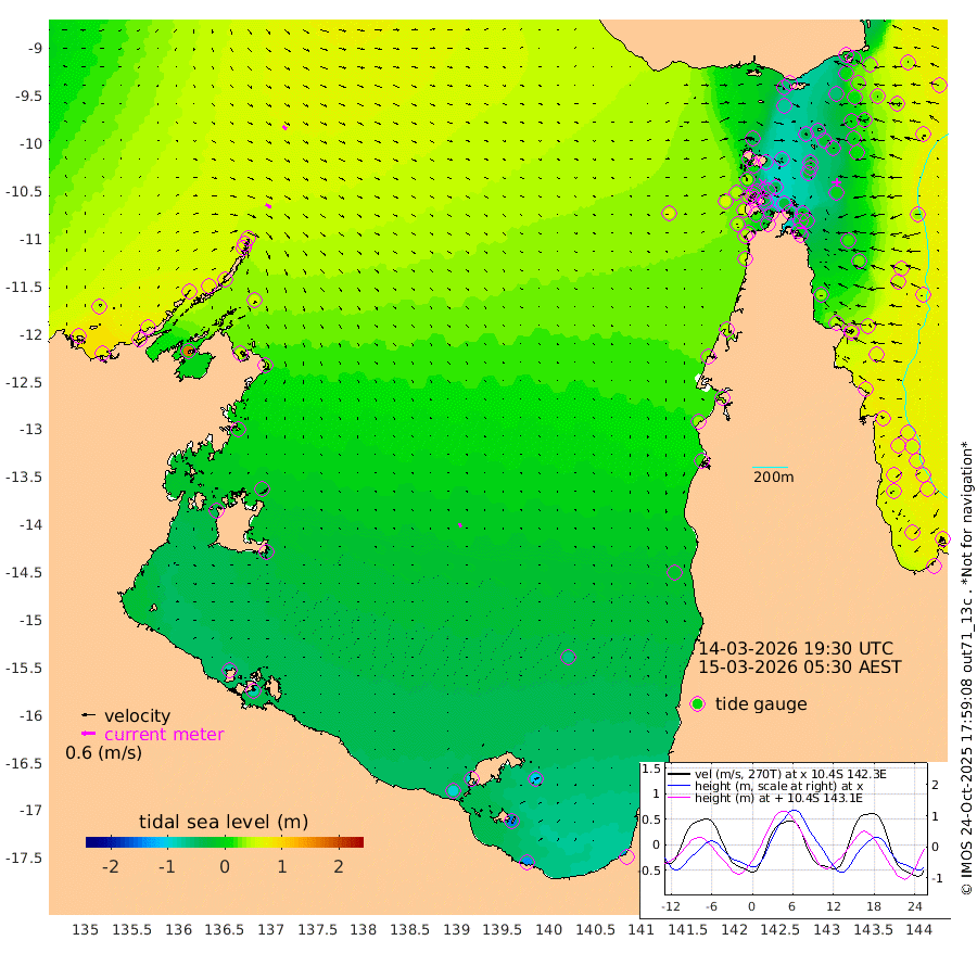 26cm/s 122T +3cm/s rms + 7cm/s -42T. ARA-GOC87 57m 17cm/s 151T +3cm/s rms + 2cm/s -2T. ARA-GOC87 60m 21cm/s 125T +2cm/s rms + 3cm/s 61T. ARA-GOC87 47m -9cm Daru -8cm Bobo Island 54cm Meer Island Barge 44cm Bramble Cay 26cm Unnamed Cay 6cm Pearce Cay 27cm Stephens Island 32cm Merrie England Shoals 1cm Mutacomal Reef 35cm Darnley Island Barge 49cm East Cay 13cm Yorke Island Barge 3cm Rennel Island -6cm Aureed Island -18cm Dungeness Reef -49cm Zagai Island -45cm Yam Island -55cm Dauan Island -53cm Saibai Island -70cm Phipi Reef -57cm Warrior Reef - West -38cm Mabuiag Island Barge 9cm Half Way Island -22cm Coconut Island -2cm Dugong Islet -34cm Poll Island -26cm Kirkcaldie Reef -64cm Suarji Island -28cm Sue Islet 33cm Hawkesbury Island -38cm Alert Patches -40cm Twin Island 9cm Badu Island -51cm St Pauls (Moa Island) 8cm Kubin (Moa Island) -28cm Ince Point -16cm Thursday Island -21cm Nardana Patches 1cm Turtle Head 11cm Round Island 36cm Goods Island 53cm Booby Island 40cm White Rocks Area 60cm Carpentaria -41cm Papou Point 56cm Bampfield Head 38cm Crab Island 42cm Red Wallis Island 20cm Packe Island -19cm Harrington Reef 35cm Herald Camp -26cm Sharp Point -12cm Red Island Point -26cm Possession Island -29cm Alpha Rock -32cm Frederick Point -5cm Wyborn Reef Light -13cm Tetley Island 34cm Triangle Reef 6cm Turtle Head Island 45cm Maclennan Cay 58cm Raine Island 19cm Mcsweeny Reef 28cm Collette Reef 49cm Shadwell Reef 36cm Hannibal Island 43cm Round Point 49cm Vrilya Point 48cm Cape Grenville 46cm Hicks Island 58cm Sir Charles Hardy Island 13cm Harvey Island 62cm Kay Reef 57cm Rocky Island 60cm Chapman Island 61cm Ham Reef 61cm Jubilee Reef 50cm Night Island 59cm Unnamed Reef No. 3 62cm Morris Island 66cm 1st 3 Mile Opening 62cm Creech Reef 51cm Fife Island 81cm Eden Reef 70cm Stanley Island 68cm Normanby River 68cm Yabooma Island 69cm Hutchison River 59cm Elcho Island 47cm North West Crocodile Island 57cm Cape Wessel 64cm Stevens Island 70cm Guluwuru Island 61cm Hopeful Bay 57cm Auster Point 66cm Two Island Bay 73cm Cadell Strait 166cm Mallison Island 51cm Melville Bay (Gove Harbour) 59cm Truant Island 32cm Cape Arnhem 1cm Cape Grey -17cm Hawk Island -42cm Milner Bay (Groote Eylandt) -50cm Cape Beatrice -80cm West Island -82cm Centre Island -99cm Mornington Island -92cm West Wellesley Islands -109cm Bountiful Island -136cm Albert River Mouth -149cm Sweers Island -144cm Karumba -61cm Nassau River Offshore -22cm Christmas Creek 17cm Archer River 30cm Boyd Point 34cm Weipa (Humbug Point) 34cm Pennefather River 42cm Cullen Point