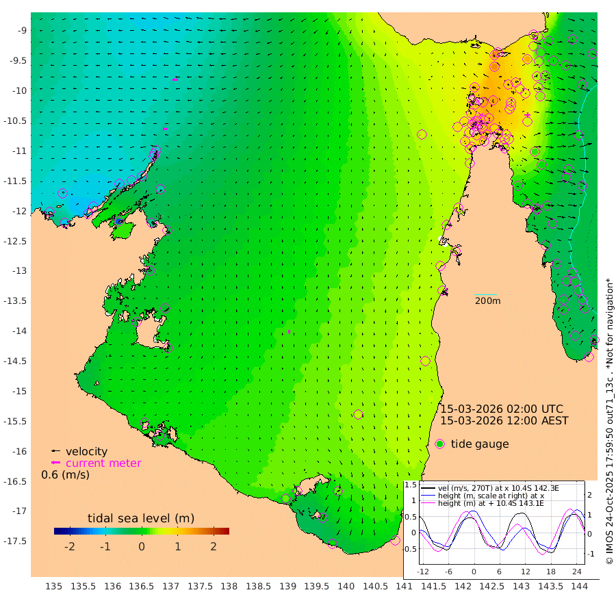 33cm/s -90T +3cm/s rms + 7cm/s -42T. ARA-GOC87 57m 24cm/s -172T +3cm/s rms + 2cm/s -2T. ARA-GOC87 60m 38cm/s -93T +2cm/s rms + 3cm/s 61T. ARA-GOC87 47m 55cm Daru 43cm Bobo Island -20cm Meer Island Barge -10cm Bramble Cay 17cm Unnamed Cay 35cm Pearce Cay 13cm Stephens Island 6cm Merrie England Shoals 45cm Mutacomal Reef 4cm Darnley Island Barge -16cm East Cay 29cm Yorke Island Barge 42cm Rennel Island 48cm Aureed Island 72cm Dungeness Reef 104cm Zagai Island 108cm Yam Island 150cm Dauan Island 130cm Saibai Island 148cm Phipi Reef 127cm Warrior Reef - West 118cm Mabuiag Island Barge 36cm Half Way Island 68cm Coconut Island 55cm Dugong Islet 92cm Poll Island 82cm Kirkcaldie Reef 130cm Suarji Island 82cm Sue Islet 103cm Hawkesbury Island 117cm Alert Patches 114cm Twin Island 108cm Badu Island 129cm St Pauls (Moa Island) 112cm Kubin (Moa Island) 118cm Ince Point 114cm Thursday Island 117cm Nardana Patches 113cm Turtle Head 104cm Round Island 95cm Goods Island 85cm Booby Island 85cm White Rocks Area 55cm Carpentaria 103cm Papou Point 85cm Bampfield Head 69cm Crab Island 93cm Red Wallis Island 112cm Packe Island 66cm Harrington Reef 109cm Herald Camp 41cm Sharp Point 94cm Red Island Point 106cm Possession Island 93cm Alpha Rock 95cm Frederick Point 54cm Wyborn Reef Light 66cm Tetley Island 8cm Triangle Reef 45cm Turtle Head Island -5cm Maclennan Cay -26cm Raine Island 22cm Mcsweeny Reef 10cm Collette Reef -12cm Shadwell Reef 2cm Hannibal Island -5cm Round Point 52cm Vrilya Point -10cm Cape Grenville -11cm Hicks Island -8cm Sir Charles Hardy Island -2cm Harvey Island -28cm Kay Reef -23cm Rocky Island -25cm Chapman Island -26cm Ham Reef -27cm Jubilee Reef -15cm Night Island -24cm Unnamed Reef No. 3 -27cm Morris Island -28cm 1st 3 Mile Opening -25cm Creech Reef -18cm Fife Island -44cm Eden Reef -35cm Stanley Island -38cm Normanby River -103cm Yabooma Island -108cm Hutchison River -102cm Elcho Island -92cm North West Crocodile Island -86cm Cape Wessel -109cm Stevens Island -90cm Guluwuru Island -99cm Hopeful Bay -91cm Auster Point -92cm Two Island Bay -110cm Cadell Strait -160cm Mallison Island -73cm Melville Bay (Gove Harbour) -78cm Truant Island -48cm Cape Arnhem -41cm Cape Grey -21cm Hawk Island -30cm Milner Bay (Groote Eylandt) -13cm Cape Beatrice 3cm West Island 1cm Centre Island 32cm Mornington Island 25cm West Wellesley Islands 27cm Bountiful Island 11cm Albert River Mouth 0cm Sweers Island 32cm Karumba 51cm Nassau River Offshore 60cm Christmas Creek 46cm Archer River 53cm Boyd Point 55cm Weipa (Humbug Point) 36cm Pennefather River 63cm Cullen Point