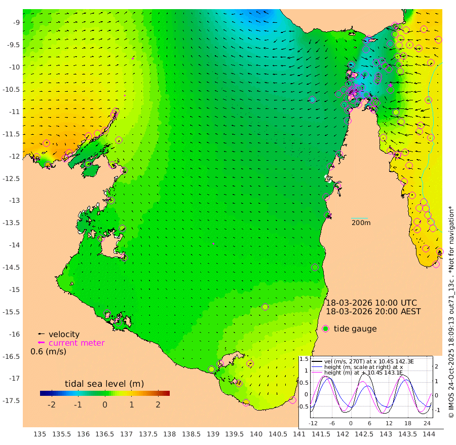 11cm/s 87T +3cm/s rms + 7cm/s -42T. ARA-GOC87 57m 16cm/s -46T +3cm/s rms + 2cm/s -2T. ARA-GOC87 60m 17cm/s 71T +2cm/s rms + 3cm/s 61T. ARA-GOC87 47m 18cm Daru 27cm Bobo Island 67cm Meer Island Barge 71cm Bramble Cay 50cm Unnamed Cay 45cm Pearce Cay 58cm Stephens Island 62cm Merrie England Shoals 23cm Mutacomal Reef 53cm Darnley Island Barge 75cm East Cay 30cm Yorke Island Barge 35cm Rennel Island 22cm Aureed Island 5cm Dungeness Reef -61cm Zagai Island -59cm Yam Island -105cm Dauan Island -116cm Saibai Island -64cm Phipi Reef -66cm Warrior Reef - West -98cm Mabuiag Island Barge 33cm Half Way Island -1cm Coconut Island 14cm Dugong Islet -29cm Poll Island -16cm Kirkcaldie Reef -63cm Suarji Island -40cm Sue Islet -59cm Hawkesbury Island -56cm Alert Patches -59cm Twin Island -72cm Badu Island -78cm St Pauls (Moa Island) -63cm Kubin (Moa Island) -70cm Ince Point -71cm Thursday Island -72cm Nardana Patches -58cm Turtle Head -48cm Round Island -51cm Goods Island -59cm Booby Island -53cm White Rocks Area -88cm Carpentaria -64cm Papou Point -50cm Bampfield Head -44cm Crab Island -65cm Red Wallis Island -57cm Packe Island 11cm Harrington Reef -52cm Herald Camp -31cm Sharp Point -49cm Red Island Point -44cm Possession Island -56cm Alpha Rock -32cm Frederick Point 9cm Wyborn Reef Light -6cm Tetley Island 38cm Triangle Reef 29cm Turtle Head Island 55cm Maclennan Cay 69cm Raine Island 43cm Mcsweeny Reef 51cm Collette Reef 59cm Shadwell Reef 64cm Hannibal Island 76cm Round Point -47cm Vrilya Point 69cm Cape Grenville 71cm Hicks Island 56cm Sir Charles Hardy Island 22cm Harvey Island 76cm Kay Reef 71cm Rocky Island 69cm Chapman Island 63cm Ham Reef 66cm Jubilee Reef 64cm Night Island 64cm Unnamed Reef No. 3 77cm Morris Island 71cm 1st 3 Mile Opening 71cm Creech Reef 76cm Fife Island 95cm Eden Reef 83cm Stanley Island 93cm Normanby River 119cm Yabooma Island 134cm Hutchison River 115cm Elcho Island 109cm North West Crocodile Island 48cm Cape Wessel 101cm Stevens Island 47cm Guluwuru Island 102cm Hopeful Bay 77cm Auster Point 75cm Two Island Bay 108cm Cadell Strait 25cm Mallison Island 52cm Melville Bay (Gove Harbour) 48cm Truant Island 29cm Cape Arnhem 30cm Cape Grey 34cm Hawk Island 25cm Milner Bay (Groote Eylandt) 25cm Cape Beatrice 6cm West Island 10cm Centre Island 54cm Mornington Island 49cm West Wellesley Islands 70cm Bountiful Island 100cm Albert River Mouth 116cm Sweers Island 105cm Karumba 43cm Nassau River Offshore 22cm Christmas Creek 7cm Archer River -23cm Boyd Point -10cm Weipa (Humbug Point) -13cm Pennefather River -47cm Cullen Point
