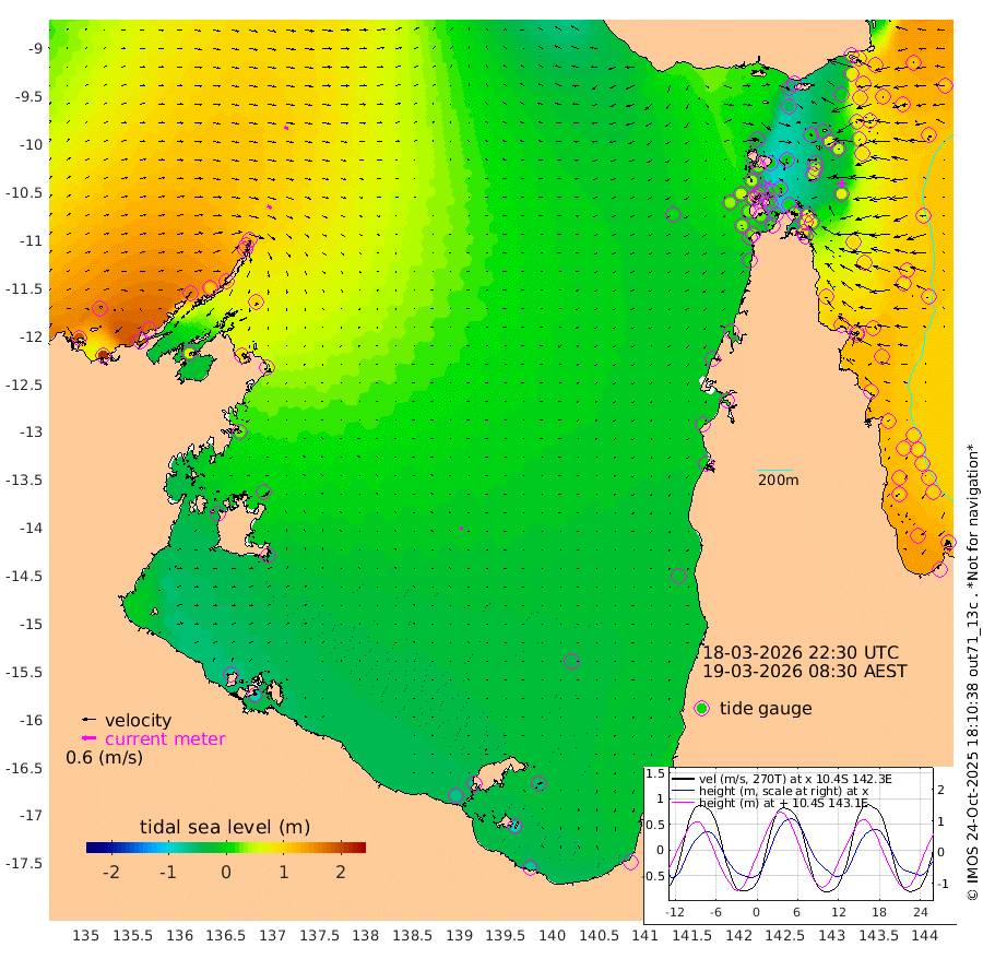 20cm/s 121T +3cm/s rms + 7cm/s -42T. ARA-GOC87 57m 12cm/s -180T +3cm/s rms + 2cm/s -2T. ARA-GOC87 60m 18cm/s 117T +2cm/s rms + 3cm/s 61T. ARA-GOC87 47m 69cm Daru 77cm Bobo Island 101cm Meer Island Barge 113cm Bramble Cay 102cm Unnamed Cay 99cm Pearce Cay 107cm Stephens Island 109cm Merrie England Shoals 80cm Mutacomal Reef 98cm Darnley Island Barge 110cm East Cay 80cm Yorke Island Barge 88cm Rennel Island 71cm Aureed Island 58cm Dungeness Reef -8cm Zagai Island 7cm Yam Island -46cm Dauan Island -54cm Saibai Island -43cm Phipi Reef -10cm Warrior Reef - West -29cm Mabuiag Island Barge 89cm Half Way Island 51cm Coconut Island 80cm Dugong Islet 32cm Poll Island 43cm Kirkcaldie Reef -5cm Suarji Island 21cm Sue Islet 43cm Hawkesbury Island 7cm Alert Patches 11cm Twin Island 16cm Badu Island -7cm St Pauls (Moa Island) 27cm Kubin (Moa Island) 4cm Ince Point 6cm Thursday Island 4cm Nardana Patches 20cm Turtle Head 15cm Round Island 41cm Goods Island 35cm Booby Island 45cm White Rocks Area 3cm Carpentaria 4cm Papou Point 29cm Bampfield Head 15cm Crab Island 30cm Red Wallis Island 29cm Packe Island 73cm Harrington Reef 23cm Herald Camp -21cm Sharp Point 16cm Red Island Point 4cm Possession Island 13cm Alpha Rock 35cm Frederick Point 71cm Wyborn Reef Light 58cm Tetley Island 76cm Triangle Reef 93cm Turtle Head Island 97cm Maclennan Cay 94cm Raine Island 92cm Mcsweeny Reef 90cm Collette Reef 88cm Shadwell Reef 105cm Hannibal Island 117cm Round Point 8cm Vrilya Point 107cm Cape Grenville 107cm Hicks Island 110cm Sir Charles Hardy Island 32cm Harvey Island 113cm Kay Reef 102cm Rocky Island 98cm Chapman Island 95cm Ham Reef 100cm Jubilee Reef 88cm Night Island 96cm Unnamed Reef No. 3 109cm Morris Island 102cm 1st 3 Mile Opening 102cm Creech Reef 104cm Fife Island 129cm Eden Reef 113cm Stanley Island 131cm Normanby River 190cm Yabooma Island 211cm Hutchison River 174cm Elcho Island 168cm North West Crocodile Island 117cm Cape Wessel 158cm Stevens Island 110cm Guluwuru Island 140cm Hopeful Bay 129cm Auster Point 137cm Two Island Bay 180cm Cadell Strait 70cm Mallison Island 97cm Melville Bay (Gove Harbour) 102cm Truant Island 54cm Cape Arnhem 29cm Cape Grey 3cm Hawk Island -31cm Milner Bay (Groote Eylandt) -31cm Cape Beatrice -72cm West Island -86cm Centre Island -74cm Mornington Island -64cm West Wellesley Islands -52cm Bountiful Island -75cm Albert River Mouth -91cm Sweers Island -81cm Karumba -36cm Nassau River Offshore -15cm Christmas Creek 5cm Archer River 8cm Boyd Point 18cm Weipa (Humbug Point) -1cm Pennefather River 2cm Cullen Point