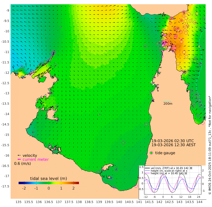2cm/s -4T +3cm/s rms + 7cm/s -42T. ARA-GOC87 57m 23cm/s 167T +3cm/s rms + 2cm/s -2T. ARA-GOC87 60m 10cm/s -66T +2cm/s rms + 3cm/s 61T. ARA-GOC87 47m 118cm Daru 103cm Bobo Island 8cm Meer Island Barge 39cm Bramble Cay 81cm Unnamed Cay 81cm Pearce Cay 64cm Stephens Island 76cm Merrie England Shoals 118cm Mutacomal Reef 54cm Darnley Island Barge 10cm East Cay 84cm Yorke Island Barge 93cm Rennel Island 92cm Aureed Island 111cm Dungeness Reef 146cm Zagai Island 147cm Yam Island 148cm Dauan Island 145cm Saibai Island 131cm Phipi Reef 159cm Warrior Reef - West 112cm Mabuiag Island Barge 91cm Half Way Island 118cm Coconut Island 109cm Dugong Islet 132cm Poll Island 126cm Kirkcaldie Reef 135cm Suarji Island 131cm Sue Islet 37cm Hawkesbury Island 124cm Alert Patches 132cm Twin Island 56cm Badu Island 145cm St Pauls (Moa Island) 69cm Kubin (Moa Island) 111cm Ince Point 93cm Thursday Island 99cm Nardana Patches 67cm Turtle Head 41cm Round Island 22cm Goods Island -5cm Booby Island 4cm White Rocks Area -6cm Carpentaria 119cm Papou Point -14cm Bampfield Head -5cm Crab Island 14cm Red Wallis Island 54cm Packe Island 120cm Harrington Reef 17cm Herald Camp 52cm Sharp Point 54cm Red Island Point 79cm Possession Island 133cm Alpha Rock 130cm Frederick Point 124cm Wyborn Reef Light 132cm Tetley Island 30cm Triangle Reef 104cm Turtle Head Island 14cm Maclennan Cay -17cm Raine Island 75cm Mcsweeny Reef 59cm Collette Reef 17cm Shadwell Reef 59cm Hannibal Island 38cm Round Point -10cm Vrilya Point 27cm Cape Grenville 17cm Hicks Island 21cm Sir Charles Hardy Island 8cm Harvey Island 5cm Kay Reef -8cm Rocky Island -17cm Chapman Island -15cm Ham Reef -8cm Jubilee Reef -2cm Night Island -13cm Unnamed Reef No. 3 -10cm Morris Island -19cm 1st 3 Mile Opening -12cm Creech Reef -1cm Fife Island -26cm Eden Reef -14cm Stanley Island -13cm Normanby River -86cm Yabooma Island -78cm Hutchison River -79cm Elcho Island -74cm North West Crocodile Island -22cm Cape Wessel -50cm Stevens Island 13cm Guluwuru Island -65cm Hopeful Bay -46cm Auster Point -39cm Two Island Bay -35cm Cadell Strait 109cm Mallison Island 0cm Melville Bay (Gove Harbour) 2cm Truant Island 7cm Cape Arnhem -6cm Cape Grey -6cm Hawk Island -25cm Milner Bay (Groote Eylandt) -15cm Cape Beatrice -17cm West Island -27cm Centre Island -12cm Mornington Island -13cm West Wellesley Islands -38cm Bountiful Island -44cm Albert River Mouth -71cm Sweers Island -45cm Karumba -2cm Nassau River Offshore 7cm Christmas Creek -11cm Archer River 1cm Boyd Point -15cm Weipa (Humbug Point) -9cm Pennefather River -6cm Cullen Point