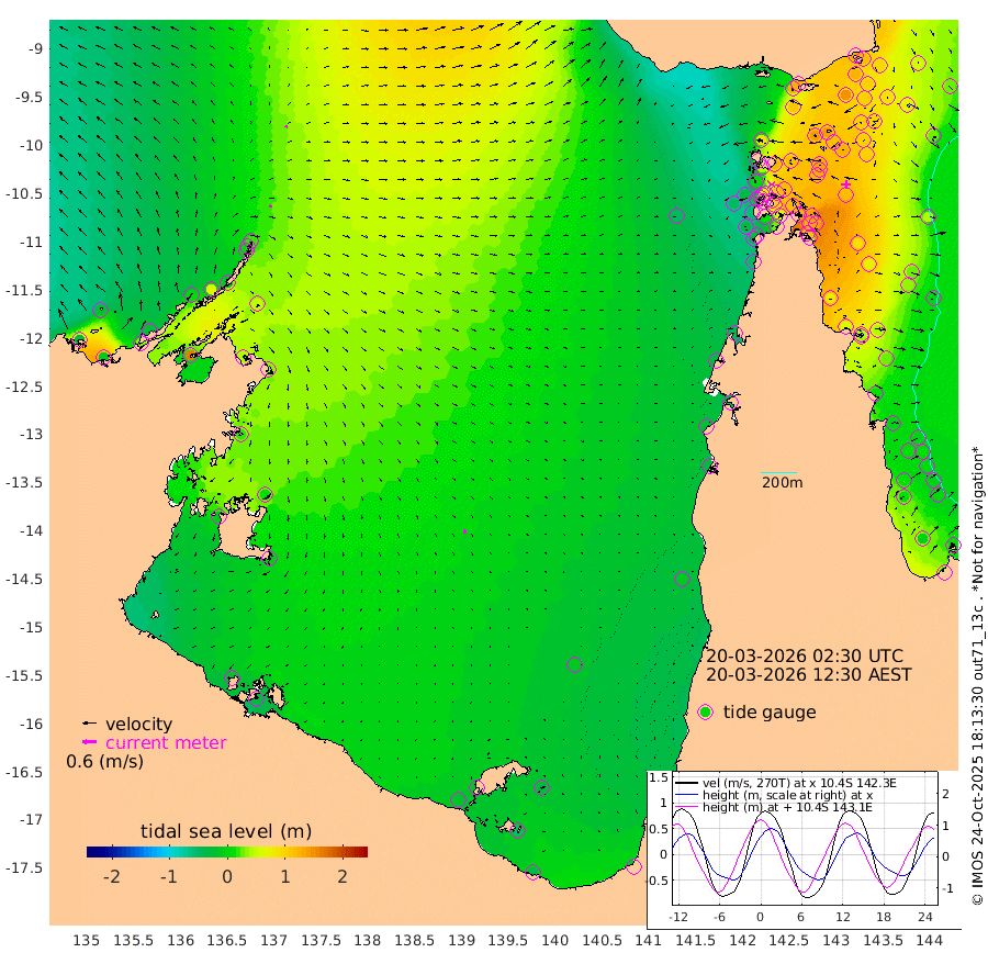 12cm/s 72T +3cm/s rms + 7cm/s -42T. ARA-GOC87 57m 18cm/s 167T +3cm/s rms + 2cm/s -2T. ARA-GOC87 60m 9cm/s 28T +2cm/s rms + 3cm/s 61T. ARA-GOC87 47m 128cm Daru 118cm Bobo Island 27cm Meer Island Barge 59cm Bramble Cay 98cm Unnamed Cay 98cm Pearce Cay 83cm Stephens Island 92cm Merrie England Shoals 126cm Mutacomal Reef 74cm Darnley Island Barge 30cm East Cay 100cm Yorke Island Barge 105cm Rennel Island 103cm Aureed Island 115cm Dungeness Reef 138cm Zagai Island 137cm Yam Island 123cm Dauan Island 122cm Saibai Island 110cm Phipi Reef 148cm Warrior Reef - West 86cm Mabuiag Island Barge 104cm Half Way Island 121cm Coconut Island 118cm Dugong Islet 128cm Poll Island 125cm Kirkcaldie Reef 118cm Suarji Island 128cm Sue Islet 3cm Hawkesbury Island 104cm Alert Patches 115cm Twin Island 21cm Badu Island 125cm St Pauls (Moa Island) 39cm Kubin (Moa Island) 86cm Ince Point 63cm Thursday Island 71cm Nardana Patches 34cm Turtle Head 8cm Round Island -15cm Goods Island -48cm Booby Island -37cm White Rocks Area -48cm Carpentaria 105cm Papou Point -56cm Bampfield Head -43cm Crab Island -31cm Red Wallis Island 15cm Packe Island 126cm Harrington Reef -23cm Herald Camp 44cm Sharp Point 28cm Red Island Point 58cm Possession Island 119cm Alpha Rock 123cm Frederick Point 130cm Wyborn Reef Light 135cm Tetley Island 39cm Triangle Reef 117cm Turtle Head Island 29cm Maclennan Cay -2cm Raine Island 89cm Mcsweeny Reef 74cm Collette Reef 31cm Shadwell Reef 77cm Hannibal Island 56cm Round Point -48cm Vrilya Point 43cm Cape Grenville 36cm Hicks Island 38cm Sir Charles Hardy Island 14cm Harvey Island 23cm Kay Reef 9cm Rocky Island -3cm Chapman Island 0cm Ham Reef 10cm Jubilee Reef 11cm Night Island 0cm Unnamed Reef No. 3 8cm Morris Island -2cm 1st 3 Mile Opening 5cm Creech Reef 15cm Fife Island -2cm Eden Reef 4cm Stanley Island 11cm Normanby River -31cm Yabooma Island -11cm Hutchison River -24cm Elcho Island -21cm North West Crocodile Island 22cm Cape Wessel 4cm Stevens Island 65cm Guluwuru Island -18cm Hopeful Bay 1cm Auster Point 11cm Two Island Bay 34cm Cadell Strait 158cm Mallison Island 44cm Melville Bay (Gove Harbour) 47cm Truant Island 36cm Cape Arnhem 19cm Cape Grey 11cm Hawk Island -14cm Milner Bay (Groote Eylandt) -8cm Cape Beatrice -21cm West Island -33cm Centre Island -15cm Mornington Island -15cm West Wellesley Islands -31cm Bountiful Island -35cm Albert River Mouth -56cm Sweers Island -39cm Karumba -13cm Nassau River Offshore -11cm Christmas Creek -34cm Archer River -25cm Boyd Point -41cm Weipa (Humbug Point) -36cm Pennefather River -44cm Cullen Point