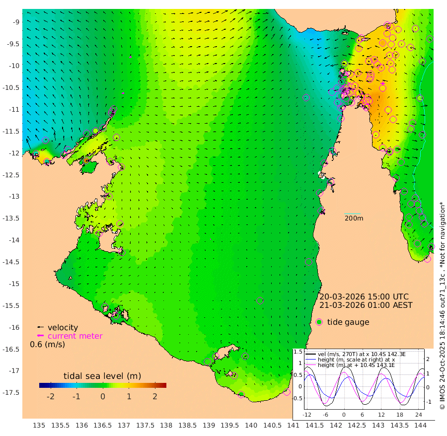 22cm/s 78T +3cm/s rms + 7cm/s -42T. ARA-GOC87 57m 6cm/s 64T +3cm/s rms + 2cm/s -2T. ARA-GOC87 60m 21cm/s 61T +2cm/s rms + 3cm/s 61T. ARA-GOC87 47m 109cm Daru 102cm Bobo Island 23cm Meer Island Barge 45cm Bramble Cay 81cm Unnamed Cay 78cm Pearce Cay 67cm Stephens Island 75cm Merrie England Shoals 100cm Mutacomal Reef 65cm Darnley Island Barge 21cm East Cay 87cm Yorke Island Barge 82cm Rennel Island 92cm Aureed Island 98cm Dungeness Reef 123cm Zagai Island 105cm Yam Island 91cm Dauan Island 95cm Saibai Island 109cm Phipi Reef 120cm Warrior Reef - West 57cm Mabuiag Island Barge 79cm Half Way Island 108cm Coconut Island 87cm Dugong Islet 103cm Poll Island 98cm Kirkcaldie Reef 110cm Suarji Island 107cm Sue Islet -56cm Hawkesbury Island 86cm Alert Patches 89cm Twin Island -18cm Badu Island 99cm St Pauls (Moa Island) -7cm Kubin (Moa Island) 55cm Ince Point 32cm Thursday Island 40cm Nardana Patches 0cm Turtle Head -9cm Round Island -57cm Goods Island -87cm Booby Island -82cm White Rocks Area -71cm Carpentaria 77cm Papou Point -55cm Bampfield Head -71cm Crab Island -82cm Red Wallis Island -31cm Packe Island 104cm Harrington Reef -53cm Herald Camp 39cm Sharp Point -7cm Red Island Point 56cm Possession Island 89cm Alpha Rock 98cm Frederick Point 110cm Wyborn Reef Light 112cm Tetley Island 30cm Triangle Reef 101cm Turtle Head Island 18cm Maclennan Cay -4cm Raine Island 75cm Mcsweeny Reef 66cm Collette Reef 29cm Shadwell Reef 70cm Hannibal Island 43cm Round Point -73cm Vrilya Point 34cm Cape Grenville 28cm Hicks Island 21cm Sir Charles Hardy Island 11cm Harvey Island 15cm Kay Reef 5cm Rocky Island -5cm Chapman Island -6cm Ham Reef 3cm Jubilee Reef 8cm Night Island -7cm Unnamed Reef No. 3 3cm Morris Island 0cm 1st 3 Mile Opening 1cm Creech Reef 5cm Fife Island -8cm Eden Reef 0cm Stanley Island -3cm Normanby River -85cm Yabooma Island -70cm Hutchison River -74cm Elcho Island -80cm North West Crocodile Island -9cm Cape Wessel -35cm Stevens Island 45cm Guluwuru Island -42cm Hopeful Bay -20cm Auster Point -27cm Two Island Bay -22cm Cadell Strait 161cm Mallison Island 34cm Melville Bay (Gove Harbour) 38cm Truant Island 39cm Cape Arnhem 36cm Cape Grey 36cm Hawk Island 29cm Milner Bay (Groote Eylandt) 17cm Cape Beatrice 18cm West Island 22cm Centre Island 30cm Mornington Island 21cm West Wellesley Islands 18cm Bountiful Island 9cm Albert River Mouth 34cm Sweers Island 12cm Karumba 1cm Nassau River Offshore -11cm Christmas Creek -38cm Archer River -40cm Boyd Point -57cm Weipa (Humbug Point) -39cm Pennefather River -65cm Cullen Point