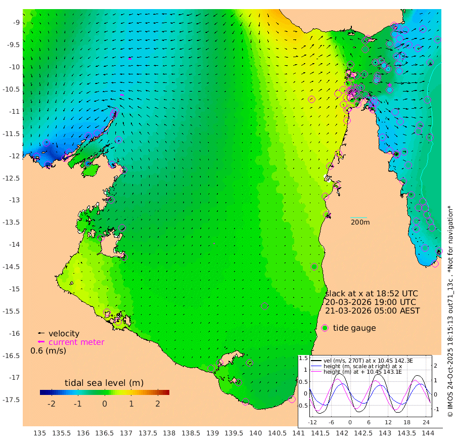31cm/s -81T +3cm/s rms + 7cm/s -42T. ARA-GOC87 57m 8cm/s 43T +3cm/s rms + 2cm/s -2T. ARA-GOC87 60m 30cm/s -96T +2cm/s rms + 3cm/s 61T. ARA-GOC87 47m -117cm Daru -119cm Bobo Island -73cm Meer Island Barge -100cm Bramble Cay -110cm Unnamed Cay -120cm Pearce Cay -112cm Stephens Island -114cm Merrie England Shoals -113cm Mutacomal Reef -97cm Darnley Island Barge -82cm East Cay -100cm Yorke Island Barge -112cm Rennel Island -102cm Aureed Island -100cm Dungeness Reef -70cm Zagai Island -71cm Yam Island -31cm Dauan Island -12cm Saibai Island -45cm Phipi Reef -75cm Warrior Reef - West 0cm Mabuiag Island Barge -110cm Half Way Island -101cm Coconut Island -105cm Dugong Islet -86cm Poll Island -90cm Kirkcaldie Reef -50cm Suarji Island -69cm Sue Islet 21cm Hawkesbury Island -44cm Alert Patches -55cm Twin Island 13cm Badu Island -49cm St Pauls (Moa Island) -7cm Kubin (Moa Island) -27cm Ince Point -10cm Thursday Island -14cm Nardana Patches -2cm Turtle Head 15cm Round Island 24cm Goods Island 57cm Booby Island 43cm White Rocks Area 92cm Carpentaria -47cm Papou Point 65cm Bampfield Head 42cm Crab Island 46cm Red Wallis Island 6cm Packe Island -112cm Harrington Reef 43cm Herald Camp -9cm Sharp Point -2cm Red Island Point -19cm Possession Island -52cm Alpha Rock -80cm Frederick Point -110cm Wyborn Reef Light -104cm Tetley Island -63cm Triangle Reef -121cm Turtle Head Island -67cm Maclennan Cay -54cm Raine Island -103cm Mcsweeny Reef -93cm Collette Reef -66cm Shadwell Reef -105cm Hannibal Island -103cm Round Point 55cm Vrilya Point -82cm Cape Grenville -84cm Hicks Island -71cm Sir Charles Hardy Island -27cm Harvey Island -70cm Kay Reef -60cm Rocky Island -50cm Chapman Island -46cm Ham Reef -58cm Jubilee Reef -59cm Night Island -50cm Unnamed Reef No. 3 -66cm Morris Island -54cm 1st 3 Mile Opening -58cm Creech Reef -74cm Fife Island -72cm Eden Reef -63cm Stanley Island -79cm Normanby River -138cm Yabooma Island -179cm Hutchison River -141cm Elcho Island -136cm North West Crocodile Island -102cm Cape Wessel -143cm Stevens Island -129cm Guluwuru Island -115cm Hopeful Bay -110cm Auster Point -121cm Two Island Bay -188cm Cadell Strait -146cm Mallison Island -112cm Melville Bay (Gove Harbour) -116cm Truant Island -75cm Cape Arnhem -43cm Cape Grey -32cm Hawk Island 8cm Milner Bay (Groote Eylandt) 5cm Cape Beatrice 51cm West Island 59cm Centre Island 9cm Mornington Island 15cm West Wellesley Islands 19cm Bountiful Island -14cm Albert River Mouth 6cm Sweers Island -10cm Karumba 1cm Nassau River Offshore 5cm Christmas Creek 23cm Archer River 32cm Boyd Point 33cm Weipa (Humbug Point) 30cm Pennefather River 57cm Cullen Point