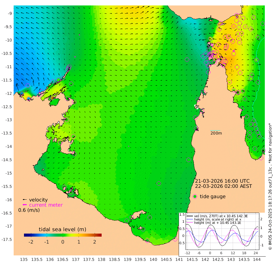18cm/s 81T +3cm/s rms + 7cm/s -42T. ARA-GOC87 57m 10cm/s 125T +3cm/s rms + 2cm/s -2T. ARA-GOC87 60m 13cm/s 57T +2cm/s rms + 3cm/s 61T. ARA-GOC87 47m 89cm Daru 81cm Bobo Island 21cm Meer Island Barge 34cm Bramble Cay 65cm Unnamed Cay 59cm Pearce Cay 53cm Stephens Island 58cm Merrie England Shoals 80cm Mutacomal Reef 57cm Darnley Island Barge 14cm East Cay 75cm Yorke Island Barge 64cm Rennel Island 76cm Aureed Island 81cm Dungeness Reef 110cm Zagai Island 92cm Yam Island 91cm Dauan Island 96cm Saibai Island 100cm Phipi Reef 108cm Warrior Reef - West 56cm Mabuiag Island Barge 64cm Half Way Island 89cm Coconut Island 72cm Dugong Islet 87cm Poll Island 83cm Kirkcaldie Reef 95cm Suarji Island 96cm Sue Islet -45cm Hawkesbury Island 76cm Alert Patches 77cm Twin Island -11cm Badu Island 88cm St Pauls (Moa Island) -1cm Kubin (Moa Island) 52cm Ince Point 33cm Thursday Island 39cm Nardana Patches 6cm Turtle Head -5cm Round Island -42cm Goods Island -63cm Booby Island -66cm White Rocks Area -37cm Carpentaria 67cm Papou Point -37cm Bampfield Head -51cm Crab Island -61cm Red Wallis Island -21cm Packe Island 83cm Harrington Reef -35cm Herald Camp 37cm Sharp Point -6cm Red Island Point 49cm Possession Island 78cm Alpha Rock 82cm Frederick Point 88cm Wyborn Reef Light 91cm Tetley Island 26cm Triangle Reef 79cm Turtle Head Island 16cm Maclennan Cay -3cm Raine Island 61cm Mcsweeny Reef 54cm Collette Reef 26cm Shadwell Reef 57cm Hannibal Island 29cm Round Point -47cm Vrilya Point 27cm Cape Grenville 21cm Hicks Island 20cm Sir Charles Hardy Island 9cm Harvey Island 11cm Kay Reef 4cm Rocky Island -5cm Chapman Island -4cm Ham Reef 4cm Jubilee Reef 8cm Night Island -5cm Unnamed Reef No. 3 2cm Morris Island 3cm 1st 3 Mile Opening 3cm Creech Reef 2cm Fife Island -6cm Eden Reef 1cm Stanley Island -7cm Normanby River -136cm Yabooma Island -130cm Hutchison River -125cm Elcho Island -131cm North West Crocodile Island -40cm Cape Wessel -84cm Stevens Island 21cm Guluwuru Island -85cm Hopeful Bay -57cm Auster Point -62cm Two Island Bay -69cm Cadell Strait 164cm Mallison Island 8cm Melville Bay (Gove Harbour) 11cm Truant Island 23cm Cape Arnhem 20cm Cape Grey 20cm Hawk Island 15cm Milner Bay (Groote Eylandt) 5cm Cape Beatrice 13cm West Island 18cm Centre Island 21cm Mornington Island 14cm West Wellesley Islands 3cm Bountiful Island -17cm Albert River Mouth 2cm Sweers Island -14cm Karumba 2cm Nassau River Offshore 1cm Christmas Creek -22cm Archer River -19cm Boyd Point -36cm Weipa (Humbug Point) -20cm Pennefather River -40cm Cullen Point