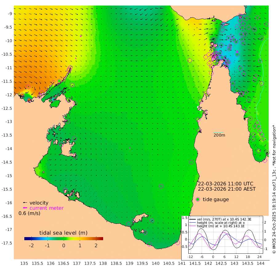 19cm/s 143T +3cm/s rms + 7cm/s -42T. ARA-GOC87 57m 13cm/s -20T +3cm/s rms + 2cm/s -2T. ARA-GOC87 60m 23cm/s 134T +2cm/s rms + 3cm/s 61T. ARA-GOC87 47m -51cm Daru -41cm Bobo Island 1cm Meer Island Barge -5cm Bramble Cay -33cm Unnamed Cay -20cm Pearce Cay -19cm Stephens Island -24cm Merrie England Shoals -47cm Mutacomal Reef -28cm Darnley Island Barge 9cm East Cay -45cm Yorke Island Barge -30cm Rennel Island -41cm Aureed Island -46cm Dungeness Reef -78cm Zagai Island -68cm Yam Island -76cm Dauan Island -91cm Saibai Island -68cm Phipi Reef -81cm Warrior Reef - West -45cm Mabuiag Island Barge -31cm Half Way Island -44cm Coconut Island -45cm Dugong Islet -53cm Poll Island -50cm Kirkcaldie Reef -64cm Suarji Island -72cm Sue Islet 56cm Hawkesbury Island -44cm Alert Patches -45cm Twin Island 39cm Badu Island -58cm St Pauls (Moa Island) 24cm Kubin (Moa Island) -26cm Ince Point -8cm Thursday Island -14cm Nardana Patches 20cm Turtle Head 32cm Round Island 64cm Goods Island 82cm Booby Island 84cm White Rocks Area 46cm Carpentaria -39cm Papou Point 70cm Bampfield Head 79cm Crab Island 78cm Red Wallis Island 47cm Packe Island -44cm Harrington Reef 48cm Herald Camp -32cm Sharp Point 26cm Red Island Point -15cm Possession Island -57cm Alpha Rock -47cm Frederick Point -48cm Wyborn Reef Light -53cm Tetley Island -5cm Triangle Reef -31cm Turtle Head Island 2cm Maclennan Cay 24cm Raine Island -28cm Mcsweeny Reef -24cm Collette Reef -4cm Shadwell Reef -23cm Hannibal Island 3cm Round Point 72cm Vrilya Point -4cm Cape Grenville 4cm Hicks Island -7cm Sir Charles Hardy Island -2cm Harvey Island 7cm Kay Reef 13cm Rocky Island 22cm Chapman Island 15cm Ham Reef 13cm Jubilee Reef 13cm Night Island 20cm Unnamed Reef No. 3 18cm Morris Island 18cm 1st 3 Mile Opening 16cm Creech Reef 20cm Fife Island 26cm Eden Reef 17cm Stanley Island 22cm Normanby River 167cm Yabooma Island 177cm Hutchison River 161cm Elcho Island 157cm North West Crocodile Island 70cm Cape Wessel 129cm Stevens Island 19cm Guluwuru Island 119cm Hopeful Bay 95cm Auster Point 92cm Two Island Bay 122cm Cadell Strait -101cm Mallison Island 31cm Melville Bay (Gove Harbour) 33cm Truant Island 8cm Cape Arnhem -8cm Cape Grey -12cm Hawk Island -20cm Milner Bay (Groote Eylandt) -22cm Cape Beatrice -51cm West Island -47cm Centre Island -47cm Mornington Island -50cm West Wellesley Islands -54cm Bountiful Island -26cm Albert River Mouth -39cm Sweers Island -24cm Karumba -21cm Nassau River Offshore -7cm Christmas Creek 29cm Archer River 24cm Boyd Point 41cm Weipa (Humbug Point) 48cm Pennefather River 52cm Cullen Point