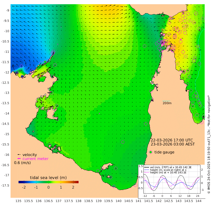 12cm/s 85T +3cm/s rms + 7cm/s -42T. ARA-GOC87 57m 18cm/s 144T +3cm/s rms + 2cm/s -2T. ARA-GOC87 60m 5cm/s 37T +2cm/s rms + 3cm/s 61T. ARA-GOC87 47m 73cm Daru 65cm Bobo Island 28cm Meer Island Barge 33cm Bramble Cay 58cm Unnamed Cay 48cm Pearce Cay 48cm Stephens Island 53cm Merrie England Shoals 66cm Mutacomal Reef 55cm Darnley Island Barge 19cm East Cay 67cm Yorke Island Barge 53cm Rennel Island 65cm Aureed Island 67cm Dungeness Reef 88cm Zagai Island 74cm Yam Island 76cm Dauan Island 82cm Saibai Island 79cm Phipi Reef 87cm Warrior Reef - West 47cm Mabuiag Island Barge 57cm Half Way Island 71cm Coconut Island 63cm Dugong Islet 69cm Poll Island 69cm Kirkcaldie Reef 74cm Suarji Island 81cm Sue Islet -29cm Hawkesbury Island 64cm Alert Patches 64cm Twin Island -4cm Badu Island 72cm St Pauls (Moa Island) 4cm Kubin (Moa Island) 45cm Ince Point 33cm Thursday Island 37cm Nardana Patches 12cm Turtle Head 0cm Round Island -23cm Goods Island -34cm Booby Island -43cm White Rocks Area -1cm Carpentaria 52cm Papou Point -16cm Bampfield Head -27cm Crab Island -34cm Red Wallis Island -7cm Packe Island 68cm Harrington Reef -15cm Herald Camp 31cm Sharp Point -2cm Red Island Point 40cm Possession Island 66cm Alpha Rock 66cm Frederick Point 70cm Wyborn Reef Light 72cm Tetley Island 29cm Triangle Reef 64cm Turtle Head Island 23cm Maclennan Cay 8cm Raine Island 54cm Mcsweeny Reef 51cm Collette Reef 32cm Shadwell Reef 53cm Hannibal Island 28cm Round Point -17cm Vrilya Point 31cm Cape Grenville 24cm Hicks Island 29cm Sir Charles Hardy Island 10cm Harvey Island 20cm Kay Reef 13cm Rocky Island 7cm Chapman Island 9cm Ham Reef 15cm Jubilee Reef 17cm Night Island 8cm Unnamed Reef No. 3 12cm Morris Island 16cm 1st 3 Mile Opening 15cm Creech Reef 10cm Fife Island 9cm Eden Reef 14cm Stanley Island 5cm Normanby River -174cm Yabooma Island -179cm Hutchison River -166cm Elcho Island -171cm North West Crocodile Island -68cm Cape Wessel -124cm Stevens Island -5cm Guluwuru Island -119cm Hopeful Bay -89cm Auster Point -92cm Two Island Bay -111cm Cadell Strait 157cm Mallison Island -20cm Melville Bay (Gove Harbour) -17cm Truant Island 3cm Cape Arnhem 1cm Cape Grey 1cm Hawk Island -2cm Milner Bay (Groote Eylandt) -7cm Cape Beatrice 7cm West Island 12cm Centre Island 10cm Mornington Island 8cm West Wellesley Islands -13cm Bountiful Island -43cm Albert River Mouth -33cm Sweers Island -41cm Karumba 5cm Nassau River Offshore 15cm Christmas Creek -1cm Archer River 5cm Boyd Point -11cm Weipa (Humbug Point) 2cm Pennefather River -12cm Cullen Point