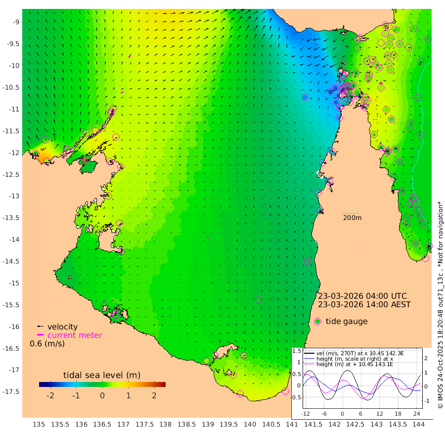 22cm/s 49T +3cm/s rms + 7cm/s -42T. ARA-GOC87 57m 3cm/s -72T +3cm/s rms + 2cm/s -2T. ARA-GOC87 60m 27cm/s 38T +2cm/s rms + 3cm/s 61T. ARA-GOC87 47m 43cm Daru 45cm Bobo Island 9cm Meer Island Barge 17cm Bramble Cay 29cm Unnamed Cay 30cm Pearce Cay 26cm Stephens Island 21cm Merrie England Shoals 32cm Mutacomal Reef 31cm Darnley Island Barge 5cm East Cay 40cm Yorke Island Barge 27cm Rennel Island 37cm Aureed Island 29cm Dungeness Reef 47cm Zagai Island 35cm Yam Island 27cm Dauan Island 35cm Saibai Island 20cm Phipi Reef 48cm Warrior Reef - West -16cm Mabuiag Island Barge 28cm Half Way Island 27cm Coconut Island 31cm Dugong Islet 27cm Poll Island 23cm Kirkcaldie Reef 10cm Suarji Island 36cm Sue Islet -116cm Hawkesbury Island -15cm Alert Patches -3cm Twin Island -99cm Badu Island 5cm St Pauls (Moa Island) -76cm Kubin (Moa Island) -31cm Ince Point -55cm Thursday Island -47cm Nardana Patches -82cm Turtle Head -95cm Round Island -127cm Goods Island -158cm Booby Island -152cm White Rocks Area -137cm Carpentaria 2cm Papou Point -159cm Bampfield Head -136cm Crab Island -148cm Red Wallis Island -109cm Packe Island 28cm Harrington Reef -124cm Herald Camp 11cm Sharp Point -72cm Red Island Point -40cm Possession Island 10cm Alpha Rock 13cm Frederick Point 33cm Wyborn Reef Light 32cm Tetley Island 5cm Triangle Reef 25cm Turtle Head Island 2cm Maclennan Cay -14cm Raine Island 24cm Mcsweeny Reef 20cm Collette Reef 4cm Shadwell Reef 23cm Hannibal Island 8cm Round Point -136cm Vrilya Point 4cm Cape Grenville 7cm Hicks Island 7cm Sir Charles Hardy Island 4cm Harvey Island -5cm Kay Reef -6cm Rocky Island -16cm Chapman Island -10cm Ham Reef -5cm Jubilee Reef -7cm Night Island -15cm Unnamed Reef No. 3 -8cm Morris Island -14cm 1st 3 Mile Opening -10cm Creech Reef -4cm Fife Island -7cm Eden Reef -10cm Stanley Island -3cm Normanby River 7cm Yabooma Island 30cm Hutchison River 19cm Elcho Island 19cm North West Crocodile Island 50cm Cape Wessel 35cm Stevens Island 97cm Guluwuru Island 24cm Hopeful Bay 35cm Auster Point 50cm Two Island Bay 77cm Cadell Strait 175cm Mallison Island 73cm Melville Bay (Gove Harbour) 75cm Truant Island 59cm Cape Arnhem 52cm Cape Grey 45cm Hawk Island 32cm Milner Bay (Groote Eylandt) 30cm Cape Beatrice 20cm West Island 12cm Centre Island 34cm Mornington Island 32cm West Wellesley Islands 41cm Bountiful Island 60cm Albert River Mouth 63cm Sweers Island 49cm Karumba -2cm Nassau River Offshore -30cm Christmas Creek -72cm Archer River -76cm Boyd Point -91cm Weipa (Humbug Point) -95cm Pennefather River -117cm Cullen Point