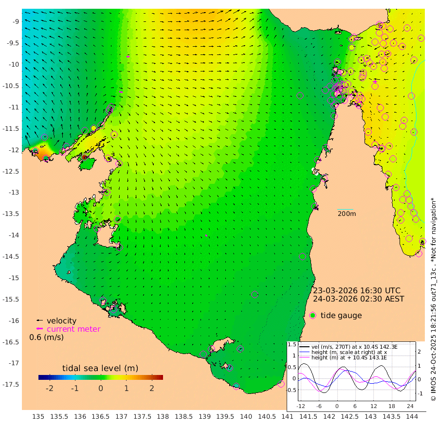 35cm/s 104T +3cm/s rms + 7cm/s -42T. ARA-GOC87 57m 21cm/s 155T +3cm/s rms + 2cm/s -2T. ARA-GOC87 60m 26cm/s 94T +2cm/s rms + 3cm/s 61T. ARA-GOC87 47m 87cm Daru 87cm Bobo Island 63cm Meer Island Barge 67cm Bramble Cay 78cm Unnamed Cay 81cm Pearce Cay 78cm Stephens Island 73cm Merrie England Shoals 75cm Mutacomal Reef 84cm Darnley Island Barge 57cm East Cay 87cm Yorke Island Barge 72cm Rennel Island 84cm Aureed Island 79cm Dungeness Reef 81cm Zagai Island 66cm Yam Island 64cm Dauan Island 61cm Saibai Island 66cm Phipi Reef 81cm Warrior Reef - West 27cm Mabuiag Island Barge 77cm Half Way Island 80cm Coconut Island 76cm Dugong Islet 70cm Poll Island 70cm Kirkcaldie Reef 58cm Suarji Island 74cm Sue Islet -23cm Hawkesbury Island 49cm Alert Patches 53cm Twin Island 0cm Badu Island 57cm St Pauls (Moa Island) 8cm Kubin (Moa Island) 34cm Ince Point 23cm Thursday Island 26cm Nardana Patches 11cm Turtle Head -5cm Round Island -14cm Goods Island -28cm Booby Island -37cm White Rocks Area -14cm Carpentaria 44cm Papou Point -18cm Bampfield Head -22cm Crab Island -30cm Red Wallis Island -2cm Packe Island 78cm Harrington Reef -18cm Herald Camp 17cm Sharp Point -2cm Red Island Point 29cm Possession Island 50cm Alpha Rock 65cm Frederick Point 78cm Wyborn Reef Light 76cm Tetley Island 55cm Triangle Reef 85cm Turtle Head Island 54cm Maclennan Cay 44cm Raine Island 76cm Mcsweeny Reef 72cm Collette Reef 59cm Shadwell Reef 79cm Hannibal Island 63cm Round Point -18cm Vrilya Point 58cm Cape Grenville 59cm Hicks Island 63cm Sir Charles Hardy Island 20cm Harvey Island 51cm Kay Reef 47cm Rocky Island 42cm Chapman Island 42cm Ham Reef 50cm Jubilee Reef 48cm Night Island 41cm Unnamed Reef No. 3 49cm Morris Island 52cm 1st 3 Mile Opening 51cm Creech Reef 49cm Fife Island 57cm Eden Reef 49cm Stanley Island 47cm Normanby River -58cm Yabooma Island -39cm Hutchison River -50cm Elcho Island -62cm North West Crocodile Island 13cm Cape Wessel -20cm Stevens Island 80cm Guluwuru Island -27cm Hopeful Bay -2cm Auster Point 2cm Two Island Bay 24cm Cadell Strait 223cm Mallison Island 53cm Melville Bay (Gove Harbour) 61cm Truant Island 51cm Cape Arnhem 23cm Cape Grey 8cm Hawk Island -20cm Milner Bay (Groote Eylandt) -29cm Cape Beatrice -50cm West Island -47cm Centre Island -31cm Mornington Island -35cm West Wellesley Islands -54cm Bountiful Island -76cm Albert River Mouth -79cm Sweers Island -77cm Karumba -17cm Nassau River Offshore 4cm Christmas Creek -1cm Archer River 5cm Boyd Point -6cm Weipa (Humbug Point) 1cm Pennefather River -15cm Cullen Point
