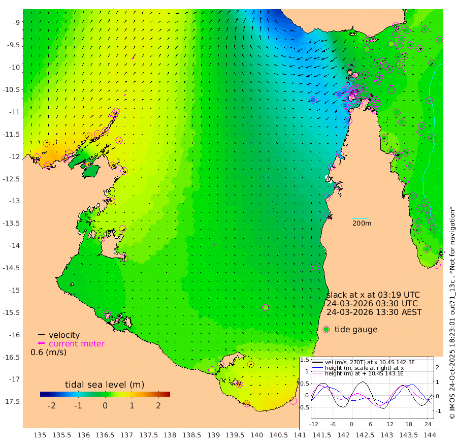 17cm/s 44T +3cm/s rms + 7cm/s -42T. ARA-GOC87 57m 11cm/s -78T +3cm/s rms + 2cm/s -2T. ARA-GOC87 60m 25cm/s 38T +2cm/s rms + 3cm/s 61T. ARA-GOC87 47m 14cm Daru 21cm Bobo Island 9cm Meer Island Barge 9cm Bramble Cay 6cm Unnamed Cay 15cm Pearce Cay 10cm Stephens Island -3cm Merrie England Shoals 0cm Mutacomal Reef 15cm Darnley Island Barge 6cm East Cay 16cm Yorke Island Barge 5cm Rennel Island 17cm Aureed Island 7cm Dungeness Reef 18cm Zagai Island 4cm Yam Island 16cm Dauan Island 14cm Saibai Island 17cm Phipi Reef 24cm Warrior Reef - West -34cm Mabuiag Island Barge 1cm Half Way Island 0cm Coconut Island 1cm Dugong Islet -2cm Poll Island -11cm Kirkcaldie Reef -11cm Suarji Island 0cm Sue Islet -111cm Hawkesbury Island -41cm Alert Patches -32cm Twin Island -93cm Badu Island -26cm St Pauls (Moa Island) -77cm Kubin (Moa Island) -52cm Ince Point -71cm Thursday Island -63cm Nardana Patches -82cm Turtle Head -89cm Round Island -114cm Goods Island -145cm Booby Island -138cm White Rocks Area -149cm Carpentaria -26cm Papou Point -143cm Bampfield Head -130cm Crab Island -140cm Red Wallis Island -104cm Packe Island -5cm Harrington Reef -112cm Herald Camp -4cm Sharp Point -77cm Red Island Point -51cm Possession Island -25cm Alpha Rock -18cm Frederick Point 0cm Wyborn Reef Light -2cm Tetley Island 3cm Triangle Reef -7cm Turtle Head Island 1cm Maclennan Cay -4cm Raine Island 5cm Mcsweeny Reef 4cm Collette Reef 1cm Shadwell Reef 6cm Hannibal Island 2cm Round Point -142cm Vrilya Point -4cm Cape Grenville 6cm Hicks Island 7cm Sir Charles Hardy Island 1cm Harvey Island -7cm Kay Reef 2cm Rocky Island -4cm Chapman Island -3cm Ham Reef 0cm Jubilee Reef -2cm Night Island -8cm Unnamed Reef No. 3 -1cm Morris Island -5cm 1st 3 Mile Opening -4cm Creech Reef 3cm Fife Island 5cm Eden Reef -6cm Stanley Island 2cm Normanby River 85cm Yabooma Island 121cm Hutchison River 98cm Elcho Island 95cm North West Crocodile Island 79cm Cape Wessel 90cm Stevens Island 112cm Guluwuru Island 83cm Hopeful Bay 78cm Auster Point 89cm Two Island Bay 133cm Cadell Strait 119cm Mallison Island 97cm Melville Bay (Gove Harbour) 96cm Truant Island 72cm Cape Arnhem 62cm Cape Grey 59cm Hawk Island 39cm Milner Bay (Groote Eylandt) 38cm Cape Beatrice 15cm West Island 9cm Centre Island 58cm Mornington Island 51cm West Wellesley Islands 89cm Bountiful Island 121cm Albert River Mouth 127cm Sweers Island 109cm Karumba 24cm Nassau River Offshore -12cm Christmas Creek -56cm Archer River -68cm Boyd Point -70cm Weipa (Humbug Point) -99cm Pennefather River -114cm Cullen Point