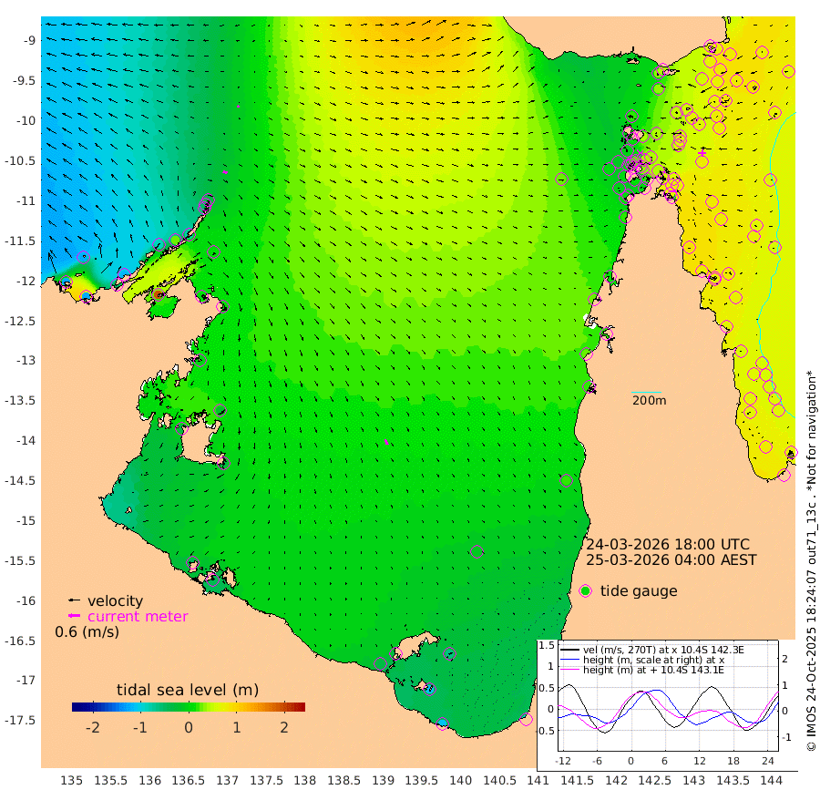 22cm/s 110T +3cm/s rms + 7cm/s -42T. ARA-GOC87 57m 29cm/s 156T +3cm/s rms + 2cm/s -2T. ARA-GOC87 60m 10cm/s 111T +2cm/s rms + 3cm/s 61T. ARA-GOC87 47m 76cm Daru 75cm Bobo Island 73cm Meer Island Barge 73cm Bramble Cay 79cm Unnamed Cay 75cm Pearce Cay 80cm Stephens Island 79cm Merrie England Shoals 72cm Mutacomal Reef 88cm Darnley Island Barge 67cm East Cay 84cm Yorke Island Barge 69cm Rennel Island 77cm Aureed Island 68cm Dungeness Reef 56cm Zagai Island 48cm Yam Island 36cm Dauan Island 39cm Saibai Island 34cm Phipi Reef 55cm Warrior Reef - West 16cm Mabuiag Island Barge 76cm Half Way Island 66cm Coconut Island 75cm Dugong Islet 56cm Poll Island 63cm Kirkcaldie Reef 38cm Suarji Island 64cm Sue Islet -3cm Hawkesbury Island 41cm Alert Patches 43cm Twin Island 3cm Badu Island 41cm St Pauls (Moa Island) 12cm Kubin (Moa Island) 29cm Ince Point 24cm Thursday Island 24cm Nardana Patches 17cm Turtle Head 0cm Round Island 5cm Goods Island 2cm Booby Island -10cm White Rocks Area 27cm Carpentaria 31cm Papou Point 5cm Bampfield Head 1cm Crab Island 0cm Red Wallis Island 12cm Packe Island 72cm Harrington Reef 4cm Herald Camp 12cm Sharp Point 5cm Red Island Point 22cm Possession Island 44cm Alpha Rock 55cm Frederick Point 69cm Wyborn Reef Light 65cm Tetley Island 61cm Triangle Reef 77cm Turtle Head Island 65cm Maclennan Cay 56cm Raine Island 77cm Mcsweeny Reef 76cm Collette Reef 69cm Shadwell Reef 84cm Hannibal Island 70cm Round Point 16cm Vrilya Point 71cm Cape Grenville 67cm Hicks Island 77cm Sir Charles Hardy Island 23cm Harvey Island 69cm Kay Reef 61cm Rocky Island 58cm Chapman Island 60cm Ham Reef 65cm Jubilee Reef 60cm Night Island 60cm Unnamed Reef No. 3 64cm Morris Island 66cm 1st 3 Mile Opening 67cm Creech Reef 62cm Fife Island 75cm Eden Reef 70cm Stanley Island 66cm Normanby River -120cm Yabooma Island -122cm Hutchison River -119cm Elcho Island -127cm North West Crocodile Island -33cm Cape Wessel -84cm Stevens Island 28cm Guluwuru Island -82cm Hopeful Bay -54cm Auster Point -50cm Two Island Bay -52cm Cadell Strait 195cm Mallison Island 4cm Melville Bay (Gove Harbour) 10cm Truant Island 15cm Cape Arnhem -4cm Cape Grey -16cm Hawk Island -36cm Milner Bay (Groote Eylandt) -37cm Cape Beatrice -42cm West Island -41cm Centre Island -36cm Mornington Island -33cm West Wellesley Islands -63cm Bountiful Island -105cm Albert River Mouth -111cm Sweers Island -103cm Karumba -9cm Nassau River Offshore 21cm Christmas Creek 22cm Archer River 29cm Boyd Point 19cm Weipa (Humbug Point) 26cm Pennefather River 15cm Cullen Point