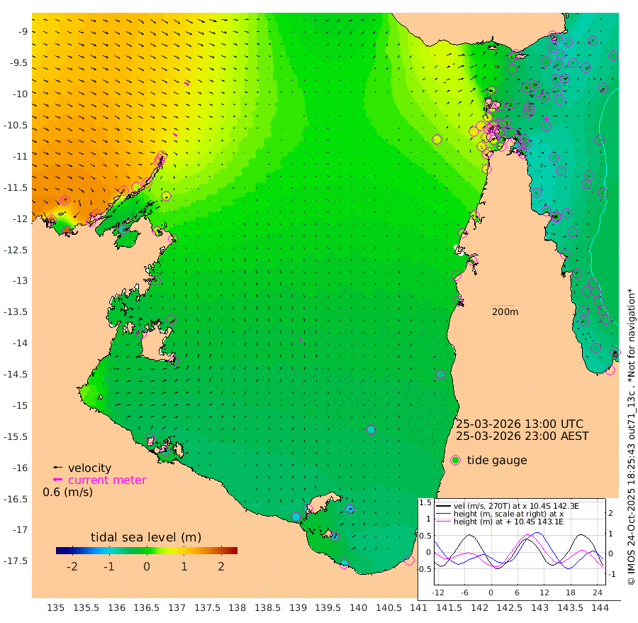 26cm/s 126T +3cm/s rms + 7cm/s -42T. ARA-GOC87 57m 22cm/s 9T +3cm/s rms + 2cm/s -2T. ARA-GOC87 60m 32cm/s 121T +2cm/s rms + 3cm/s 61T. ARA-GOC87 47m -56cm Daru -51cm Bobo Island -53cm Meer Island Barge -56cm Bramble Cay -63cm Unnamed Cay -50cm Pearce Cay -61cm Stephens Island -65cm Merrie England Shoals -57cm Mutacomal Reef -67cm Darnley Island Barge -51cm East Cay -63cm Yorke Island Barge -53cm Rennel Island -56cm Aureed Island -47cm Dungeness Reef -25cm Zagai Island -22cm Yam Island -5cm Dauan Island -9cm Saibai Island -15cm Phipi Reef -32cm Warrior Reef - West 25cm Mabuiag Island Barge -55cm Half Way Island -37cm Coconut Island -57cm Dugong Islet -29cm Poll Island -36cm Kirkcaldie Reef -17cm Suarji Island -38cm Sue Islet 79cm Hawkesbury Island -6cm Alert Patches -5cm Twin Island 77cm Badu Island -2cm St Pauls (Moa Island) 52cm Kubin (Moa Island) 16cm Ince Point 29cm Thursday Island 26cm Nardana Patches 40cm Turtle Head 60cm Round Island 70cm Goods Island 86cm Booby Island 87cm White Rocks Area 63cm Carpentaria 11cm Papou Point 88cm Bampfield Head 79cm Crab Island 81cm Red Wallis Island 55cm Packe Island -48cm Harrington Reef 61cm Herald Camp -9cm Sharp Point 49cm Red Island Point 21cm Possession Island -17cm Alpha Rock -22cm Frederick Point -43cm Wyborn Reef Light -36cm Tetley Island -40cm Triangle Reef -36cm Turtle Head Island -48cm Maclennan Cay -36cm Raine Island -58cm Mcsweeny Reef -60cm Collette Reef -52cm Shadwell Reef -67cm Hannibal Island -52cm Round Point 68cm Vrilya Point -59cm Cape Grenville -51cm Hicks Island -60cm Sir Charles Hardy Island -19cm Harvey Island -56cm Kay Reef -47cm Rocky Island -41cm Chapman Island -43cm Ham Reef -46cm Jubilee Reef -45cm Night Island -42cm Unnamed Reef No. 3 -48cm Morris Island -44cm 1st 3 Mile Opening -48cm Creech Reef -48cm Fife Island -56cm Eden Reef -55cm Stanley Island -55cm Normanby River 169cm Yabooma Island 182cm Hutchison River 164cm Elcho Island 162cm North West Crocodile Island 95cm Cape Wessel 143cm Stevens Island 43cm Guluwuru Island 124cm Hopeful Bay 112cm Auster Point 110cm Two Island Bay 133cm Cadell Strait -79cm Mallison Island 50cm Melville Bay (Gove Harbour) 58cm Truant Island 25cm Cape Arnhem 6cm Cape Grey -7cm Hawk Island -15cm Milner Bay (Groote Eylandt) -31cm Cape Beatrice -61cm West Island -58cm Centre Island -96cm Mornington Island -103cm West Wellesley Islands -105cm Bountiful Island -91cm Albert River Mouth -96cm Sweers Island -91cm Karumba -83cm Nassau River Offshore -63cm Christmas Creek -12cm Archer River 2cm Boyd Point 8cm Weipa (Humbug Point) 29cm Pennefather River 47cm Cullen Point