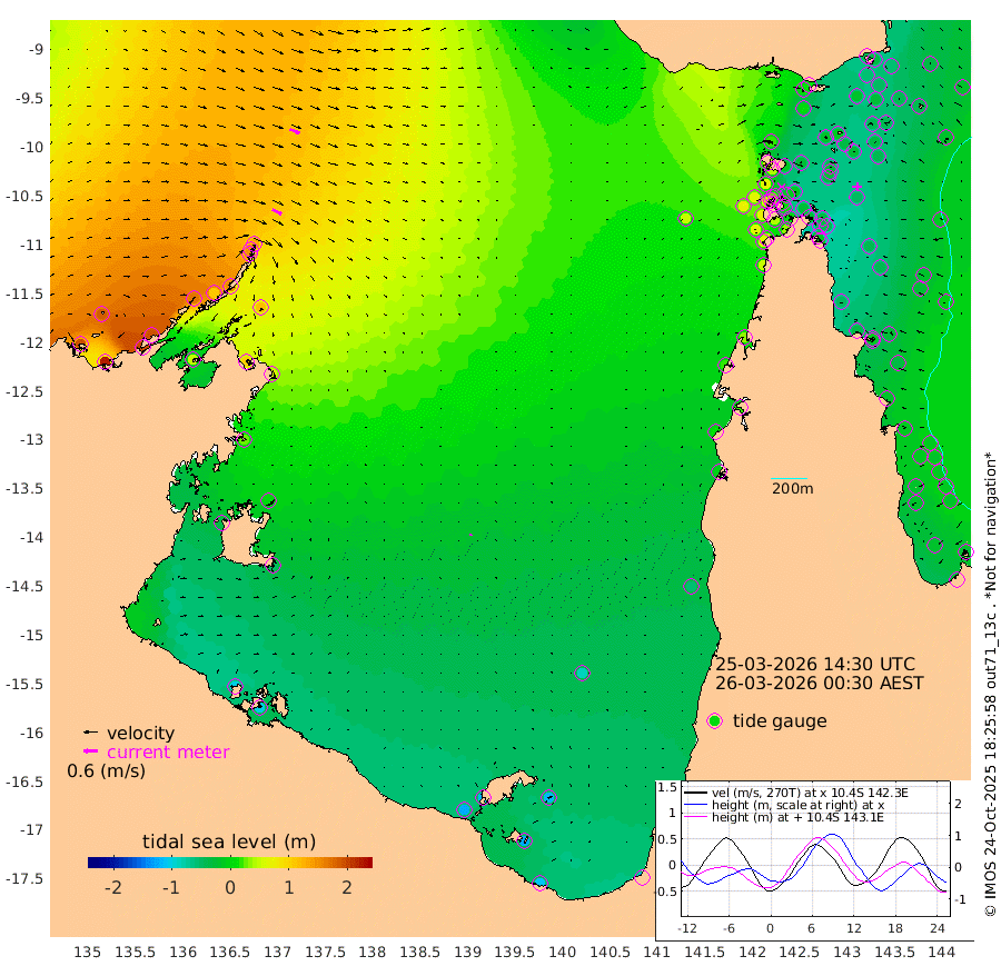 45cm/s 118T +3cm/s rms + 7cm/s -42T. ARA-GOC87 57m 8cm/s 27T +3cm/s rms + 2cm/s -2T. ARA-GOC87 60m 46cm/s 112T +2cm/s rms + 3cm/s 61T. ARA-GOC87 47m -43cm Daru -32cm Bobo Island -20cm Meer Island Barge -31cm Bramble Cay -48cm Unnamed Cay -28cm Pearce Cay -39cm Stephens Island -54cm Merrie England Shoals -53cm Mutacomal Reef -38cm Darnley Island Barge -22cm East Cay -40cm Yorke Island Barge -42cm Rennel Island -36cm Aureed Island -35cm Dungeness Reef -14cm Zagai Island -20cm Yam Island 14cm Dauan Island 8cm Saibai Island 0cm Phipi Reef -17cm Warrior Reef - West 17cm Mabuiag Island Barge -43cm Half Way Island -30cm Coconut Island -48cm Dugong Islet -27cm Poll Island -36cm Kirkcaldie Reef -23cm Suarji Island -34cm Sue Islet 61cm Hawkesbury Island -18cm Alert Patches -14cm Twin Island 68cm Badu Island -10cm St Pauls (Moa Island) 43cm Kubin (Moa Island) 3cm Ince Point 15cm Thursday Island 12cm Nardana Patches 30cm Turtle Head 42cm Round Island 59cm Goods Island 69cm Booby Island 63cm White Rocks Area 45cm Carpentaria 2cm Papou Point 69cm Bampfield Head 62cm Crab Island 62cm Red Wallis Island 43cm Packe Island -47cm Harrington Reef 45cm Herald Camp -15cm Sharp Point 33cm Red Island Point 7cm Possession Island -28cm Alpha Rock -26cm Frederick Point -39cm Wyborn Reef Light -35cm Tetley Island -14cm Triangle Reef -29cm Turtle Head Island -21cm Maclennan Cay -6cm Raine Island -41cm Mcsweeny Reef -41cm Collette Reef -25cm Shadwell Reef -45cm Hannibal Island -31cm Round Point 50cm Vrilya Point -39cm Cape Grenville -24cm Hicks Island -26cm Sir Charles Hardy Island -11cm Harvey Island -32cm Kay Reef -18cm Rocky Island -9cm Chapman Island -13cm Ham Reef -14cm Jubilee Reef -18cm Night Island -13cm Unnamed Reef No. 3 -18cm Morris Island -12cm 1st 3 Mile Opening -17cm Creech Reef -19cm Fife Island -15cm Eden Reef -26cm Stanley Island -25cm Normanby River 190cm Yabooma Island 222cm Hutchison River 191cm Elcho Island 181cm North West Crocodile Island 132cm Cape Wessel 172cm Stevens Island 112cm Guluwuru Island 150cm Hopeful Bay 143cm Auster Point 147cm Two Island Bay 197cm Cadell Strait 50cm Mallison Island 104cm Melville Bay (Gove Harbour) 115cm Truant Island 67cm Cape Arnhem 25cm Cape Grey 2cm Hawk Island -31cm Milner Bay (Groote Eylandt) -49cm Cape Beatrice -103cm West Island -101cm Centre Island -113cm Mornington Island -122cm West Wellesley Islands -120cm Bountiful Island -112cm Albert River Mouth -124cm Sweers Island -115cm Karumba -85cm Nassau River Offshore -55cm Christmas Creek -6cm Archer River 8cm Boyd Point 15cm Weipa (Humbug Point) 21cm Pennefather River 37cm Cullen Point