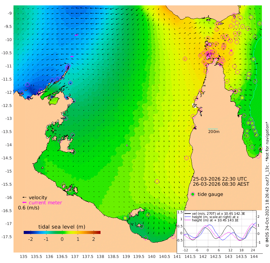 44cm/s -92T +3cm/s rms + 7cm/s -42T. ARA-GOC87 57m 27cm/s 176T +3cm/s rms + 2cm/s -2T. ARA-GOC87 60m 53cm/s -100T +2cm/s rms + 3cm/s 61T. ARA-GOC87 47m 84cm Daru 63cm Bobo Island 25cm Meer Island Barge 46cm Bramble Cay 75cm Unnamed Cay 65cm Pearce Cay 61cm Stephens Island 79cm Merrie England Shoals 96cm Mutacomal Reef 48cm Darnley Island Barge 33cm East Cay 62cm Yorke Island Barge 82cm Rennel Island 67cm Aureed Island 92cm Dungeness Reef 78cm Zagai Island 96cm Yam Island 88cm Dauan Island 74cm Saibai Island 100cm Phipi Reef 91cm Warrior Reef - West 98cm Mabuiag Island Barge 81cm Half Way Island 89cm Coconut Island 94cm Dugong Islet 99cm Poll Island 106cm Kirkcaldie Reef 119cm Suarji Island 92cm Sue Islet 128cm Hawkesbury Island 131cm Alert Patches 119cm Twin Island 118cm Badu Island 120cm St Pauls (Moa Island) 119cm Kubin (Moa Island) 124cm Ince Point 127cm Thursday Island 126cm Nardana Patches 131cm Turtle Head 117cm Round Island 128cm Goods Island 130cm Booby Island 133cm White Rocks Area 105cm Carpentaria 96cm Papou Point 124cm Bampfield Head 105cm Crab Island 131cm Red Wallis Island 135cm Packe Island 103cm Harrington Reef 129cm Herald Camp 36cm Sharp Point 109cm Red Island Point 110cm Possession Island 108cm Alpha Rock 110cm Frederick Point 90cm Wyborn Reef Light 94cm Tetley Island 37cm Triangle Reef 88cm Turtle Head Island 38cm Maclennan Cay 20cm Raine Island 70cm Mcsweeny Reef 61cm Collette Reef 37cm Shadwell Reef 62cm Hannibal Island 53cm Round Point 103cm Vrilya Point 53cm Cape Grenville 38cm Hicks Island 42cm Sir Charles Hardy Island 15cm Harvey Island 41cm Kay Reef 27cm Rocky Island 22cm Chapman Island 20cm Ham Reef 23cm Jubilee Reef 29cm Night Island 26cm Unnamed Reef No. 3 28cm Morris Island 27cm 1st 3 Mile Opening 28cm Creech Reef 27cm Fife Island 17cm Eden Reef 31cm Stanley Island 26cm Normanby River -158cm Yabooma Island -188cm Hutchison River -168cm Elcho Island -157cm North West Crocodile Island -144cm Cape Wessel -164cm Stevens Island -151cm Guluwuru Island -150cm Hopeful Bay -145cm Auster Point -157cm Two Island Bay -201cm Cadell Strait -179cm Mallison Island -129cm Melville Bay (Gove Harbour) -139cm Truant Island -93cm Cape Arnhem -64cm Cape Grey -47cm Hawk Island -33cm Milner Bay (Groote Eylandt) -11cm Cape Beatrice 28cm West Island 24cm Centre Island 34cm Mornington Island 41cm West Wellesley Islands 34cm Bountiful Island -6cm Albert River Mouth -17cm Sweers Island 12cm Karumba 68cm Nassau River Offshore 84cm Christmas Creek 80cm Archer River 81cm Boyd Point 87cm Weipa (Humbug Point) 80cm Pennefather River 95cm Cullen Point