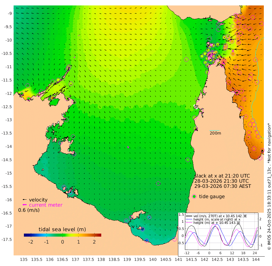 17cm/s 127T +3cm/s rms + 7cm/s -42T. ARA-GOC87 57m 34cm/s 164T +3cm/s rms + 2cm/s -2T. ARA-GOC87 60m 8cm/s 153T +2cm/s rms + 3cm/s 61T. ARA-GOC87 47m 134cm Daru 141cm Bobo Island 134cm Meer Island Barge 155cm Bramble Cay 156cm Unnamed Cay 159cm Pearce Cay 161cm Stephens Island 166cm Merrie England Shoals 146cm Mutacomal Reef 152cm Darnley Island Barge 148cm East Cay 141cm Yorke Island Barge 146cm Rennel Island 136cm Aureed Island 118cm Dungeness Reef 50cm Zagai Island 62cm Yam Island -7cm Dauan Island -7cm Saibai Island 0cm Phipi Reef 53cm Warrior Reef - West 4cm Mabuiag Island Barge 149cm Half Way Island 117cm Coconut Island 144cm Dugong Islet 93cm Poll Island 107cm Kirkcaldie Reef 52cm Suarji Island 86cm Sue Islet 56cm Hawkesbury Island 66cm Alert Patches 72cm Twin Island 25cm Badu Island 52cm St Pauls (Moa Island) 49cm Kubin (Moa Island) 50cm Ince Point 46cm Thursday Island 44cm Nardana Patches 47cm Turtle Head 32cm Round Island 48cm Goods Island 40cm Booby Island 46cm White Rocks Area 33cm Carpentaria 50cm Papou Point 39cm Bampfield Head 25cm Crab Island 45cm Red Wallis Island 58cm Packe Island 146cm Harrington Reef 43cm Herald Camp 2cm Sharp Point 44cm Red Island Point 46cm Possession Island 73cm Alpha Rock 101cm Frederick Point 135cm Wyborn Reef Light 124cm Tetley Island 115cm Triangle Reef 155cm Turtle Head Island 131cm Maclennan Cay 114cm Raine Island 149cm Mcsweeny Reef 143cm Collette Reef 124cm Shadwell Reef 160cm Hannibal Island 163cm Round Point 31cm Vrilya Point 151cm Cape Grenville 143cm Hicks Island 149cm Sir Charles Hardy Island 46cm Harvey Island 150cm Kay Reef 129cm Rocky Island 126cm Chapman Island 122cm Ham Reef 127cm Jubilee Reef 118cm Night Island 127cm Unnamed Reef No. 3 136cm Morris Island 121cm 1st 3 Mile Opening 131cm Creech Reef 139cm Fife Island 154cm Eden Reef 143cm Stanley Island 160cm Normanby River 15cm Yabooma Island 17cm Hutchison River 0cm Elcho Island -4cm North West Crocodile Island 36cm Cape Wessel 18cm Stevens Island 53cm Guluwuru Island 14cm Hopeful Bay 25cm Auster Point 32cm Two Island Bay 48cm Cadell Strait 139cm Mallison Island 36cm Melville Bay (Gove Harbour) 43cm Truant Island 21cm Cape Arnhem -5cm Cape Grey -22cm Hawk Island -62cm Milner Bay (Groote Eylandt) -55cm Cape Beatrice -77cm West Island -87cm Centre Island -75cm Mornington Island -66cm West Wellesley Islands -88cm Bountiful Island -151cm Albert River Mouth -163cm Sweers Island -138cm Karumba -20cm Nassau River Offshore 17cm Christmas Creek 31cm Archer River 37cm Boyd Point 34cm Weipa (Humbug Point) 28cm Pennefather River 27cm Cullen Point