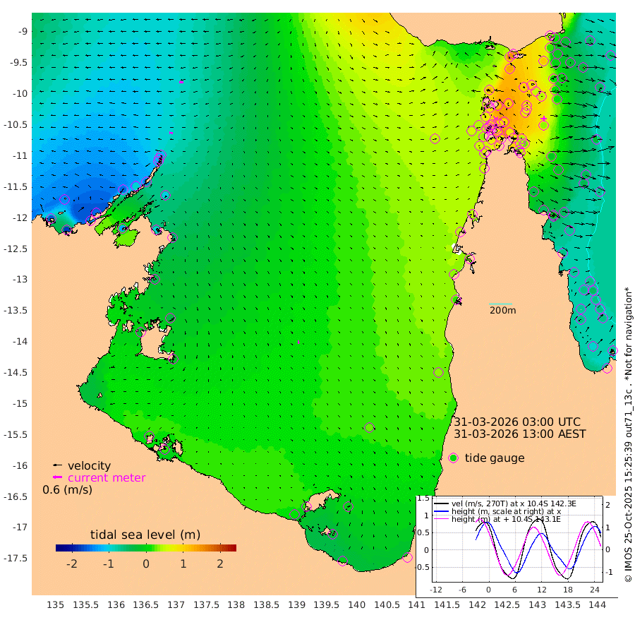 23cm/s -86T +3cm/s rms + 7cm/s -42T. ARA-GOC87 57m 20cm/s 173T +3cm/s rms + 2cm/s -2T. ARA-GOC87 60m 30cm/s -91T +2cm/s rms + 3cm/s 61T. ARA-GOC87 47m 31cm Daru 13cm Bobo Island -52cm Meer Island Barge -47cm Bramble Cay -13cm Unnamed Cay -4cm Pearce Cay -22cm Stephens Island -24cm Merrie England Shoals 19cm Mutacomal Reef -24cm Darnley Island Barge -59cm East Cay 6cm Yorke Island Barge 9cm Rennel Island 13cm Aureed Island 47cm Dungeness Reef 97cm Zagai Island 101cm Yam Island 143cm Dauan Island 133cm Saibai Island 132cm Phipi Reef 112cm Warrior Reef - West 115cm Mabuiag Island Barge 14cm Half Way Island 40cm Coconut Island 34cm Dugong Islet 73cm Poll Island 71cm Kirkcaldie Reef 100cm Suarji Island 77cm Sue Islet 76cm Hawkesbury Island 98cm Alert Patches 97cm Twin Island 85cm Badu Island 119cm St Pauls (Moa Island) 85cm Kubin (Moa Island) 102cm Ince Point 97cm Thursday Island 100cm Nardana Patches 83cm Turtle Head 67cm Round Island 59cm Goods Island 54cm Booby Island 45cm White Rocks Area 48cm Carpentaria 96cm Papou Point 31cm Bampfield Head 52cm Crab Island 60cm Red Wallis Island 73cm Packe Island 38cm Harrington Reef 67cm Herald Camp 48cm Sharp Point 77cm Red Island Point 80cm Possession Island 81cm Alpha Rock 73cm Frederick Point 27cm Wyborn Reef Light 42cm Tetley Island -28cm Triangle Reef 24cm Turtle Head Island -42cm Maclennan Cay -64cm Raine Island -10cm Mcsweeny Reef -22cm Collette Reef -44cm Shadwell Reef -32cm Hannibal Island -51cm Round Point 53cm Vrilya Point -48cm Cape Grenville -50cm Hicks Island -51cm Sir Charles Hardy Island -13cm Harvey Island -69cm Kay Reef -65cm Rocky Island -74cm Chapman Island -66cm Ham Reef -62cm Jubilee Reef -52cm Night Island -67cm Unnamed Reef No. 3 -69cm Morris Island -64cm 1st 3 Mile Opening -63cm Creech Reef -67cm Fife Island -91cm Eden Reef -74cm Stanley Island -83cm Normanby River -161cm Yabooma Island -174cm Hutchison River -156cm Elcho Island -141cm North West Crocodile Island -115cm Cape Wessel -150cm Stevens Island -97cm Guluwuru Island -148cm Hopeful Bay -126cm Auster Point -116cm Two Island Bay -139cm Cadell Strait -127cm Mallison Island -94cm Melville Bay (Gove Harbour) -99cm Truant Island -60cm Cape Arnhem -44cm Cape Grey -31cm Hawk Island -25cm Milner Bay (Groote Eylandt) -10cm Cape Beatrice 18cm West Island 16cm Centre Island 20cm Mornington Island 14cm West Wellesley Islands -2cm Bountiful Island -7cm Albert River Mouth -24cm Sweers Island 8cm Karumba 29cm Nassau River Offshore 34cm Christmas Creek 22cm Archer River 33cm Boyd Point 23cm Weipa (Humbug Point) 38cm Pennefather River 47cm Cullen Point