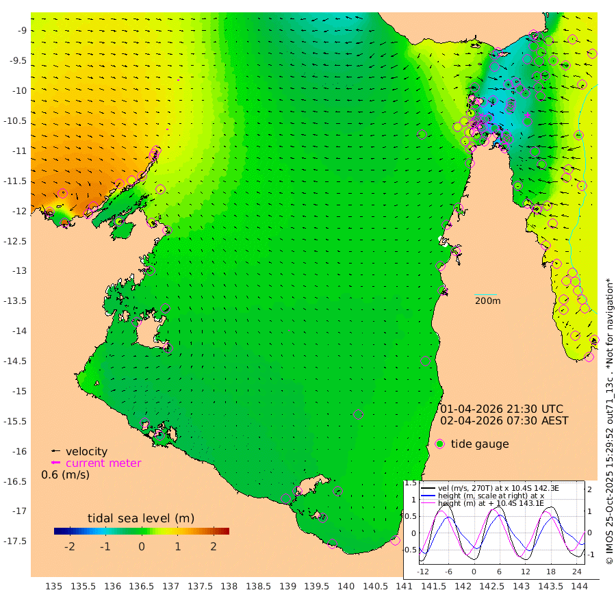 6cm/s -163T +3cm/s rms + 7cm/s -42T. ARA-GOC87 57m 6cm/s -141T +3cm/s rms + 2cm/s -2T. ARA-GOC87 60m 7cm/s 174T +2cm/s rms + 3cm/s 61T. ARA-GOC87 47m -19cm Daru -16cm Bobo Island 41cm Meer Island Barge 41cm Bramble Cay 18cm Unnamed Cay 3cm Pearce Cay 18cm Stephens Island 26cm Merrie England Shoals -1cm Mutacomal Reef 16cm Darnley Island Barge 48cm East Cay -6cm Yorke Island Barge 1cm Rennel Island -15cm Aureed Island -27cm Dungeness Reef -68cm Zagai Island -56cm Yam Island -70cm Dauan Island -71cm Saibai Island -74cm Phipi Reef -69cm Warrior Reef - West -44cm Mabuiag Island Barge -5cm Half Way Island -30cm Coconut Island -15cm Dugong Islet -42cm Poll Island -41cm Kirkcaldie Reef -60cm Suarji Island -47cm Sue Islet 39cm Hawkesbury Island -45cm Alert Patches -48cm Twin Island 10cm Badu Island -63cm St Pauls (Moa Island) 7cm Kubin (Moa Island) -35cm Ince Point -24cm Thursday Island -27cm Nardana Patches 1cm Turtle Head 18cm Round Island 38cm Goods Island 46cm Booby Island 52cm White Rocks Area 19cm Carpentaria -51cm Papou Point 54cm Bampfield Head 24cm Crab Island 41cm Red Wallis Island 24cm Packe Island -26cm Harrington Reef 39cm Herald Camp -33cm Sharp Point -7cm Red Island Point -29cm Possession Island -36cm Alpha Rock -39cm Frederick Point -10cm Wyborn Reef Light -19cm Tetley Island 28cm Triangle Reef -12cm Turtle Head Island 39cm Maclennan Cay 54cm Raine Island 11cm Mcsweeny Reef 20cm Collette Reef 38cm Shadwell Reef 26cm Hannibal Island 47cm Round Point 15cm Vrilya Point 44cm Cape Grenville 42cm Hicks Island 53cm Sir Charles Hardy Island 10cm Harvey Island 61cm Kay Reef 57cm Rocky Island 64cm Chapman Island 58cm Ham Reef 53cm Jubilee Reef 44cm Night Island 58cm Unnamed Reef No. 3 60cm Morris Island 54cm 1st 3 Mile Opening 53cm Creech Reef 55cm Fife Island 74cm Eden Reef 63cm Stanley Island 71cm Normanby River 170cm Yabooma Island 174cm Hutchison River 155cm Elcho Island 148cm North West Crocodile Island 89cm Cape Wessel 136cm Stevens Island 55cm Guluwuru Island 135cm Hopeful Bay 102cm Auster Point 102cm Two Island Bay 118cm Cadell Strait 43cm Mallison Island 60cm Melville Bay (Gove Harbour) 61cm Truant Island 27cm Cape Arnhem 10cm Cape Grey 3cm Hawk Island -16cm Milner Bay (Groote Eylandt) -18cm Cape Beatrice -45cm West Island -53cm Centre Island -46cm Mornington Island -37cm West Wellesley Islands -12cm Bountiful Island -25cm Albert River Mouth -30cm Sweers Island -32cm Karumba -17cm Nassau River Offshore -4cm Christmas Creek 18cm Archer River 17cm Boyd Point 34cm Weipa (Humbug Point) 2cm Pennefather River 22cm Cullen Point
