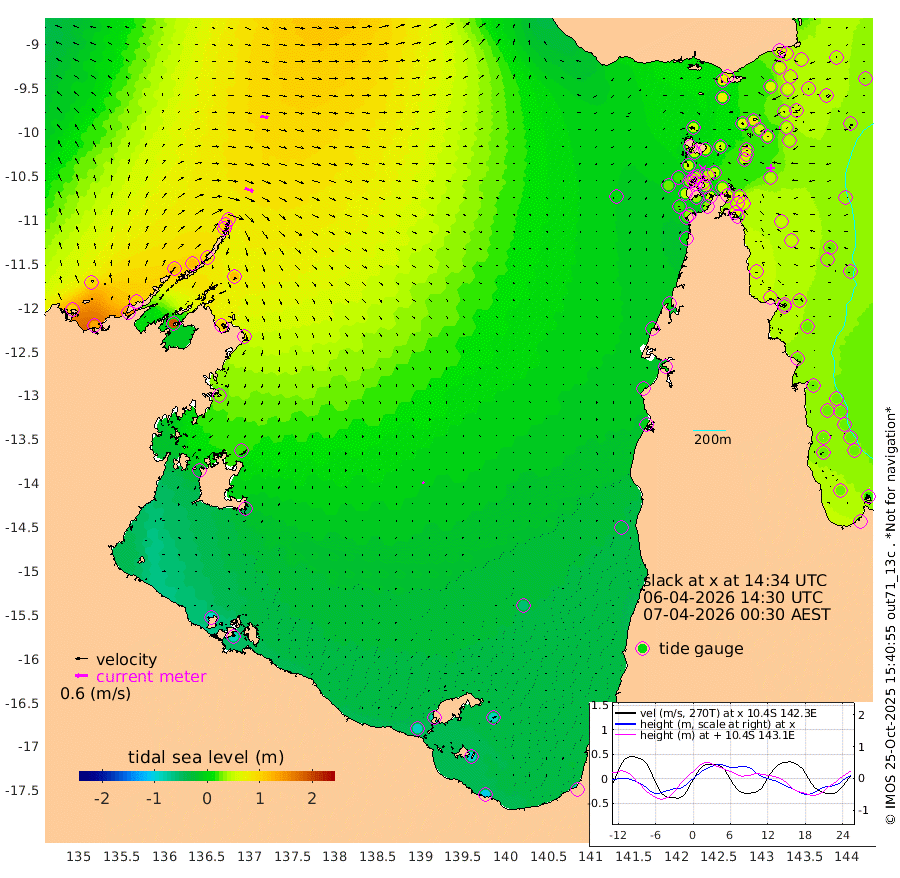 42cm/s 110T +3cm/s rms + 7cm/s -42T. ARA-GOC87 57m 6cm/s 132T +3cm/s rms + 2cm/s -2T. ARA-GOC87 60m 38cm/s 100T +2cm/s rms + 3cm/s 61T. ARA-GOC87 47m 60cm Daru 62cm Bobo Island 32cm Meer Island Barge 44cm Bramble Cay 51cm Unnamed Cay 55cm Pearce Cay 44cm Stephens Island 48cm Merrie England Shoals 56cm Mutacomal Reef 44cm Darnley Island Barge 33cm East Cay 50cm Yorke Island Barge 47cm Rennel Island 50cm Aureed Island 52cm Dungeness Reef 68cm Zagai Island 56cm Yam Island 68cm Dauan Island 67cm Saibai Island 73cm Phipi Reef 67cm Warrior Reef - West 52cm Mabuiag Island Barge 41cm Half Way Island 62cm Coconut Island 40cm Dugong Islet 54cm Poll Island 48cm Kirkcaldie Reef 51cm Suarji Island 54cm Sue Islet 45cm Hawkesbury Island 51cm Alert Patches 52cm Twin Island 58cm Badu Island 54cm St Pauls (Moa Island) 46cm Kubin (Moa Island) 45cm Ince Point 41cm Thursday Island 43cm Nardana Patches 40cm Turtle Head 51cm Round Island 35cm Goods Island 23cm Booby Island 20cm White Rocks Area 2cm Carpentaria 51cm Papou Point 50cm Bampfield Head 22cm Crab Island 19cm Red Wallis Island 37cm Packe Island 48cm Harrington Reef 35cm Herald Camp 11cm Sharp Point 37cm Red Island Point 52cm Possession Island 47cm Alpha Rock 54cm Frederick Point 66cm Wyborn Reef Light 67cm Tetley Island 37cm Triangle Reef 65cm Turtle Head Island 26cm Maclennan Cay 26cm Raine Island 46cm Mcsweeny Reef 45cm Collette Reef 35cm Shadwell Reef 49cm Hannibal Island 46cm Round Point 9cm Vrilya Point 32cm Cape Grenville 35cm Hicks Island 33cm Sir Charles Hardy Island 9cm Harvey Island 29cm Kay Reef 27cm Rocky Island 29cm Chapman Island 24cm Ham Reef 26cm Jubilee Reef 23cm Night Island 23cm Unnamed Reef No. 3 26cm Morris Island 24cm 1st 3 Mile Opening 23cm Creech Reef 23cm Fife Island 28cm Eden Reef 22cm Stanley Island 22cm Normanby River 100cm Yabooma Island 133cm Hutchison River 102cm Elcho Island 90cm North West Crocodile Island 94cm Cape Wessel 116cm Stevens Island 118cm Guluwuru Island 100cm Hopeful Bay 98cm Auster Point 96cm Two Island Bay 140cm Cadell Strait 195cm Mallison Island 103cm Melville Bay (Gove Harbour) 113cm Truant Island 74cm Cape Arnhem 34cm Cape Grey 21cm Hawk Island -26cm Milner Bay (Groote Eylandt) -44cm Cape Beatrice -94cm West Island -89cm Centre Island -75cm Mornington Island -88cm West Wellesley Islands -87cm Bountiful Island -98cm Albert River Mouth -96cm Sweers Island -92cm Karumba -56cm Nassau River Offshore -28cm Christmas Creek -2cm Archer River 4cm Boyd Point 3cm Weipa (Humbug Point) 9cm Pennefather River 8cm Cullen Point