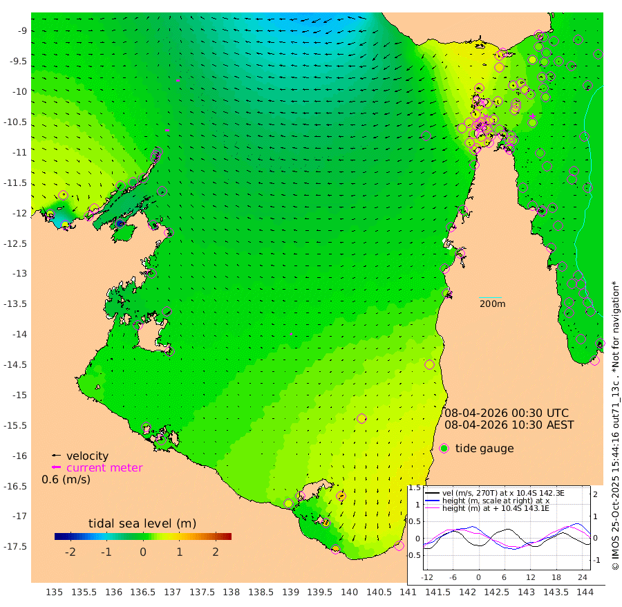 25cm/s -91T +3cm/s rms + 7cm/s -42T. ARA-GOC87 57m 15cm/s -129T +3cm/s rms + 2cm/s -2T. ARA-GOC87 60m 23cm/s -94T +2cm/s rms + 3cm/s 61T. ARA-GOC87 47m 33cm Daru 22cm Bobo Island 0cm Meer Island Barge 8cm Bramble Cay 19cm Unnamed Cay 26cm Pearce Cay 16cm Stephens Island 13cm Merrie England Shoals 26cm Mutacomal Reef 7cm Darnley Island Barge 2cm East Cay 16cm Yorke Island Barge 28cm Rennel Island 21cm Aureed Island 45cm Dungeness Reef 41cm Zagai Island 51cm Yam Island 70cm Dauan Island 48cm Saibai Island 89cm Phipi Reef 57cm Warrior Reef - West 52cm Mabuiag Island Barge 25cm Half Way Island 30cm Coconut Island 33cm Dugong Islet 42cm Poll Island 46cm Kirkcaldie Reef 59cm Suarji Island 33cm Sue Islet 60cm Hawkesbury Island 54cm Alert Patches 47cm Twin Island 67cm Badu Island 56cm St Pauls (Moa Island) 58cm Kubin (Moa Island) 53cm Ince Point 52cm Thursday Island 54cm Nardana Patches 61cm Turtle Head 50cm Round Island 58cm Goods Island 44cm Booby Island 49cm White Rocks Area -13cm Carpentaria 46cm Papou Point 24cm Bampfield Head 31cm Crab Island 38cm Red Wallis Island 51cm Packe Island 33cm Harrington Reef 47cm Herald Camp 14cm Sharp Point 56cm Red Island Point 48cm Possession Island 30cm Alpha Rock 40cm Frederick Point 23cm Wyborn Reef Light 25cm Tetley Island 3cm Triangle Reef 30cm Turtle Head Island 6cm Maclennan Cay -2cm Raine Island 16cm Mcsweeny Reef 9cm Collette Reef 0cm Shadwell Reef 9cm Hannibal Island 7cm Round Point 11cm Vrilya Point 3cm Cape Grenville 7cm Hicks Island 3cm Sir Charles Hardy Island 2cm Harvey Island -5cm Kay Reef 0cm Rocky Island -8cm Chapman Island -9cm Ham Reef -4cm Jubilee Reef -2cm Night Island -10cm Unnamed Reef No. 3 0cm Morris Island 1cm 1st 3 Mile Opening -3cm Creech Reef -5cm Fife Island -7cm Eden Reef -6cm Stanley Island -3cm Normanby River 51cm Yabooma Island 65cm Hutchison River 49cm Elcho Island 59cm North West Crocodile Island -24cm Cape Wessel 14cm Stevens Island -28cm Guluwuru Island 12cm Hopeful Bay -2cm Auster Point -2cm Two Island Bay 21cm Cadell Strait -188cm Mallison Island -14cm Melville Bay (Gove Harbour) -26cm Truant Island -19cm Cape Arnhem 2cm Cape Grey 6cm Hawk Island 5cm Milner Bay (Groote Eylandt) 20cm Cape Beatrice 23cm West Island 15cm Centre Island 64cm Mornington Island 58cm West Wellesley Islands 108cm Bountiful Island 120cm Albert River Mouth 111cm Sweers Island 126cm Karumba 72cm Nassau River Offshore 55cm Christmas Creek 34cm Archer River 21cm Boyd Point 37cm Weipa (Humbug Point) 9cm Pennefather River 13cm Cullen Point