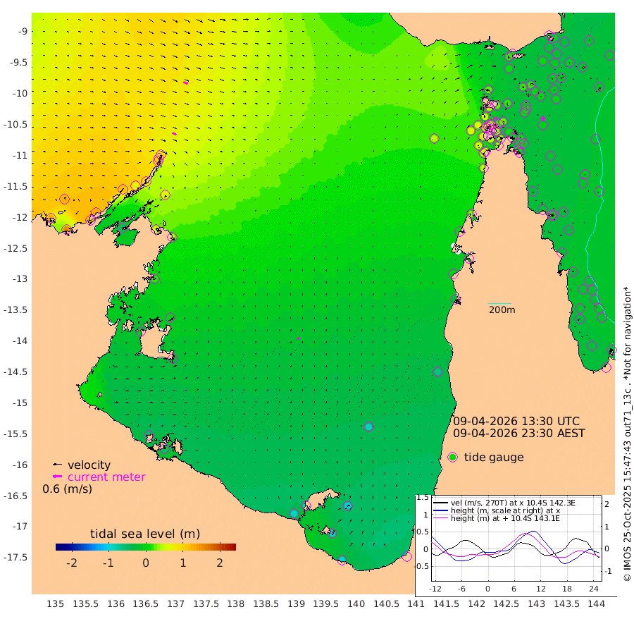 29cm/s 118T +3cm/s rms + 7cm/s -42T. ARA-GOC87 57m 17cm/s 14T +3cm/s rms + 2cm/s -2T. ARA-GOC87 60m 32cm/s 114T +2cm/s rms + 3cm/s 61T. ARA-GOC87 47m -8cm Daru -7cm Bobo Island -17cm Meer Island Barge -21cm Bramble Cay -17cm Unnamed Cay -10cm Pearce Cay -14cm Stephens Island -24cm Merrie England Shoals -17cm Mutacomal Reef -20cm Darnley Island Barge -22cm East Cay -14cm Yorke Island Barge -9cm Rennel Island -11cm Aureed Island 1cm Dungeness Reef 16cm Zagai Island 17cm Yam Island 21cm Dauan Island 7cm Saibai Island 14cm Phipi Reef 7cm Warrior Reef - West 28cm Mabuiag Island Barge -5cm Half Way Island 3cm Coconut Island -5cm Dugong Islet 11cm Poll Island 8cm Kirkcaldie Reef 19cm Suarji Island -1cm Sue Islet 54cm Hawkesbury Island 19cm Alert Patches 23cm Twin Island 57cm Badu Island 30cm St Pauls (Moa Island) 55cm Kubin (Moa Island) 32cm Ince Point 39cm Thursday Island 37cm Nardana Patches 42cm Turtle Head 58cm Round Island 56cm Goods Island 63cm Booby Island 62cm White Rocks Area 50cm Carpentaria 34cm Papou Point 78cm Bampfield Head 56cm Crab Island 56cm Red Wallis Island 48cm Packe Island 0cm Harrington Reef 57cm Herald Camp 1cm Sharp Point 33cm Red Island Point 39cm Possession Island 9cm Alpha Rock 12cm Frederick Point -3cm Wyborn Reef Light 1cm Tetley Island -15cm Triangle Reef 14cm Turtle Head Island -15cm Maclennan Cay -15cm Raine Island -16cm Mcsweeny Reef -23cm Collette Reef -22cm Shadwell Reef -25cm Hannibal Island -22cm Round Point 45cm Vrilya Point -26cm Cape Grenville -16cm Hicks Island -24cm Sir Charles Hardy Island -6cm Harvey Island -31cm Kay Reef -24cm Rocky Island -29cm Chapman Island -26cm Ham Reef -21cm Jubilee Reef -19cm Night Island -27cm Unnamed Reef No. 3 -22cm Morris Island -12cm 1st 3 Mile Opening -21cm Creech Reef -27cm Fife Island -27cm Eden Reef -27cm Stanley Island -28cm Normanby River 134cm Yabooma Island 154cm Hutchison River 132cm Elcho Island 125cm North West Crocodile Island 84cm Cape Wessel 114cm Stevens Island 66cm Guluwuru Island 93cm Hopeful Bay 97cm Auster Point 105cm Two Island Bay 120cm Cadell Strait -50cm Mallison Island 62cm Melville Bay (Gove Harbour) 71cm Truant Island 40cm Cape Arnhem 16cm Cape Grey -1cm Hawk Island -10cm Milner Bay (Groote Eylandt) -27cm Cape Beatrice -57cm West Island -53cm Centre Island -88cm Mornington Island -95cm West Wellesley Islands -104cm Bountiful Island -92cm Albert River Mouth -103cm Sweers Island -98cm Karumba -83cm Nassau River Offshore -61cm Christmas Creek -25cm Archer River -3cm Boyd Point -2cm Weipa (Humbug Point) 15cm Pennefather River 31cm Cullen Point