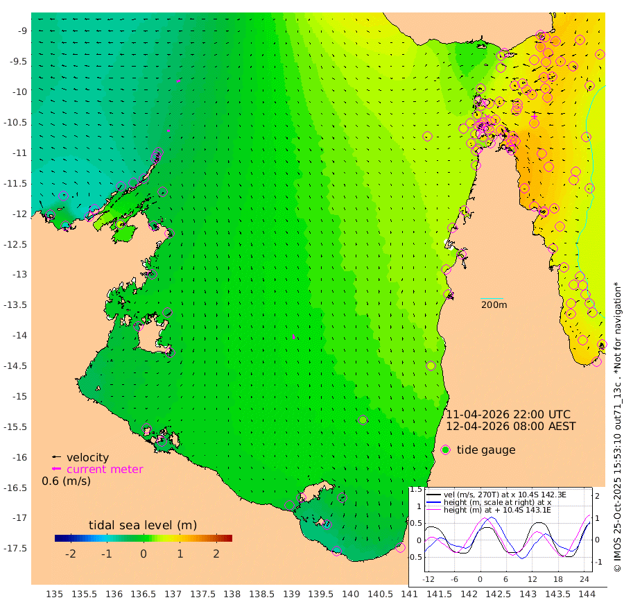 17cm/s -102T +3cm/s rms + 7cm/s -42T. ARA-GOC87 57m 32cm/s 170T +3cm/s rms + 2cm/s -2T. ARA-GOC87 60m 27cm/s -102T +2cm/s rms + 3cm/s 61T. ARA-GOC87 47m 117cm Daru 108cm Bobo Island 70cm Meer Island Barge 100cm Bramble Cay 119cm Unnamed Cay 110cm Pearce Cay 108cm Stephens Island 128cm Merrie England Shoals 134cm Mutacomal Reef 95cm Darnley Island Barge 84cm East Cay 101cm Yorke Island Barge 116cm Rennel Island 104cm Aureed Island 106cm Dungeness Reef 76cm Zagai Island 90cm Yam Island 54cm Dauan Island 51cm Saibai Island 59cm Phipi Reef 88cm Warrior Reef - West 59cm Mabuiag Island Barge 113cm Half Way Island 112cm Coconut Island 118cm Dugong Islet 104cm Poll Island 108cm Kirkcaldie Reef 94cm Suarji Island 96cm Sue Islet 83cm Hawkesbury Island 103cm Alert Patches 103cm Twin Island 66cm Badu Island 93cm St Pauls (Moa Island) 82cm Kubin (Moa Island) 90cm Ince Point 86cm Thursday Island 86cm Nardana Patches 84cm Turtle Head 75cm Round Island 75cm Goods Island 67cm Booby Island 75cm White Rocks Area 54cm Carpentaria 77cm Papou Point 72cm Bampfield Head 50cm Crab Island 79cm Red Wallis Island 99cm Packe Island 127cm Harrington Reef 83cm Herald Camp 24cm Sharp Point 69cm Red Island Point 79cm Possession Island 106cm Alpha Rock 114cm Frederick Point 127cm Wyborn Reef Light 125cm Tetley Island 76cm Triangle Reef 117cm Turtle Head Island 77cm Maclennan Cay 57cm Raine Island 111cm Mcsweeny Reef 104cm Collette Reef 77cm Shadwell Reef 112cm Hannibal Island 110cm Round Point 49cm Vrilya Point 101cm Cape Grenville 84cm Hicks Island 91cm Sir Charles Hardy Island 28cm Harvey Island 92cm Kay Reef 71cm Rocky Island 70cm Chapman Island 65cm Ham Reef 66cm Jubilee Reef 68cm Night Island 71cm Unnamed Reef No. 3 74cm Morris Island 59cm 1st 3 Mile Opening 68cm Creech Reef 80cm Fife Island 73cm Eden Reef 77cm Stanley Island 83cm Normanby River -73cm Yabooma Island -87cm Hutchison River -84cm Elcho Island -80cm North West Crocodile Island -44cm Cape Wessel -61cm Stevens Island -43cm Guluwuru Island -56cm Hopeful Bay -57cm Auster Point -59cm Two Island Bay -76cm Cadell Strait 50cm Mallison Island -38cm Melville Bay (Gove Harbour) -39cm Truant Island -28cm Cape Arnhem -37cm Cape Grey -27cm Hawk Island -47cm Milner Bay (Groote Eylandt) -33cm Cape Beatrice -28cm West Island -35cm Centre Island -17cm Mornington Island -13cm West Wellesley Islands -30cm Bountiful Island -76cm Albert River Mouth -88cm Sweers Island -60cm Karumba 26cm Nassau River Offshore 51cm Christmas Creek 49cm Archer River 51cm Boyd Point 51cm Weipa (Humbug Point) 41cm Pennefather River 53cm Cullen Point