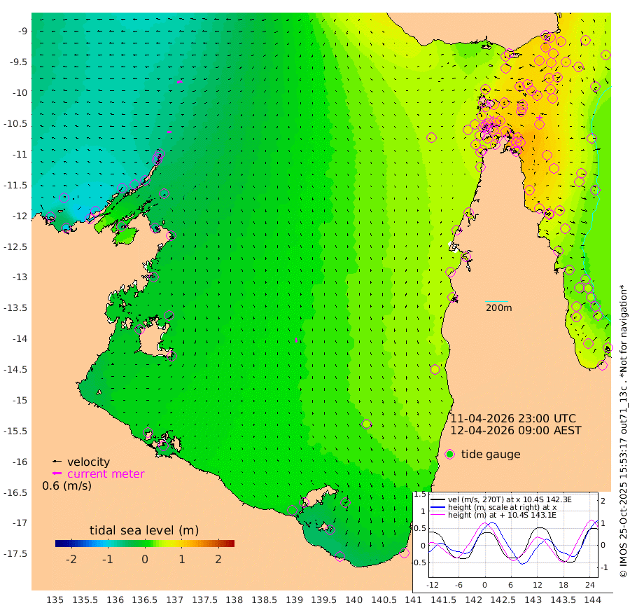 27cm/s -95T +3cm/s rms + 7cm/s -42T. ARA-GOC87 57m 29cm/s 176T +3cm/s rms + 2cm/s -2T. ARA-GOC87 60m 35cm/s -99T +2cm/s rms + 3cm/s 61T. ARA-GOC87 47m 109cm Daru 99cm Bobo Island 43cm Meer Island Barge 72cm Bramble Cay 97cm Unnamed Cay 98cm Pearce Cay 87cm Stephens Island 101cm Merrie England Shoals 120cm Mutacomal Reef 72cm Darnley Island Barge 57cm East Cay 85cm Yorke Island Barge 105cm Rennel Island 97cm Aureed Island 107cm Dungeness Reef 93cm Zagai Island 107cm Yam Island 86cm Dauan Island 77cm Saibai Island 93cm Phipi Reef 109cm Warrior Reef - West 83cm Mabuiag Island Barge 100cm Half Way Island 111cm Coconut Island 110cm Dugong Islet 113cm Poll Island 113cm Kirkcaldie Reef 119cm Suarji Island 101cm Sue Islet 95cm Hawkesbury Island 120cm Alert Patches 120cm Twin Island 84cm Badu Island 116cm St Pauls (Moa Island) 99cm Kubin (Moa Island) 110cm Ince Point 105cm Thursday Island 105cm Nardana Patches 101cm Turtle Head 90cm Round Island 87cm Goods Island 76cm Booby Island 85cm White Rocks Area 55cm Carpentaria 96cm Papou Point 77cm Bampfield Head 58cm Crab Island 89cm Red Wallis Island 113cm Packe Island 123cm Harrington Reef 95cm Herald Camp 33cm Sharp Point 85cm Red Island Point 97cm Possession Island 114cm Alpha Rock 122cm Frederick Point 118cm Wyborn Reef Light 120cm Tetley Island 58cm Triangle Reef 107cm Turtle Head Island 54cm Maclennan Cay 30cm Raine Island 92cm Mcsweeny Reef 81cm Collette Reef 50cm Shadwell Reef 85cm Hannibal Island 82cm Round Point 51cm Vrilya Point 72cm Cape Grenville 58cm Hicks Island 62cm Sir Charles Hardy Island 20cm Harvey Island 59cm Kay Reef 42cm Rocky Island 41cm Chapman Island 35cm Ham Reef 37cm Jubilee Reef 44cm Night Island 42cm Unnamed Reef No. 3 44cm Morris Island 30cm 1st 3 Mile Opening 39cm Creech Reef 51cm Fife Island 36cm Eden Reef 43cm Stanley Island 48cm Normanby River -89cm Yabooma Island -102cm Hutchison River -95cm Elcho Island -88cm North West Crocodile Island -66cm Cape Wessel -83cm Stevens Island -73cm Guluwuru Island -76cm Hopeful Bay -76cm Auster Point -79cm Two Island Bay -100cm Cadell Strait -46cm Mallison Island -60cm Melville Bay (Gove Harbour) -63cm Truant Island -43cm Cape Arnhem -44cm Cape Grey -27cm Hawk Island -40cm Milner Bay (Groote Eylandt) -23cm Cape Beatrice -9cm West Island -15cm Centre Island 7cm Mornington Island 6cm West Wellesley Islands -3cm Bountiful Island -40cm Albert River Mouth -51cm Sweers Island -20cm Karumba 44cm Nassau River Offshore 59cm Christmas Creek 50cm Archer River 52cm Boyd Point 53cm Weipa (Humbug Point) 40cm Pennefather River 57cm Cullen Point