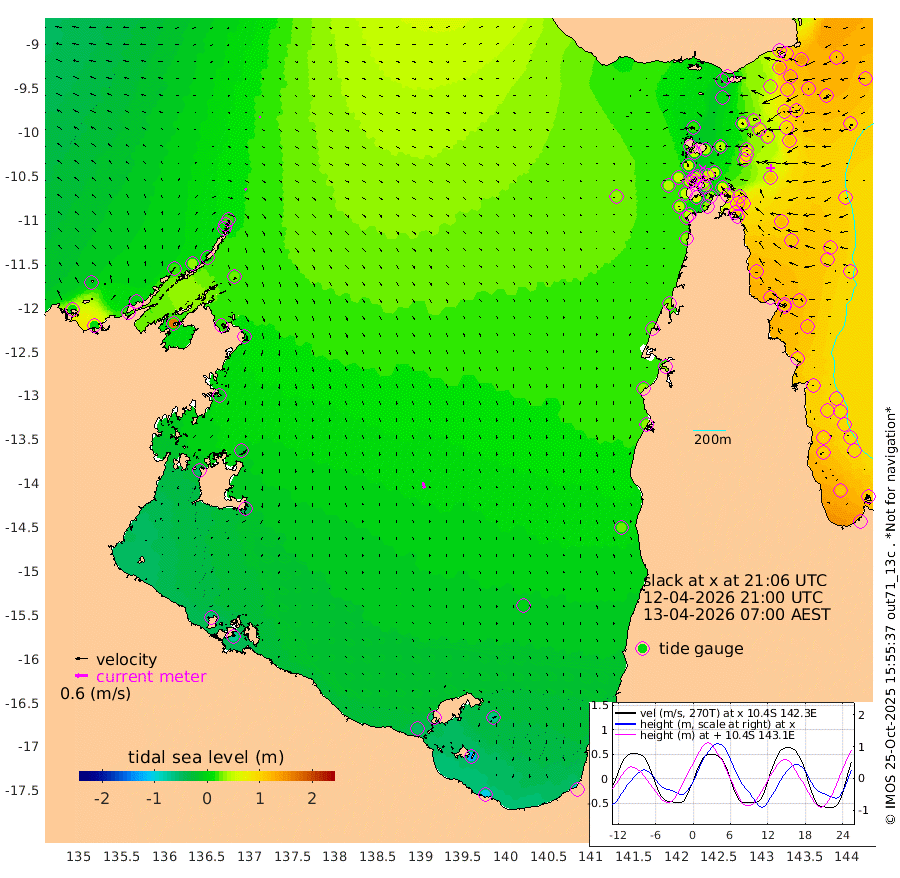 9cm/s 145T +3cm/s rms + 7cm/s -42T. ARA-GOC87 57m 29cm/s 166T +3cm/s rms + 2cm/s -2T. ARA-GOC87 60m 8cm/s -148T +2cm/s rms + 3cm/s 61T. ARA-GOC87 47m 106cm Daru 99cm Bobo Island 96cm Meer Island Barge 119cm Bramble Cay 126cm Unnamed Cay 107cm Pearce Cay 118cm Stephens Island 137cm Merrie England Shoals 124cm Mutacomal Reef 110cm Darnley Island Barge 106cm East Cay 103cm Yorke Island Barge 110cm Rennel Island 92cm Aureed Island 86cm Dungeness Reef 40cm Zagai Island 54cm Yam Island 7cm Dauan Island 6cm Saibai Island 5cm Phipi Reef 44cm Warrior Reef - West 16cm Mabuiag Island Barge 110cm Half Way Island 88cm Coconut Island 107cm Dugong Islet 72cm Poll Island 83cm Kirkcaldie Reef 38cm Suarji Island 69cm Sue Islet 55cm Hawkesbury Island 56cm Alert Patches 57cm Twin Island 34cm Badu Island 43cm St Pauls (Moa Island) 49cm Kubin (Moa Island) 46cm Ince Point 44cm Thursday Island 43cm Nardana Patches 47cm Turtle Head 39cm Round Island 50cm Goods Island 44cm Booby Island 49cm White Rocks Area 34cm Carpentaria 37cm Papou Point 45cm Bampfield Head 30cm Crab Island 49cm Red Wallis Island 61cm Packe Island 105cm Harrington Reef 50cm Herald Camp 5cm Sharp Point 34cm Red Island Point 35cm Possession Island 69cm Alpha Rock 78cm Frederick Point 112cm Wyborn Reef Light 104cm Tetley Island 84cm Triangle Reef 112cm Turtle Head Island 94cm Maclennan Cay 84cm Raine Island 114cm Mcsweeny Reef 112cm Collette Reef 96cm Shadwell Reef 125cm Hannibal Island 125cm Round Point 33cm Vrilya Point 118cm Cape Grenville 104cm Hicks Island 114cm Sir Charles Hardy Island 34cm Harvey Island 118cm Kay Reef 96cm Rocky Island 94cm Chapman Island 90cm Ham Reef 94cm Jubilee Reef 87cm Night Island 94cm Unnamed Reef No. 3 101cm Morris Island 89cm 1st 3 Mile Opening 95cm Creech Reef 102cm Fife Island 111cm Eden Reef 109cm Stanley Island 116cm Normanby River 9cm Yabooma Island 4cm Hutchison River -6cm Elcho Island -9cm North West Crocodile Island 19cm Cape Wessel 18cm Stevens Island 33cm Guluwuru Island 13cm Hopeful Bay 10cm Auster Point 14cm Two Island Bay 19cm Cadell Strait 167cm Mallison Island 22cm Melville Bay (Gove Harbour) 26cm Truant Island 12cm Cape Arnhem -11cm Cape Grey -20cm Hawk Island -47cm Milner Bay (Groote Eylandt) -42cm Cape Beatrice -57cm West Island -68cm Centre Island -54cm Mornington Island -45cm West Wellesley Islands -62cm Bountiful Island -104cm Albert River Mouth -123cm Sweers Island -101cm Karumba -7cm Nassau River Offshore 24cm Christmas Creek 32cm Archer River 36cm Boyd Point 37cm Weipa (Humbug Point) 28cm Pennefather River 32cm Cullen Point