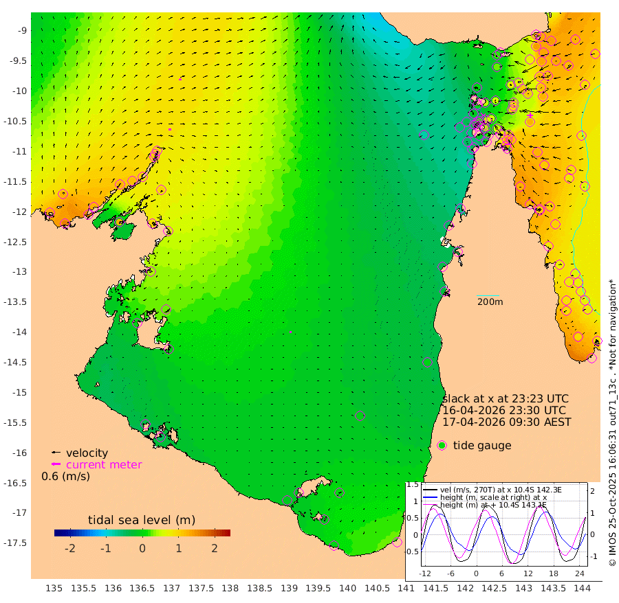 16cm/s 92T +3cm/s rms + 7cm/s -42T. ARA-GOC87 57m 12cm/s -171T +3cm/s rms + 2cm/s -2T. ARA-GOC87 60m 15cm/s 74T +2cm/s rms + 3cm/s 61T. ARA-GOC87 47m 129cm Daru 131cm Bobo Island 90cm Meer Island Barge 122cm Bramble Cay 135cm Unnamed Cay 134cm Pearce Cay 131cm Stephens Island 139cm Merrie England Shoals 136cm Mutacomal Reef 117cm Darnley Island Barge 102cm East Cay 119cm Yorke Island Barge 127cm Rennel Island 115cm Aureed Island 110cm Dungeness Reef 68cm Zagai Island 77cm Yam Island 15cm Dauan Island 11cm Saibai Island 28cm Phipi Reef 72cm Warrior Reef - West 4cm Mabuiag Island Barge 127cm Half Way Island 108cm Coconut Island 125cm Dugong Islet 93cm Poll Island 101cm Kirkcaldie Reef 57cm Suarji Island 83cm Sue Islet -13cm Hawkesbury Island 49cm Alert Patches 60cm Twin Island -17cm Badu Island 51cm St Pauls (Moa Island) 7cm Kubin (Moa Island) 29cm Ince Point 13cm Thursday Island 16cm Nardana Patches 0cm Turtle Head -17cm Round Island -24cm Goods Island -56cm Booby Island -38cm White Rocks Area -82cm Carpentaria 49cm Papou Point -64cm Bampfield Head -58cm Crab Island -48cm Red Wallis Island -8cm Packe Island 129cm Harrington Reef -38cm Herald Camp 9cm Sharp Point 4cm Red Island Point 19cm Possession Island 65cm Alpha Rock 90cm Frederick Point 127cm Wyborn Reef Light 119cm Tetley Island 76cm Triangle Reef 135cm Turtle Head Island 87cm Maclennan Cay 65cm Raine Island 122cm Mcsweeny Reef 111cm Collette Reef 82cm Shadwell Reef 127cm Hannibal Island 124cm Round Point -67cm Vrilya Point 107cm Cape Grenville 102cm Hicks Island 100cm Sir Charles Hardy Island 33cm Harvey Island 98cm Kay Reef 81cm Rocky Island 68cm Chapman Island 66cm Ham Reef 77cm Jubilee Reef 71cm Night Island 68cm Unnamed Reef No. 3 85cm Morris Island 69cm 1st 3 Mile Opening 75cm Creech Reef 86cm Fife Island 93cm Eden Reef 85cm Stanley Island 105cm Normanby River 129cm Yabooma Island 160cm Hutchison River 125cm Elcho Island 124cm North West Crocodile Island 97cm Cape Wessel 127cm Stevens Island 116cm Guluwuru Island 104cm Hopeful Bay 98cm Auster Point 110cm Two Island Bay 159cm Cadell Strait 126cm Mallison Island 100cm Melville Bay (Gove Harbour) 101cm Truant Island 62cm Cape Arnhem 44cm Cape Grey 27cm Hawk Island -5cm Milner Bay (Groote Eylandt) -2cm Cape Beatrice -32cm West Island -48cm Centre Island -14cm Mornington Island -13cm West Wellesley Islands 7cm Bountiful Island -1cm Albert River Mouth -12cm Sweers Island -4cm Karumba -1cm Nassau River Offshore -7cm Christmas Creek -27cm Archer River -34cm Boyd Point -34cm Weipa (Humbug Point) -48cm Pennefather River -63cm Cullen Point