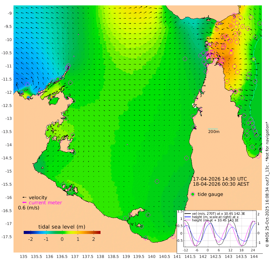 12cm/s 72T +3cm/s rms + 7cm/s -42T. ARA-GOC87 57m 8cm/s 101T +3cm/s rms + 2cm/s -2T. ARA-GOC87 60m 9cm/s 44T +2cm/s rms + 3cm/s 61T. ARA-GOC87 47m 115cm Daru 106cm Bobo Island 21cm Meer Island Barge 44cm Bramble Cay 86cm Unnamed Cay 80cm Pearce Cay 68cm Stephens Island 79cm Merrie England Shoals 111cm Mutacomal Reef 66cm Darnley Island Barge 19cm East Cay 92cm Yorke Island Barge 89cm Rennel Island 98cm Aureed Island 110cm Dungeness Reef 143cm Zagai Island 129cm Yam Island 120cm Dauan Island 125cm Saibai Island 135cm Phipi Reef 141cm Warrior Reef - West 93cm Mabuiag Island Barge 86cm Half Way Island 122cm Coconut Island 99cm Dugong Islet 122cm Poll Island 117cm Kirkcaldie Reef 141cm Suarji Island 127cm Sue Islet -5cm Hawkesbury Island 120cm Alert Patches 120cm Twin Island 27cm Badu Island 131cm St Pauls (Moa Island) 36cm Kubin (Moa Island) 92cm Ince Point 73cm Thursday Island 79cm Nardana Patches 43cm Turtle Head 37cm Round Island -8cm Goods Island -31cm Booby Island -27cm White Rocks Area -14cm Carpentaria 107cm Papou Point 7cm Bampfield Head -25cm Crab Island -27cm Red Wallis Island 16cm Packe Island 118cm Harrington Reef 4cm Herald Camp 49cm Sharp Point 32cm Red Island Point 92cm Possession Island 117cm Alpha Rock 121cm Frederick Point 121cm Wyborn Reef Light 126cm Tetley Island 34cm Triangle Reef 109cm Turtle Head Island 21cm Maclennan Cay -5cm Raine Island 78cm Mcsweeny Reef 69cm Collette Reef 30cm Shadwell Reef 71cm Hannibal Island 42cm Round Point -29cm Vrilya Point 36cm Cape Grenville 28cm Hicks Island 26cm Sir Charles Hardy Island 12cm Harvey Island 16cm Kay Reef 4cm Rocky Island -5cm Chapman Island -5cm Ham Reef 2cm Jubilee Reef 7cm Night Island -5cm Unnamed Reef No. 3 1cm Morris Island 1cm 1st 3 Mile Opening 1cm Creech Reef -2cm Fife Island -12cm Eden Reef -1cm Stanley Island -7cm Normanby River -134cm Yabooma Island -128cm Hutchison River -125cm Elcho Island -129cm North West Crocodile Island -45cm Cape Wessel -86cm Stevens Island 4cm Guluwuru Island -88cm Hopeful Bay -60cm Auster Point -71cm Two Island Bay -86cm Cadell Strait 106cm Mallison Island -6cm Melville Bay (Gove Harbour) -2cm Truant Island 12cm Cape Arnhem 13cm Cape Grey 16cm Hawk Island 12cm Milner Bay (Groote Eylandt) 3cm Cape Beatrice 12cm West Island 20cm Centre Island 17cm Mornington Island 10cm West Wellesley Islands -2cm Bountiful Island -26cm Albert River Mouth -11cm Sweers Island -19cm Karumba -3cm Nassau River Offshore 0cm Christmas Creek -17cm Archer River -11cm Boyd Point -27cm Weipa (Humbug Point) -13cm Pennefather River -23cm Cullen Point