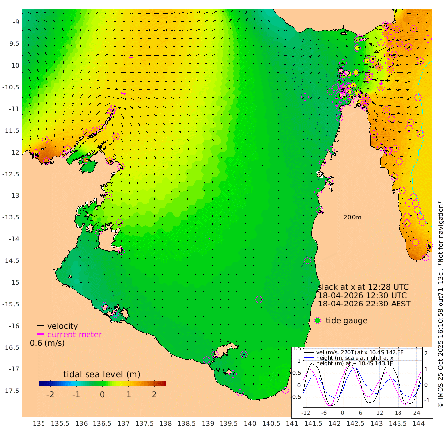 41cm/s 107T +3cm/s rms + 7cm/s -42T. ARA-GOC87 57m 4cm/s 179T +3cm/s rms + 2cm/s -2T. ARA-GOC87 60m 38cm/s 95T +2cm/s rms + 3cm/s 61T. ARA-GOC87 47m 142cm Daru 148cm Bobo Island 107cm Meer Island Barge 131cm Bramble Cay 142cm Unnamed Cay 150cm Pearce Cay 144cm Stephens Island 144cm Merrie England Shoals 136cm Mutacomal Reef 132cm Darnley Island Barge 115cm East Cay 131cm Yorke Island Barge 138cm Rennel Island 134cm Aureed Island 127cm Dungeness Reef 90cm Zagai Island 83cm Yam Island 34cm Dauan Island 18cm Saibai Island 65cm Phipi Reef 87cm Warrior Reef - West 13cm Mabuiag Island Barge 135cm Half Way Island 133cm Coconut Island 128cm Dugong Islet 106cm Poll Island 111cm Kirkcaldie Reef 83cm Suarji Island 90cm Sue Islet 0cm Hawkesbury Island 74cm Alert Patches 79cm Twin Island 14cm Badu Island 70cm St Pauls (Moa Island) 29cm Kubin (Moa Island) 49cm Ince Point 35cm Thursday Island 38cm Nardana Patches 30cm Turtle Head 24cm Round Island 9cm Goods Island -18cm Booby Island -9cm White Rocks Area -44cm Carpentaria 66cm Papou Point 9cm Bampfield Head -12cm Crab Island -18cm Red Wallis Island 20cm Packe Island 142cm Harrington Reef -3cm Herald Camp 10cm Sharp Point 21cm Red Island Point 59cm Possession Island 69cm Alpha Rock 105cm Frederick Point 138cm Wyborn Reef Light 129cm Tetley Island 92cm Triangle Reef 156cm Turtle Head Island 99cm Maclennan Cay 87cm Raine Island 133cm Mcsweeny Reef 126cm Collette Reef 99cm Shadwell Reef 141cm Hannibal Island 135cm Round Point -26cm Vrilya Point 116cm Cape Grenville 117cm Hicks Island 106cm Sir Charles Hardy Island 37cm Harvey Island 105cm Kay Reef 93cm Rocky Island 84cm Chapman Island 78cm Ham Reef 90cm Jubilee Reef 89cm Night Island 82cm Unnamed Reef No. 3 101cm Morris Island 94cm 1st 3 Mile Opening 93cm Creech Reef 100cm Fife Island 111cm Eden Reef 98cm Stanley Island 110cm Normanby River 105cm Yabooma Island 152cm Hutchison River 112cm Elcho Island 97cm North West Crocodile Island 93cm Cape Wessel 118cm Stevens Island 132cm Guluwuru Island 97cm Hopeful Bay 103cm Auster Point 101cm Two Island Bay 154cm Cadell Strait 158cm Mallison Island 114cm Melville Bay (Gove Harbour) 122cm Truant Island 82cm Cape Arnhem 47cm Cape Grey 32cm Hawk Island -13cm Milner Bay (Groote Eylandt) -22cm Cape Beatrice -71cm West Island -68cm Centre Island -32cm Mornington Island -42cm West Wellesley Islands -47cm Bountiful Island -45cm Albert River Mouth -49cm Sweers Island -42cm Karumba -22cm Nassau River Offshore -7cm Christmas Creek -6cm Archer River -10cm Boyd Point -10cm Weipa (Humbug Point) -5cm Pennefather River -29cm Cullen Point