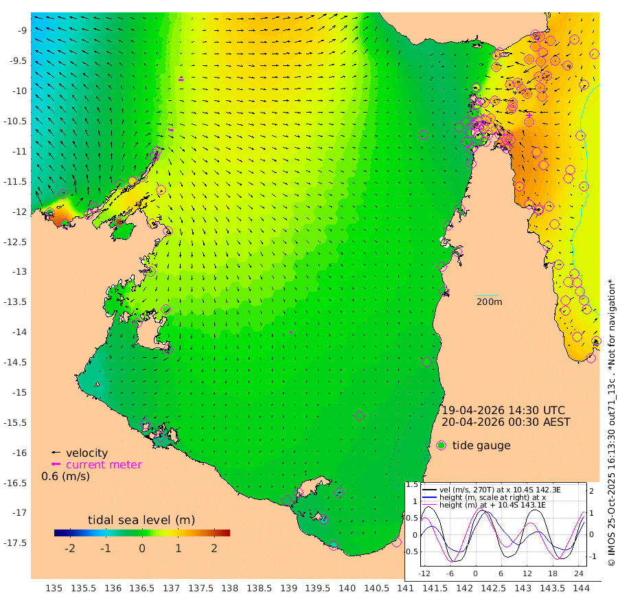 37cm/s 104T +3cm/s rms + 7cm/s -42T. ARA-GOC87 57m 17cm/s 156T +3cm/s rms + 2cm/s -2T. ARA-GOC87 60m 28cm/s 92T +2cm/s rms + 3cm/s 61T. ARA-GOC87 47m 149cm Daru 148cm Bobo Island 86cm Meer Island Barge 107cm Bramble Cay 133cm Unnamed Cay 138cm Pearce Cay 128cm Stephens Island 128cm Merrie England Shoals 140cm Mutacomal Reef 124cm Darnley Island Barge 86cm East Cay 136cm Yorke Island Barge 132cm Rennel Island 139cm Aureed Island 140cm Dungeness Reef 139cm Zagai Island 126cm Yam Island 105cm Dauan Island 96cm Saibai Island 120cm Phipi Reef 139cm Warrior Reef - West 66cm Mabuiag Island Barge 132cm Half Way Island 145cm Coconut Island 136cm Dugong Islet 133cm Poll Island 134cm Kirkcaldie Reef 125cm Suarji Island 129cm Sue Islet 10cm Hawkesbury Island 109cm Alert Patches 115cm Twin Island 35cm Badu Island 117cm St Pauls (Moa Island) 48cm Kubin (Moa Island) 85cm Ince Point 68cm Thursday Island 73cm Nardana Patches 51cm Turtle Head 36cm Round Island 14cm Goods Island -12cm Booby Island -11cm White Rocks Area -16cm Carpentaria 100cm Papou Point 12cm Bampfield Head -9cm Crab Island -10cm Red Wallis Island 33cm Packe Island 147cm Harrington Reef 11cm Herald Camp 33cm Sharp Point 35cm Red Island Point 82cm Possession Island 106cm Alpha Rock 129cm Frederick Point 145cm Wyborn Reef Light 144cm Tetley Island 82cm Triangle Reef 152cm Turtle Head Island 80cm Maclennan Cay 58cm Raine Island 125cm Mcsweeny Reef 116cm Collette Reef 83cm Shadwell Reef 126cm Hannibal Island 106cm Round Point -16cm Vrilya Point 93cm Cape Grenville 91cm Hicks Island 90cm Sir Charles Hardy Island 30cm Harvey Island 77cm Kay Reef 66cm Rocky Island 57cm Chapman Island 54cm Ham Reef 66cm Jubilee Reef 65cm Night Island 56cm Unnamed Reef No. 3 69cm Morris Island 67cm 1st 3 Mile Opening 67cm Creech Reef 67cm Fife Island 73cm Eden Reef 67cm Stanley Island 70cm Normanby River -30cm Yabooma Island 1cm Hutchison River -22cm Elcho Island -34cm North West Crocodile Island 29cm Cape Wessel 7cm Stevens Island 94cm Guluwuru Island -7cm Hopeful Bay 19cm Auster Point 18cm Two Island Bay 47cm Cadell Strait 202cm Mallison Island 68cm Melville Bay (Gove Harbour) 77cm Truant Island 60cm Cape Arnhem 29cm Cape Grey 16cm Hawk Island -22cm Milner Bay (Groote Eylandt) -30cm Cape Beatrice -60cm West Island -56cm Centre Island -31cm Mornington Island -38cm West Wellesley Islands -56cm Bountiful Island -77cm Albert River Mouth -84cm Sweers Island -75cm Karumba -18cm Nassau River Offshore 5cm Christmas Creek -1cm Archer River 5cm Boyd Point -5cm Weipa (Humbug Point) 1cm Pennefather River -14cm Cullen Point
