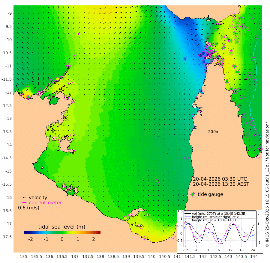 23cm/s 43T +3cm/s rms + 7cm/s -42T. ARA-GOC87 57m 8cm/s -8T +3cm/s rms + 2cm/s -2T. ARA-GOC87 60m 28cm/s 35T +2cm/s rms + 3cm/s 61T. ARA-GOC87 47m 33cm Daru 35cm Bobo Island -11cm Meer Island Barge 0cm Bramble Cay 18cm Unnamed Cay 18cm Pearce Cay 12cm Stephens Island 13cm Merrie England Shoals 28cm Mutacomal Reef 16cm Darnley Island Barge -17cm East Cay 29cm Yorke Island Barge 15cm Rennel Island 27cm Aureed Island 20cm Dungeness Reef 40cm Zagai Island 27cm Yam Island 9cm Dauan Island 23cm Saibai Island 4cm Phipi Reef 37cm Warrior Reef - West -24cm Mabuiag Island Barge 20cm Half Way Island 20cm Coconut Island 25cm Dugong Islet 22cm Poll Island 17cm Kirkcaldie Reef 5cm Suarji Island 33cm Sue Islet -142cm Hawkesbury Island -19cm Alert Patches -7cm Twin Island -123cm Badu Island 2cm St Pauls (Moa Island) -98cm Kubin (Moa Island) -40cm Ince Point -65cm Thursday Island -57cm Nardana Patches -102cm Turtle Head -119cm Round Island -155cm Goods Island -185cm Booby Island -176cm White Rocks Area -151cm Carpentaria -4cm Papou Point -193cm Bampfield Head -159cm Crab Island -172cm Red Wallis Island -132cm Packe Island 23cm Harrington Reef -158cm Herald Camp 15cm Sharp Point -90cm Red Island Point -51cm Possession Island 11cm Alpha Rock 8cm Frederick Point 28cm Wyborn Reef Light 28cm Tetley Island -11cm Triangle Reef 17cm Turtle Head Island -18cm Maclennan Cay -38cm Raine Island 13cm Mcsweeny Reef 8cm Collette Reef -14cm Shadwell Reef 11cm Hannibal Island -9cm Round Point -150cm Vrilya Point -12cm Cape Grenville -15cm Hicks Island -18cm Sir Charles Hardy Island -2cm Harvey Island -23cm Kay Reef -28cm Rocky Island -39cm Chapman Island -33cm Ham Reef -27cm Jubilee Reef -26cm Night Island -37cm Unnamed Reef No. 3 -31cm Morris Island -38cm 1st 3 Mile Opening -32cm Creech Reef -28cm Fife Island -34cm Eden Reef -32cm Stanley Island -26cm Normanby River -27cm Yabooma Island -13cm Hutchison River -14cm Elcho Island -12cm North West Crocodile Island 30cm Cape Wessel 11cm Stevens Island 72cm Guluwuru Island 0cm Hopeful Bay 14cm Auster Point 28cm Two Island Bay 41cm Cadell Strait 162cm Mallison Island 52cm Melville Bay (Gove Harbour) 53cm Truant Island 46cm Cape Arnhem 48cm Cape Grey 47cm Hawk Island 50cm Milner Bay (Groote Eylandt) 46cm Cape Beatrice 51cm West Island 45cm Centre Island 47cm Mornington Island 48cm West Wellesley Islands 48cm Bountiful Island 74cm Albert River Mouth 88cm Sweers Island 59cm Karumba -3cm Nassau River Offshore -44cm Christmas Creek -90cm Archer River -95cm Boyd Point -116cm Weipa (Humbug Point) -104cm Pennefather River -135cm Cullen Point
