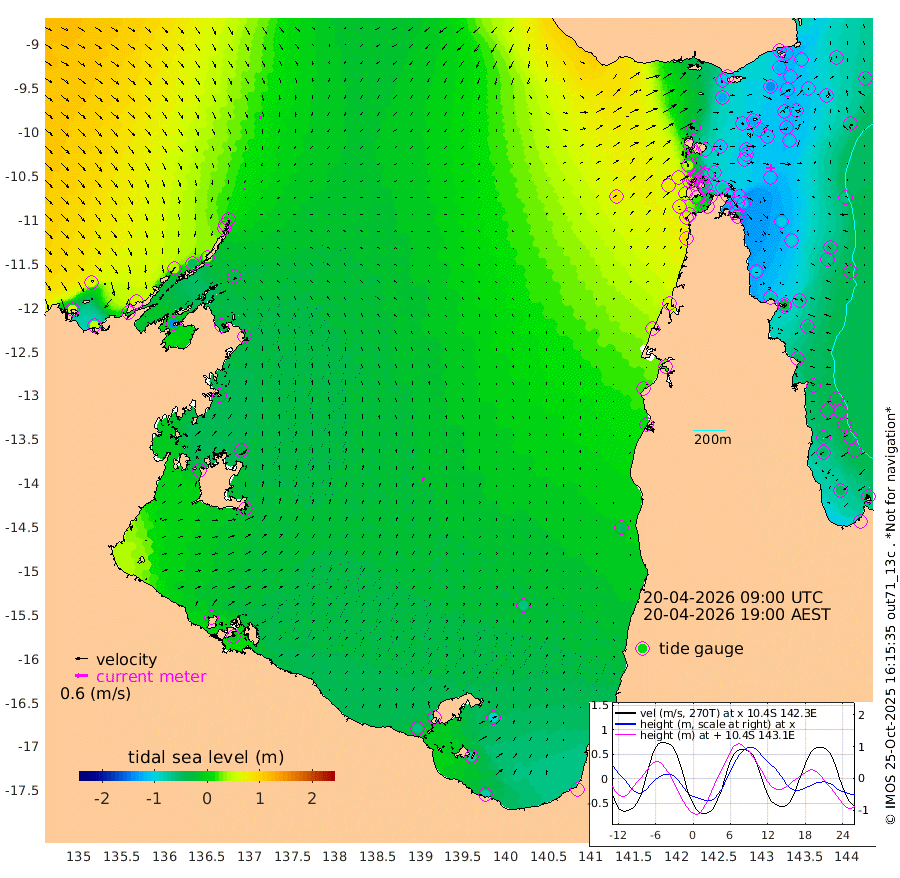 7cm/s -149T +3cm/s rms + 7cm/s -42T. ARA-GOC87 57m 23cm/s 8T +3cm/s rms + 2cm/s -2T. ARA-GOC87 60m 13cm/s 173T +2cm/s rms + 3cm/s 61T. ARA-GOC87 47m -123cm Daru -118cm Bobo Island -64cm Meer Island Barge -81cm Bramble Cay -107cm Unnamed Cay -107cm Pearce Cay -99cm Stephens Island -97cm Merrie England Shoals -115cm Mutacomal Reef -99cm Darnley Island Barge -62cm East Cay -112cm Yorke Island Barge -103cm Rennel Island -115cm Aureed Island -118cm Dungeness Reef -122cm Zagai Island -112cm Yam Island -112cm Dauan Island -104cm Saibai Island -127cm Phipi Reef -135cm Warrior Reef - West -50cm Mabuiag Island Barge -102cm Half Way Island -110cm Coconut Island -112cm Dugong Islet -109cm Poll Island -105cm Kirkcaldie Reef -110cm Suarji Island -110cm Sue Islet 43cm Hawkesbury Island -79cm Alert Patches -83cm Twin Island 17cm Badu Island -92cm St Pauls (Moa Island) -4cm Kubin (Moa Island) -52cm Ince Point -29cm Thursday Island -37cm Nardana Patches -9cm Turtle Head 12cm Round Island 41cm Goods Island 80cm Booby Island 74cm White Rocks Area 90cm Carpentaria -67cm Papou Point 68cm Bampfield Head 79cm Crab Island 74cm Red Wallis Island 17cm Packe Island -112cm Harrington Reef 34cm Herald Camp -32cm Sharp Point 7cm Red Island Point -44cm Possession Island -82cm Alpha Rock -97cm Frederick Point -111cm Wyborn Reef Light -110cm Tetley Island -62cm Triangle Reef -103cm Turtle Head Island -59cm Maclennan Cay -33cm Raine Island -98cm Mcsweeny Reef -90cm Collette Reef -62cm Shadwell Reef -98cm Hannibal Island -76cm Round Point 90cm Vrilya Point -69cm Cape Grenville -67cm Hicks Island -75cm Sir Charles Hardy Island -23cm Harvey Island -54cm Kay Reef -49cm Rocky Island -38cm Chapman Island -36cm Ham Reef -44cm Jubilee Reef -45cm Night Island -33cm Unnamed Reef No. 3 -47cm Morris Island -42cm 1st 3 Mile Opening -44cm Creech Reef -45cm Fife Island -50cm Eden Reef -44cm Stanley Island -48cm Normanby River 64cm Yabooma Island 45cm Hutchison River 59cm Elcho Island 61cm North West Crocodile Island 15cm Cape Wessel 40cm Stevens Island -51cm Guluwuru Island 39cm Hopeful Bay 26cm Auster Point 22cm Two Island Bay 4cm Cadell Strait -138cm Mallison Island -37cm Melville Bay (Gove Harbour) -34cm Truant Island -36cm Cape Arnhem -31cm Cape Grey -34cm Hawk Island -13cm Milner Bay (Groote Eylandt) -16cm Cape Beatrice -14cm West Island -10cm Centre Island -68cm Mornington Island -65cm West Wellesley Islands -94cm Bountiful Island -76cm Albert River Mouth -79cm Sweers Island -76cm Karumba -64cm Nassau River Offshore -50cm Christmas Creek 5cm Archer River 15cm Boyd Point 19cm Weipa (Humbug Point) 51cm Pennefather River 62cm Cullen Point