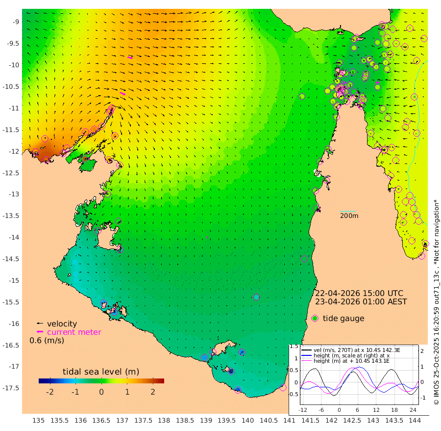 54cm/s 113T +3cm/s rms + 7cm/s -42T. ARA-GOC87 57m 14cm/s 152T +3cm/s rms + 2cm/s -2T. ARA-GOC87 60m 49cm/s 106T +2cm/s rms + 3cm/s 61T. ARA-GOC87 47m 39cm Daru 52cm Bobo Island 58cm Meer Island Barge 53cm Bramble Cay 41cm Unnamed Cay 59cm Pearce Cay 51cm Stephens Island 36cm Merrie England Shoals 29cm Mutacomal Reef 54cm Darnley Island Barge 57cm East Cay 48cm Yorke Island Barge 39cm Rennel Island 48cm Aureed Island 38cm Dungeness Reef 38cm Zagai Island 30cm Yam Island 41cm Dauan Island 36cm Saibai Island 31cm Phipi Reef 37cm Warrior Reef - West 24cm Mabuiag Island Barge 40cm Half Way Island 40cm Coconut Island 35cm Dugong Islet 31cm Poll Island 27cm Kirkcaldie Reef 18cm Suarji Island 27cm Sue Islet 57cm Hawkesbury Island 19cm Alert Patches 26cm Twin Island 60cm Badu Island 24cm St Pauls (Moa Island) 50cm Kubin (Moa Island) 26cm Ince Point 29cm Thursday Island 28cm Nardana Patches 40cm Turtle Head 41cm Round Island 56cm Goods Island 54cm Booby Island 48cm White Rocks Area 37cm Carpentaria 31cm Papou Point 62cm Bampfield Head 45cm Crab Island 48cm Red Wallis Island 47cm Packe Island 32cm Harrington Reef 46cm Herald Camp -7cm Sharp Point 36cm Red Island Point 27cm Possession Island 14cm Alpha Rock 30cm Frederick Point 37cm Wyborn Reef Light 35cm Tetley Island 51cm Triangle Reef 51cm Turtle Head Island 52cm Maclennan Cay 55cm Raine Island 42cm Mcsweeny Reef 42cm Collette Reef 47cm Shadwell Reef 46cm Hannibal Island 53cm Round Point 34cm Vrilya Point 42cm Cape Grenville 54cm Hicks Island 61cm Sir Charles Hardy Island 14cm Harvey Island 47cm Kay Reef 53cm Rocky Island 58cm Chapman Island 54cm Ham Reef 55cm Jubilee Reef 46cm Night Island 53cm Unnamed Reef No. 3 54cm Morris Island 57cm 1st 3 Mile Opening 55cm Creech Reef 50cm Fife Island 70cm Eden Reef 51cm Stanley Island 56cm Normanby River 141cm Yabooma Island 179cm Hutchison River 140cm Elcho Island 125cm North West Crocodile Island 130cm Cape Wessel 139cm Stevens Island 153cm Guluwuru Island 120cm Hopeful Bay 128cm Auster Point 135cm Two Island Bay 192cm Cadell Strait 189cm Mallison Island 124cm Melville Bay (Gove Harbour) 139cm Truant Island 87cm Cape Arnhem 31cm Cape Grey 1cm Hawk Island -54cm Milner Bay (Groote Eylandt) -70cm Cape Beatrice -134cm West Island -132cm Centre Island -123cm Mornington Island -128cm West Wellesley Islands -137cm Bountiful Island -158cm Albert River Mouth -179cm Sweers Island -160cm Karumba -79cm Nassau River Offshore -32cm Christmas Creek 7cm Archer River 23cm Boyd Point 25cm Weipa (Humbug Point) 19cm Pennefather River 30cm Cullen Point