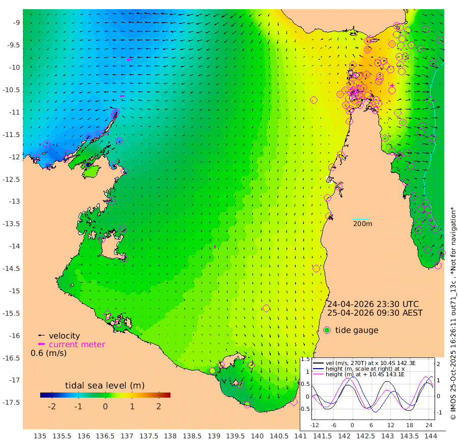 42cm/s -94T +3cm/s rms + 7cm/s -42T. ARA-GOC87 57m 26cm/s -176T +3cm/s rms + 2cm/s -2T. ARA-GOC87 60m 49cm/s -100T +2cm/s rms + 3cm/s 61T. ARA-GOC87 47m 73cm Daru 50cm Bobo Island -8cm Meer Island Barge 12cm Bramble Cay 45cm Unnamed Cay 45cm Pearce Cay 32cm Stephens Island 44cm Merrie England Shoals 75cm Mutacomal Reef 18cm Darnley Island Barge -3cm East Cay 41cm Yorke Island Barge 60cm Rennel Island 49cm Aureed Island 85cm Dungeness Reef 94cm Zagai Island 112cm Yam Island 122cm Dauan Island 104cm Saibai Island 135cm Phipi Reef 113cm Warrior Reef - West 115cm Mabuiag Island Barge 61cm Half Way Island 79cm Coconut Island 77cm Dugong Islet 99cm Poll Island 107cm Kirkcaldie Reef 123cm Suarji Island 91cm Sue Islet 125cm Hawkesbury Island 130cm Alert Patches 123cm Twin Island 126cm Badu Island 133cm St Pauls (Moa Island) 122cm Kubin (Moa Island) 128cm Ince Point 129cm Thursday Island 129cm Nardana Patches 128cm Turtle Head 110cm Round Island 118cm Goods Island 113cm Booby Island 113cm White Rocks Area 76cm Carpentaria 108cm Papou Point 87cm Bampfield Head 98cm Crab Island 117cm Red Wallis Island 130cm Packe Island 86cm Harrington Reef 116cm Herald Camp 44cm Sharp Point 116cm Red Island Point 108cm Possession Island 104cm Alpha Rock 106cm Frederick Point 72cm Wyborn Reef Light 81cm Tetley Island 11cm Triangle Reef 69cm Turtle Head Island 6cm Maclennan Cay -15cm Raine Island 41cm Mcsweeny Reef 29cm Collette Reef 3cm Shadwell Reef 27cm Hannibal Island 15cm Round Point 91cm Vrilya Point 14cm Cape Grenville 4cm Hicks Island 2cm Sir Charles Hardy Island 4cm Harvey Island -4cm Kay Reef -11cm Rocky Island -19cm Chapman Island -19cm Ham Reef -14cm Jubilee Reef -5cm Night Island -14cm Unnamed Reef No. 3 -12cm Morris Island -13cm 1st 3 Mile Opening -12cm Creech Reef -12cm Fife Island -30cm Eden Reef -14cm Stanley Island -19cm Normanby River -135cm Yabooma Island -154cm Hutchison River -138cm Elcho Island -121cm North West Crocodile Island -139cm Cape Wessel -145cm Stevens Island -141cm Guluwuru Island -138cm Hopeful Bay -136cm Auster Point -138cm Two Island Bay -162cm Cadell Strait -214cm Mallison Island -121cm Melville Bay (Gove Harbour) -134cm Truant Island -89cm Cape Arnhem -60cm Cape Grey -42cm Hawk Island -30cm Milner Bay (Groote Eylandt) -6cm Cape Beatrice 30cm West Island 25cm Centre Island 51cm Mornington Island 46cm West Wellesley Islands 53cm Bountiful Island 37cm Albert River Mouth 16cm Sweers Island 57cm Karumba 82cm Nassau River Offshore 87cm Christmas Creek 72cm Archer River 68cm Boyd Point 74cm Weipa (Humbug Point) 71cm Pennefather River 82cm Cullen Point