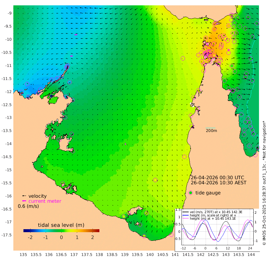 35cm/s -94T +3cm/s rms + 7cm/s -42T. ARA-GOC87 57m 23cm/s -175T +3cm/s rms + 2cm/s -2T. ARA-GOC87 60m 42cm/s -100T +2cm/s rms + 3cm/s 61T. ARA-GOC87 47m 57cm Daru 36cm Bobo Island -29cm Meer Island Barge -12cm Bramble Cay 22cm Unnamed Cay 27cm Pearce Cay 9cm Stephens Island 18cm Merrie England Shoals 55cm Mutacomal Reef -2cm Darnley Island Barge -28cm East Cay 25cm Yorke Island Barge 40cm Rennel Island 34cm Aureed Island 72cm Dungeness Reef 96cm Zagai Island 109cm Yam Island 132cm Dauan Island 114cm Saibai Island 141cm Phipi Reef 115cm Warrior Reef - West 118cm Mabuiag Island Barge 43cm Half Way Island 65cm Coconut Island 60cm Dugong Islet 91cm Poll Island 95cm Kirkcaldie Reef 117cm Suarji Island 85cm Sue Islet 112cm Hawkesbury Island 121cm Alert Patches 116cm Twin Island 118cm Badu Island 130cm St Pauls (Moa Island) 112cm Kubin (Moa Island) 121cm Ince Point 120cm Thursday Island 122cm Nardana Patches 115cm Turtle Head 97cm Round Island 100cm Goods Island 94cm Booby Island 92cm White Rocks Area 60cm Carpentaria 106cm Papou Point 63cm Bampfield Head 83cm Crab Island 99cm Red Wallis Island 113cm Packe Island 68cm Harrington Reef 97cm Herald Camp 46cm Sharp Point 106cm Red Island Point 100cm Possession Island 96cm Alpha Rock 95cm Frederick Point 55cm Wyborn Reef Light 67cm Tetley Island -7cm Triangle Reef 52cm Turtle Head Island -16cm Maclennan Cay -37cm Raine Island 20cm Mcsweeny Reef 7cm Collette Reef -19cm Shadwell Reef 2cm Hannibal Island -11cm Round Point 77cm Vrilya Point -13cm Cape Grenville -20cm Hicks Island -23cm Sir Charles Hardy Island -4cm Harvey Island -32cm Kay Reef -36cm Rocky Island -44cm Chapman Island -42cm Ham Reef -37cm Jubilee Reef -27cm Night Island -39cm Unnamed Reef No. 3 -38cm Morris Island -37cm 1st 3 Mile Opening -36cm Creech Reef -39cm Fife Island -57cm Eden Reef -42cm Stanley Island -48cm Normanby River -126cm Yabooma Island -138cm Hutchison River -124cm Elcho Island -107cm North West Crocodile Island -126cm Cape Wessel -131cm Stevens Island -125cm Guluwuru Island -129cm Hopeful Bay -124cm Auster Point -122cm Two Island Bay -140cm Cadell Strait -204cm Mallison Island -108cm Melville Bay (Gove Harbour) -120cm Truant Island -79cm Cape Arnhem -53cm Cape Grey -35cm Hawk Island -25cm Milner Bay (Groote Eylandt) -3cm Cape Beatrice 29cm West Island 25cm Centre Island 47cm Mornington Island 40cm West Wellesley Islands 45cm Bountiful Island 41cm Albert River Mouth 21cm Sweers Island 58cm Karumba 70cm Nassau River Offshore 71cm Christmas Creek 55cm Archer River 53cm Boyd Point 55cm Weipa (Humbug Point) 59cm Pennefather River 68cm Cullen Point