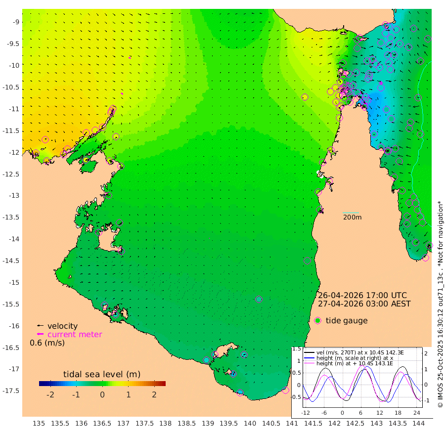 20cm/s 122T +3cm/s rms + 7cm/s -42T. ARA-GOC87 57m 4cm/s 77T +3cm/s rms + 2cm/s -2T. ARA-GOC87 60m 21cm/s 117T +2cm/s rms + 3cm/s 61T. ARA-GOC87 47m -94cm Daru -90cm Bobo Island -27cm Meer Island Barge -52cm Bramble Cay -77cm Unnamed Cay -83cm Pearce Cay -75cm Stephens Island -83cm Merrie England Shoals -94cm Mutacomal Reef -61cm Darnley Island Barge -34cm East Cay -74cm Yorke Island Barge -87cm Rennel Island -83cm Aureed Island -87cm Dungeness Reef -66cm Zagai Island -66cm Yam Island -15cm Dauan Island -9cm Saibai Island -47cm Phipi Reef -69cm Warrior Reef - West -5cm Mabuiag Island Barge -89cm Half Way Island -90cm Coconut Island -92cm Dugong Islet -82cm Poll Island -90cm Kirkcaldie Reef -75cm Suarji Island -72cm Sue Islet 57cm Hawkesbury Island -64cm Alert Patches -66cm Twin Island 41cm Badu Island -64cm St Pauls (Moa Island) 19cm Kubin (Moa Island) -35cm Ince Point -17cm Thursday Island -21cm Nardana Patches 6cm Turtle Head 35cm Round Island 50cm Goods Island 73cm Booby Island 60cm White Rocks Area 69cm Carpentaria -50cm Papou Point 88cm Bampfield Head 55cm Crab Island 61cm Red Wallis Island 26cm Packe Island -109cm Harrington Reef 67cm Herald Camp -27cm Sharp Point 2cm Red Island Point -27cm Possession Island -61cm Alpha Rock -82cm Frederick Point -87cm Wyborn Reef Light -85cm Tetley Island -26cm Triangle Reef -92cm Turtle Head Island -29cm Maclennan Cay -6cm Raine Island -75cm Mcsweeny Reef -63cm Collette Reef -28cm Shadwell Reef -70cm Hannibal Island -54cm Round Point 49cm Vrilya Point -47cm Cape Grenville -38cm Hicks Island -21cm Sir Charles Hardy Island -16cm Harvey Island -29cm Kay Reef -14cm Rocky Island 0cm Chapman Island -1cm Ham Reef -11cm Jubilee Reef -21cm Night Island -7cm Unnamed Reef No. 3 -18cm Morris Island -8cm 1st 3 Mile Opening -15cm Creech Reef -26cm Fife Island -9cm Eden Reef -18cm Stanley Island -24cm Normanby River 120cm Yabooma Island 116cm Hutchison River 106cm Elcho Island 98cm North West Crocodile Island 83cm Cape Wessel 97cm Stevens Island 61cm Guluwuru Island 98cm Hopeful Bay 85cm Auster Point 89cm Two Island Bay 96cm Cadell Strait 81cm Mallison Island 55cm Melville Bay (Gove Harbour) 63cm Truant Island 33cm Cape Arnhem 4cm Cape Grey -11cm Hawk Island -29cm Milner Bay (Groote Eylandt) -46cm Cape Beatrice -78cm West Island -76cm Centre Island -99cm Mornington Island -95cm West Wellesley Islands -86cm Bountiful Island -107cm Albert River Mouth -113cm Sweers Island -113cm Karumba -70cm Nassau River Offshore -36cm Christmas Creek 9cm Archer River 26cm Boyd Point 37cm Weipa (Humbug Point) 17cm Pennefather River 55cm Cullen Point