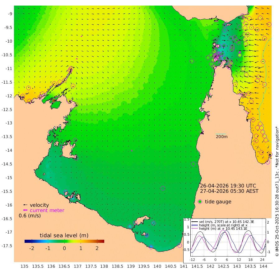21cm/s 113T +3cm/s rms + 7cm/s -42T. ARA-GOC87 57m 22cm/s 165T +3cm/s rms + 2cm/s -2T. ARA-GOC87 60m 16cm/s 109T +2cm/s rms + 3cm/s 61T. ARA-GOC87 47m 28cm Daru 40cm Bobo Island 84cm Meer Island Barge 82cm Bramble Cay 59cm Unnamed Cay 57cm Pearce Cay 68cm Stephens Island 64cm Merrie England Shoals 36cm Mutacomal Reef 71cm Darnley Island Barge 93cm East Cay 49cm Yorke Island Barge 43cm Rennel Island 39cm Aureed Island 14cm Dungeness Reef -30cm Zagai Island -23cm Yam Island -47cm Dauan Island -40cm Saibai Island -59cm Phipi Reef -28cm Warrior Reef - West -40cm Mabuiag Island Barge 42cm Half Way Island 12cm Coconut Island 31cm Dugong Islet -8cm Poll Island -2cm Kirkcaldie Reef -42cm Suarji Island -6cm Sue Islet 24cm Hawkesbury Island -31cm Alert Patches -25cm Twin Island -8cm Badu Island -41cm St Pauls (Moa Island) 2cm Kubin (Moa Island) -26cm Ince Point -21cm Thursday Island -25cm Nardana Patches -7cm Turtle Head 0cm Round Island 16cm Goods Island 20cm Booby Island 18cm White Rocks Area 16cm Carpentaria -29cm Papou Point 27cm Bampfield Head 7cm Crab Island 19cm Red Wallis Island 13cm Packe Island 21cm Harrington Reef 27cm Herald Camp -25cm Sharp Point -5cm Red Island Point -22cm Possession Island -15cm Alpha Rock -4cm Frederick Point 28cm Wyborn Reef Light 18cm Tetley Island 66cm Triangle Reef 35cm Turtle Head Island 79cm Maclennan Cay 84cm Raine Island 57cm Mcsweeny Reef 62cm Collette Reef 75cm Shadwell Reef 71cm Hannibal Island 88cm Round Point 9cm Vrilya Point 83cm Cape Grenville 84cm Hicks Island 98cm Sir Charles Hardy Island 25cm Harvey Island 97cm Kay Reef 92cm Rocky Island 99cm Chapman Island 95cm Ham Reef 91cm Jubilee Reef 78cm Night Island 95cm Unnamed Reef No. 3 94cm Morris Island 85cm 1st 3 Mile Opening 91cm Creech Reef 98cm Fife Island 116cm Eden Reef 100cm Stanley Island 112cm Normanby River 97cm Yabooma Island 98cm Hutchison River 78cm Elcho Island 71cm North West Crocodile Island 89cm Cape Wessel 88cm Stevens Island 88cm Guluwuru Island 88cm Hopeful Bay 81cm Auster Point 90cm Two Island Bay 114cm Cadell Strait 191cm Mallison Island 73cm Melville Bay (Gove Harbour) 82cm Truant Island 46cm Cape Arnhem 9cm Cape Grey -9cm Hawk Island -48cm Milner Bay (Groote Eylandt) -52cm Cape Beatrice -87cm West Island -95cm Centre Island -83cm Mornington Island -76cm West Wellesley Islands -76cm Bountiful Island -125cm Albert River Mouth -131cm Sweers Island -119cm Karumba -35cm Nassau River Offshore -1cm Christmas Creek 18cm Archer River 23cm Boyd Point 28cm Weipa (Humbug Point) 3cm Pennefather River 18cm Cullen Point
